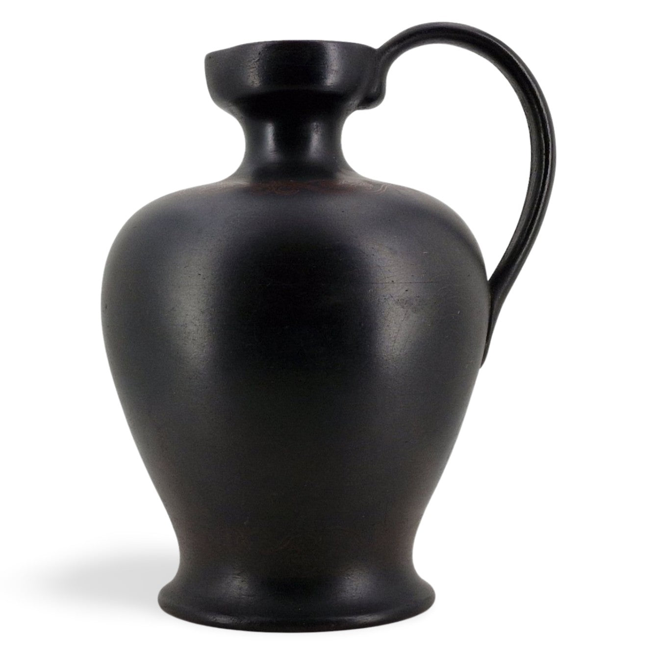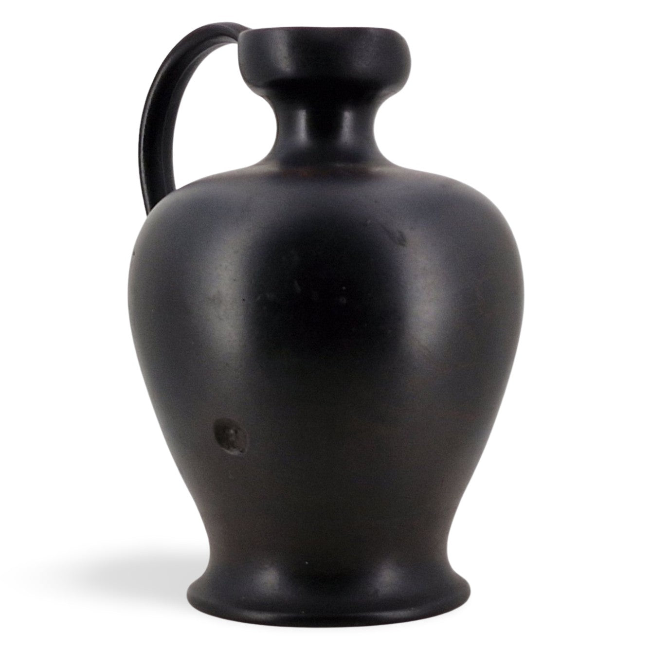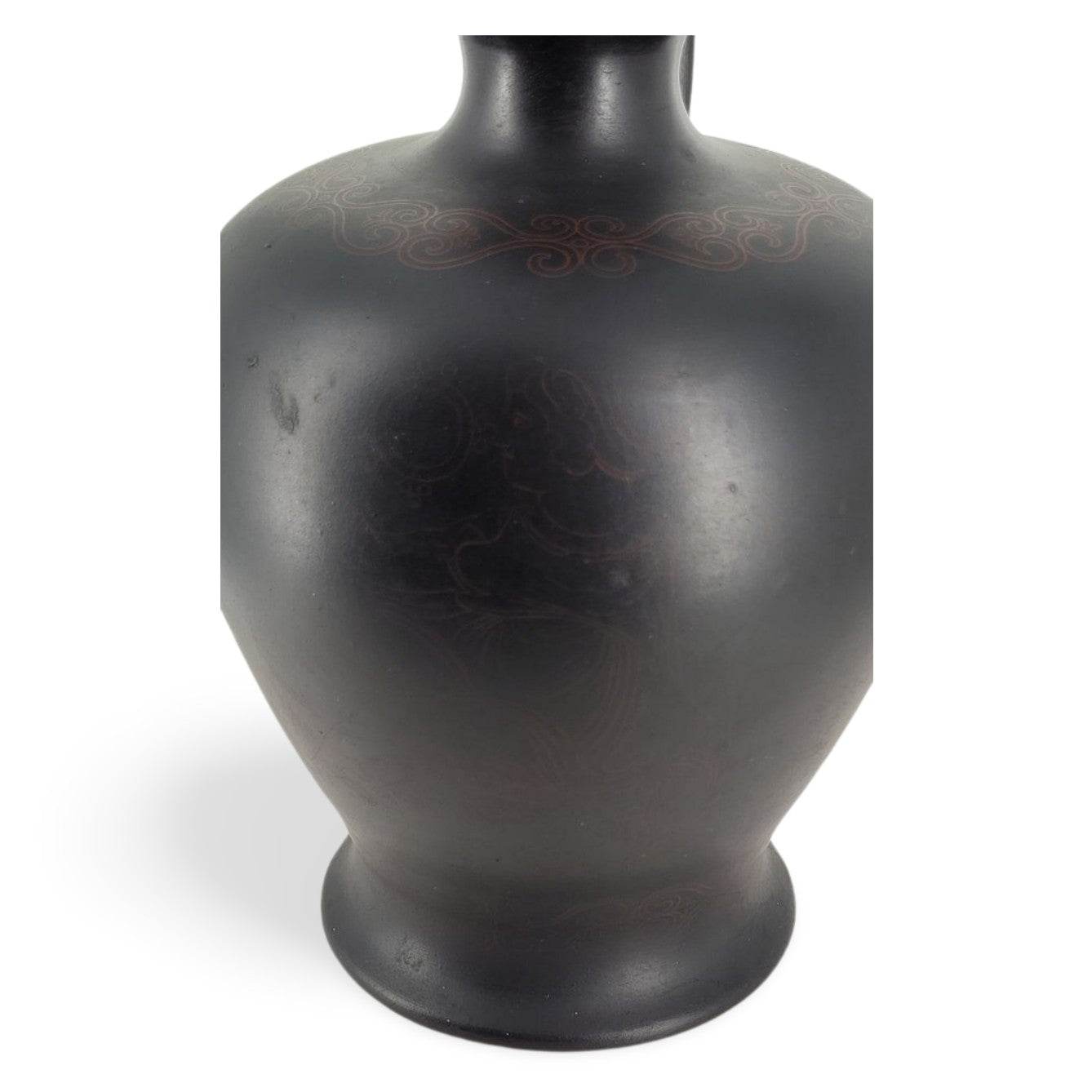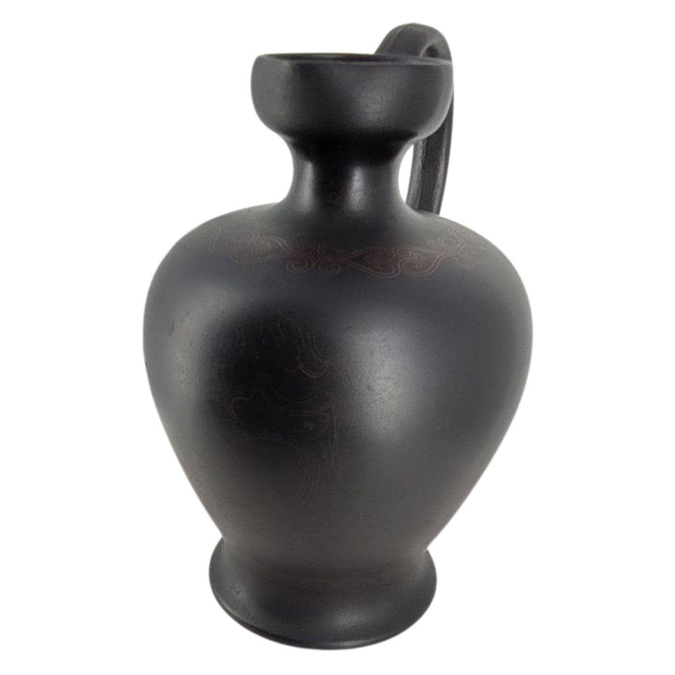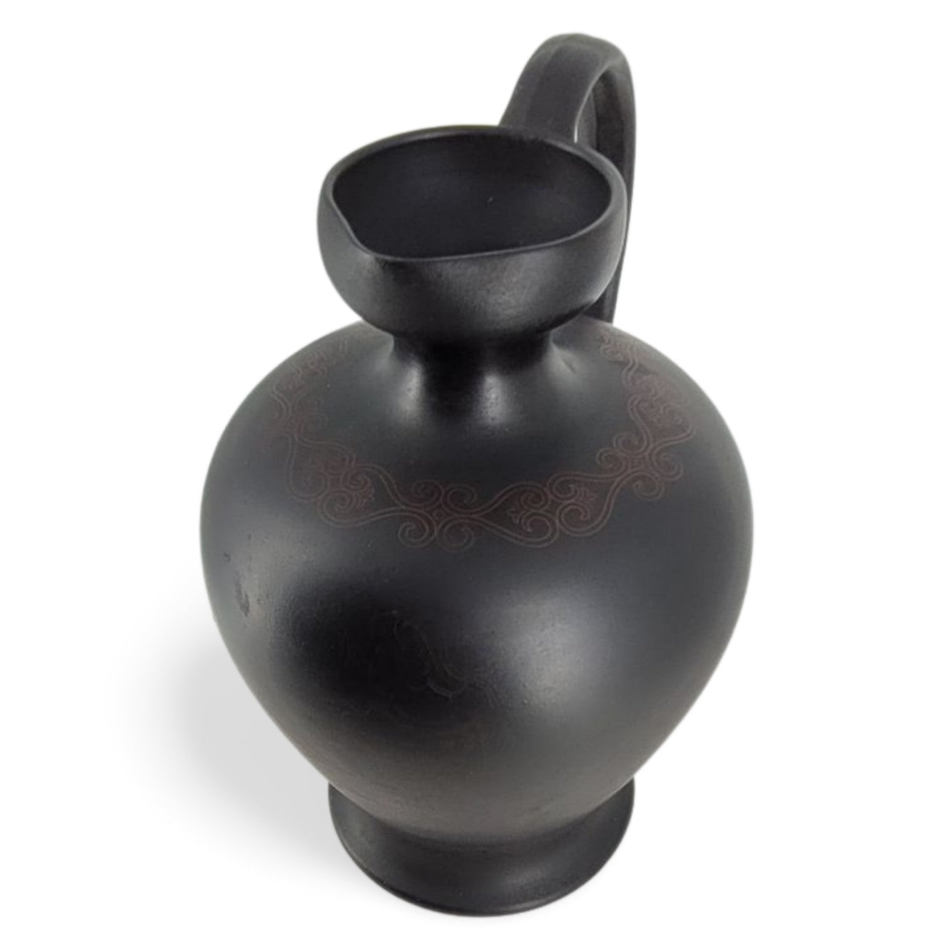An interesting basalt lekythos, with the beginnings of encaustic decoration. A transfer-printed outline of an elaborate scheme can just be seen.