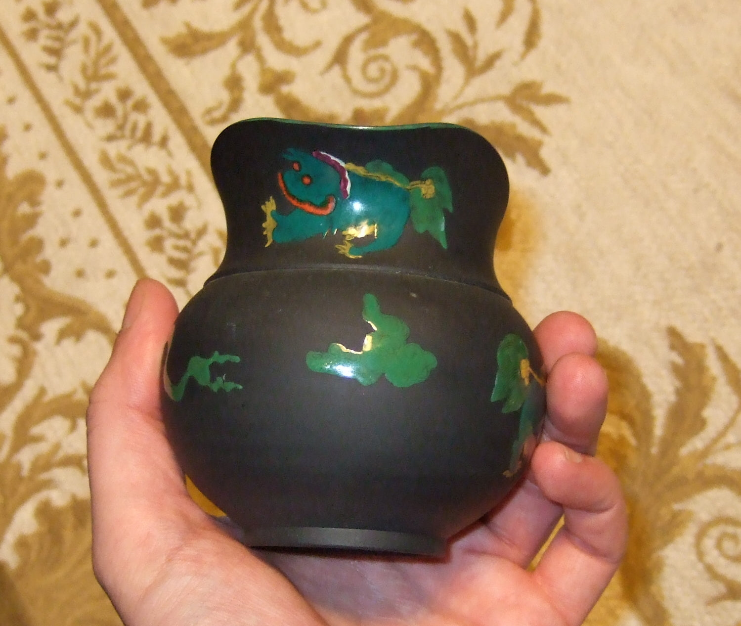 Mid sized Kenlockware creamer, 3.5” tall, with male foo lions. From about 1895-1900, the US office took plain basalt pieces and enameled them in various patterns; this is an example of Dragonware.