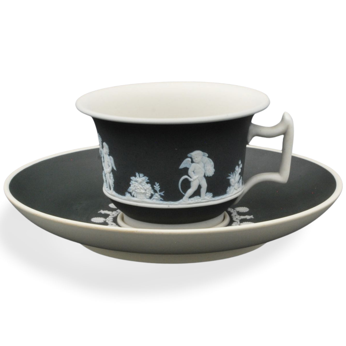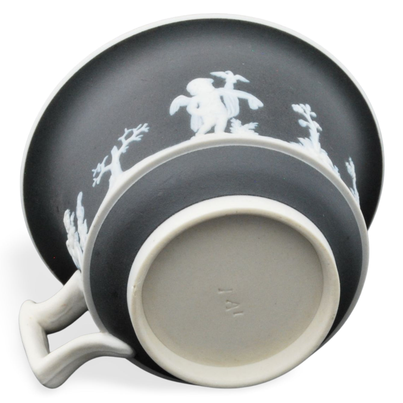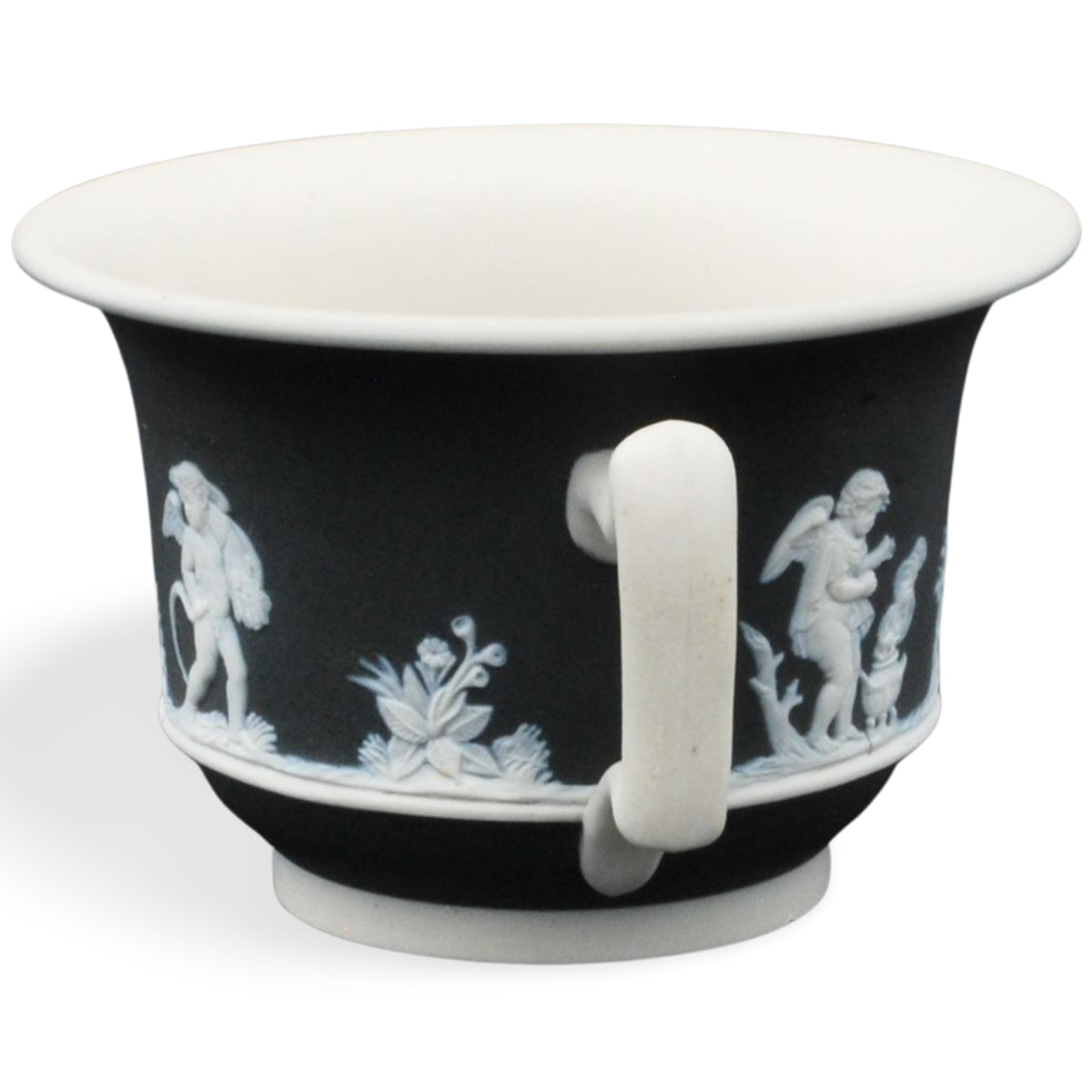 In unglazed porclain, made in imitation of Wedgwood's black jasper, even copying the figures of The Four Seasons. Made by the Sarreguemines factory in France around 1810.