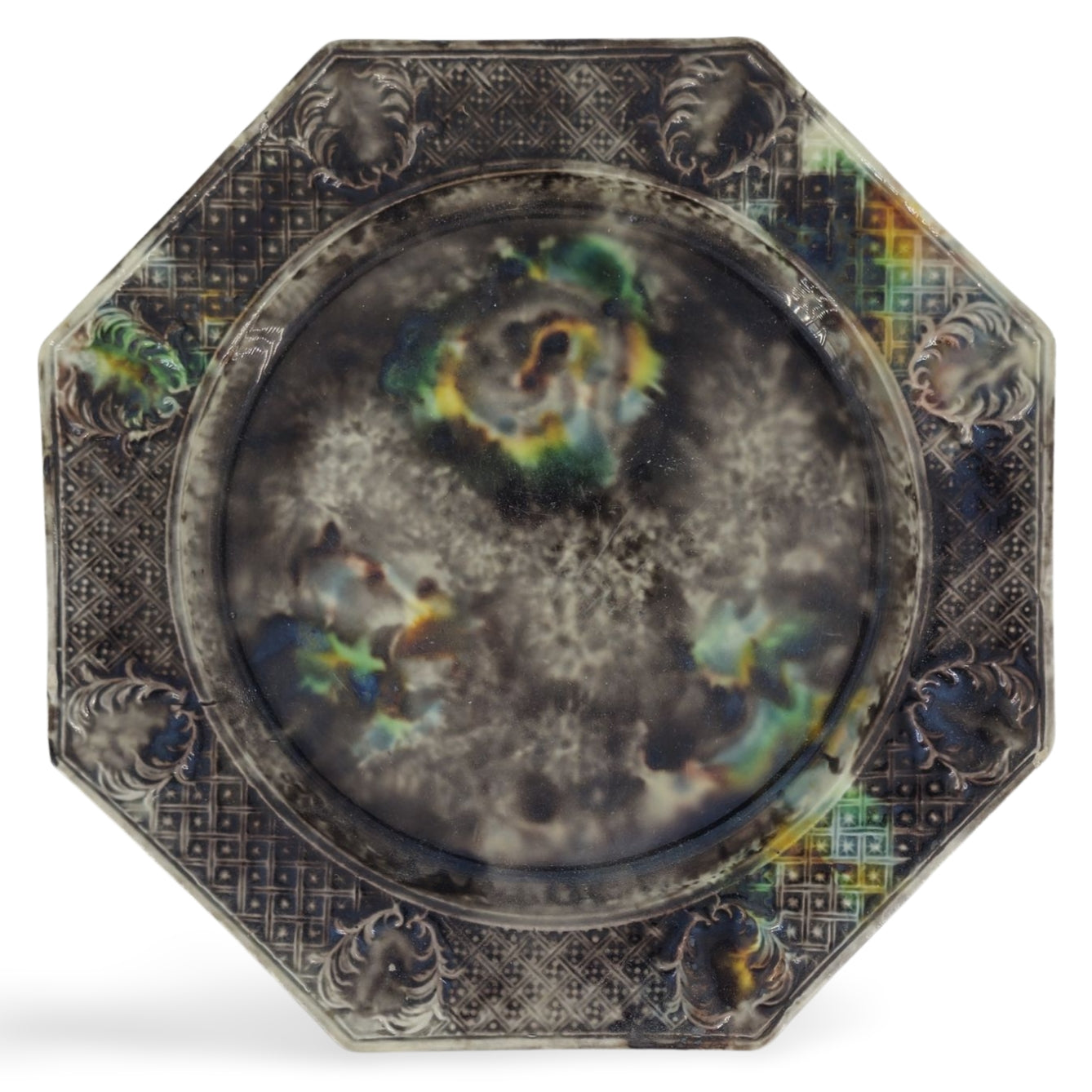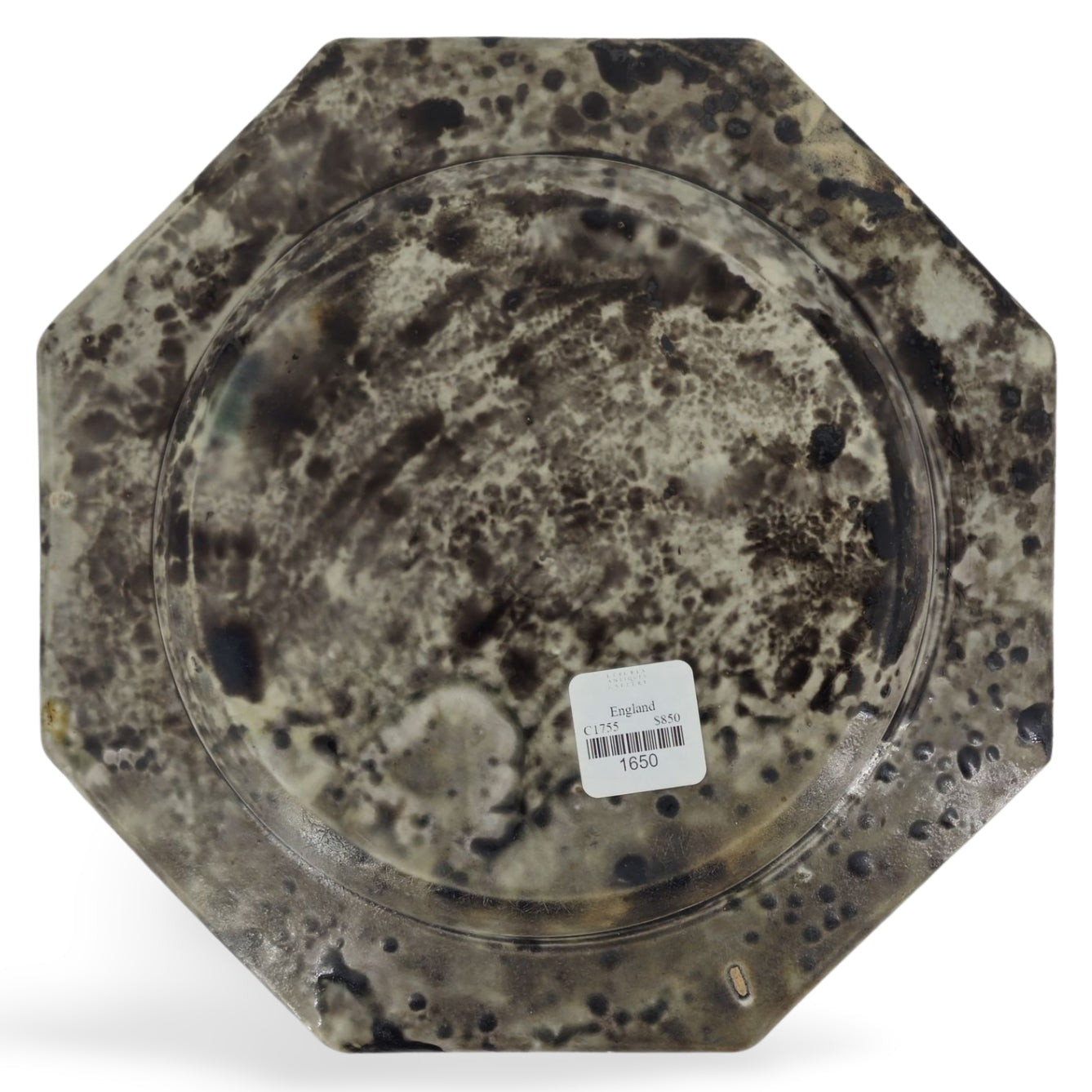 A Wheildonware plate, perhaps actually Whieldon; perhaps Warburton. The black ground is both attractive and unusual.