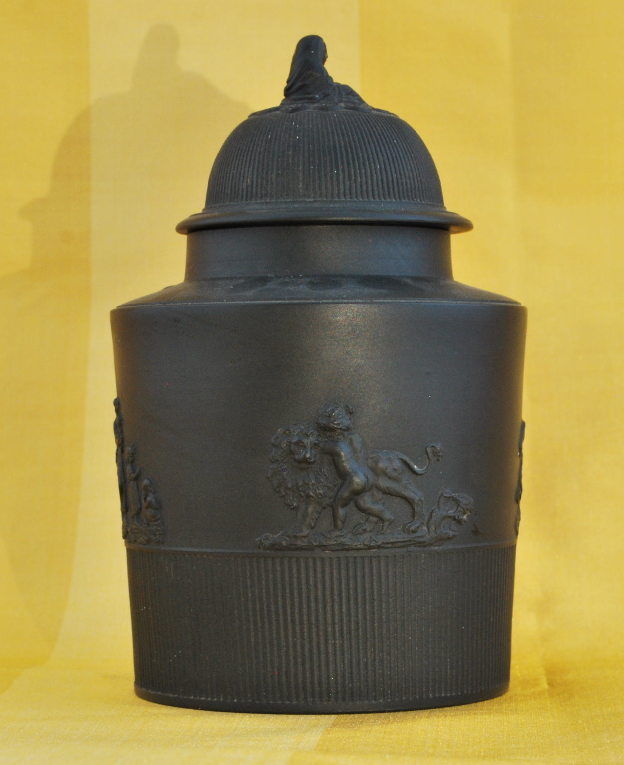 A particularly fine tea canister in black basalt, with engine-turned band and applied decoration.