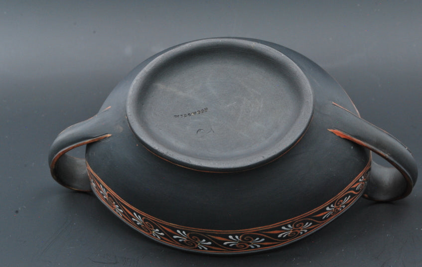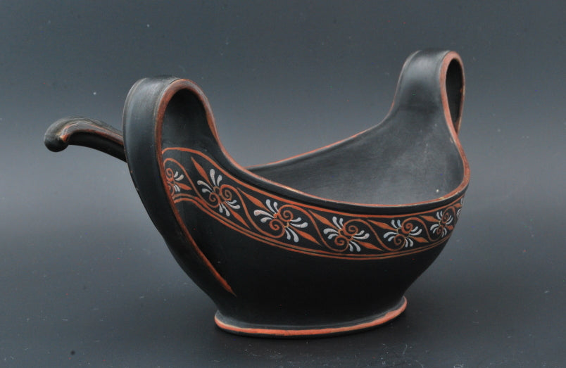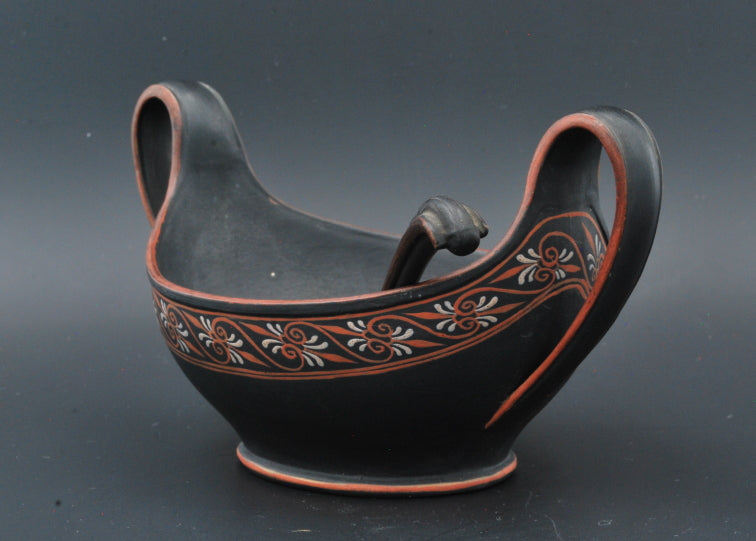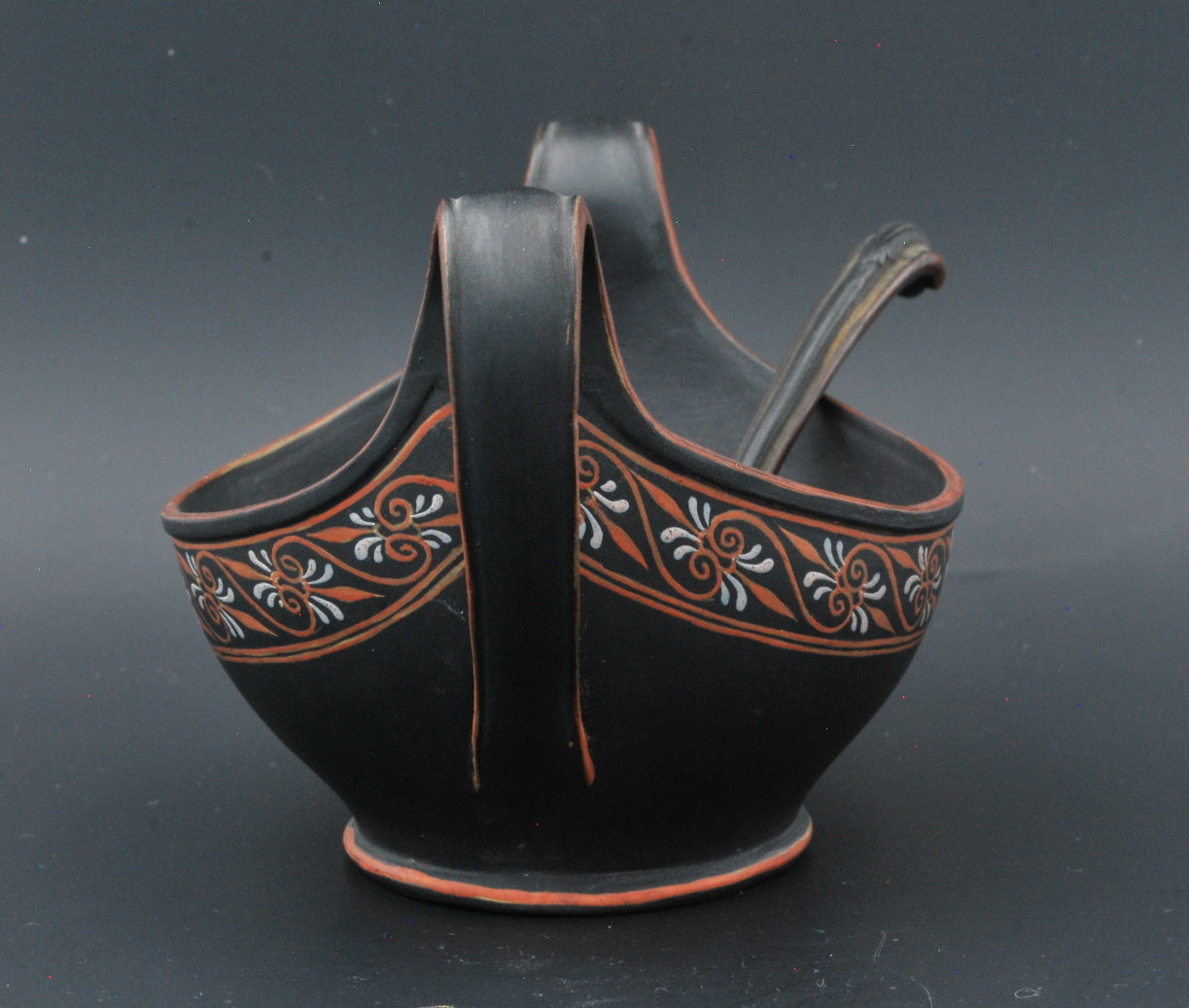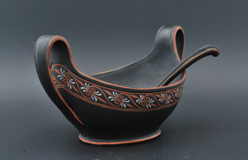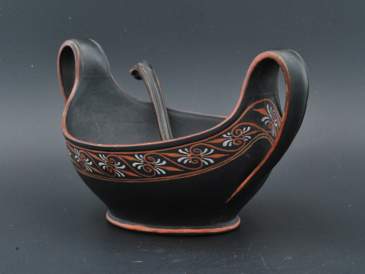An extraordinary navette, or cream boat, in black basalt with encaustic decoration. Complete with matching ladle: a rare find indeed.