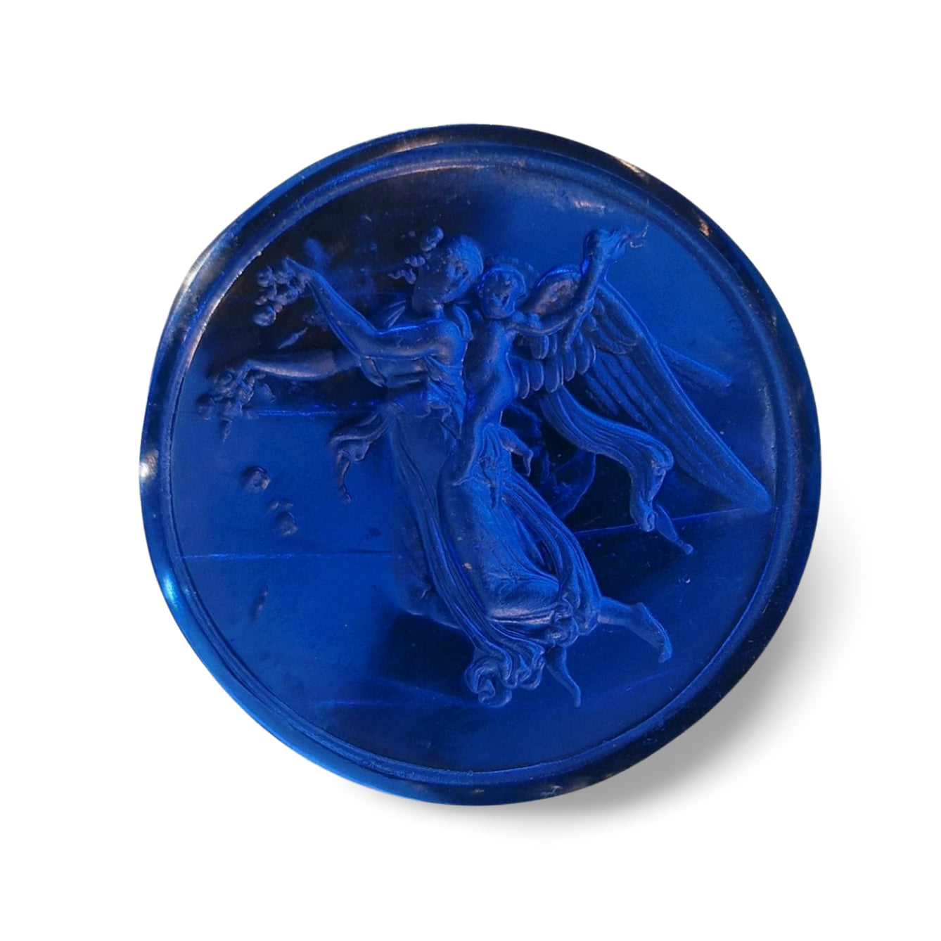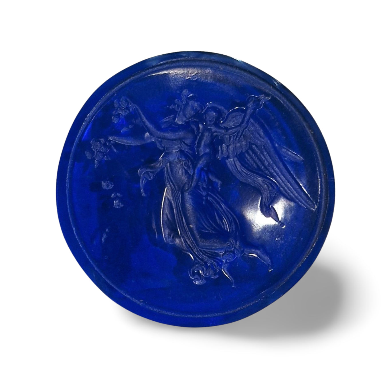 A glass medallion engraved with Venus as Night, with cupid on her back.