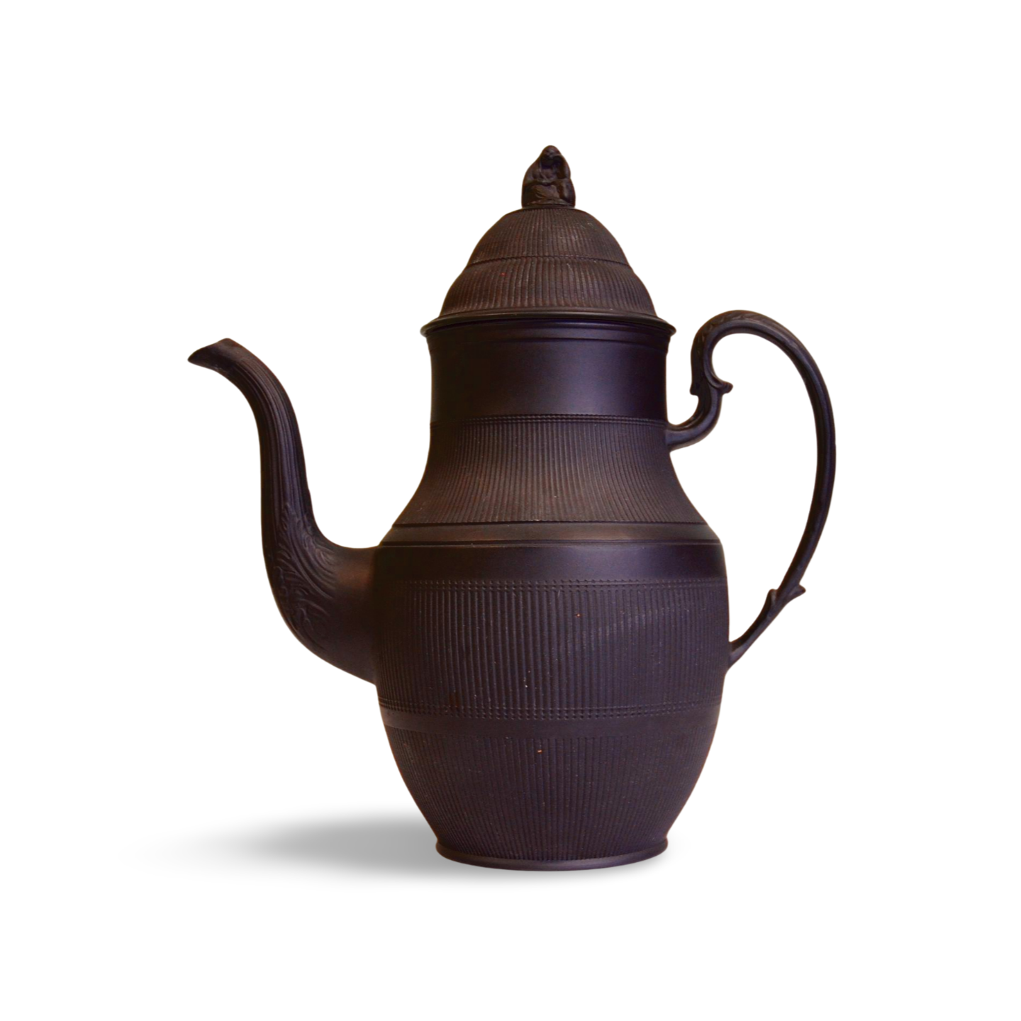 A good example a graceful, simple coffee pot in black basalt. Simple reeded engine-turning and a Widow finial. Nothing more is needed.