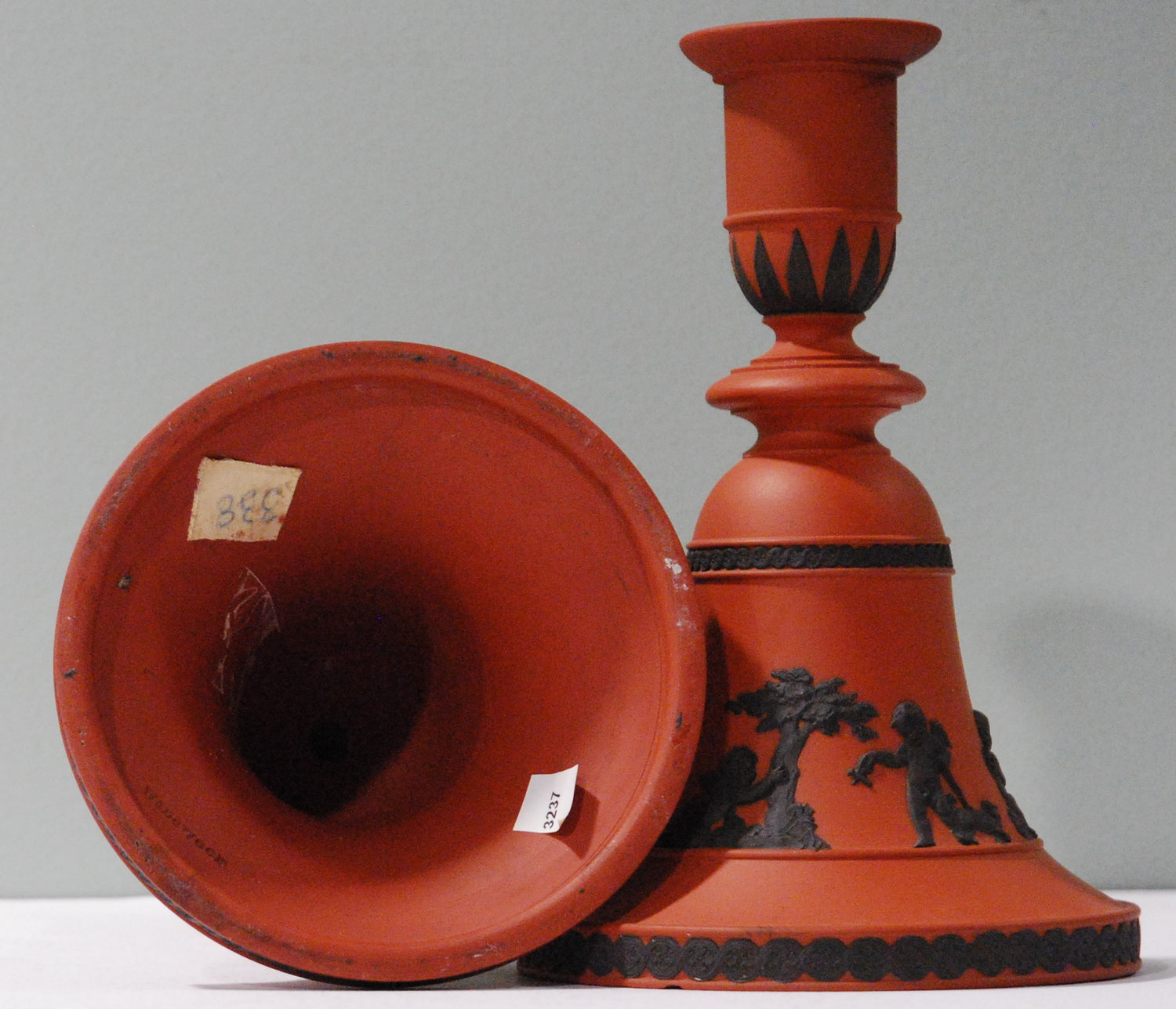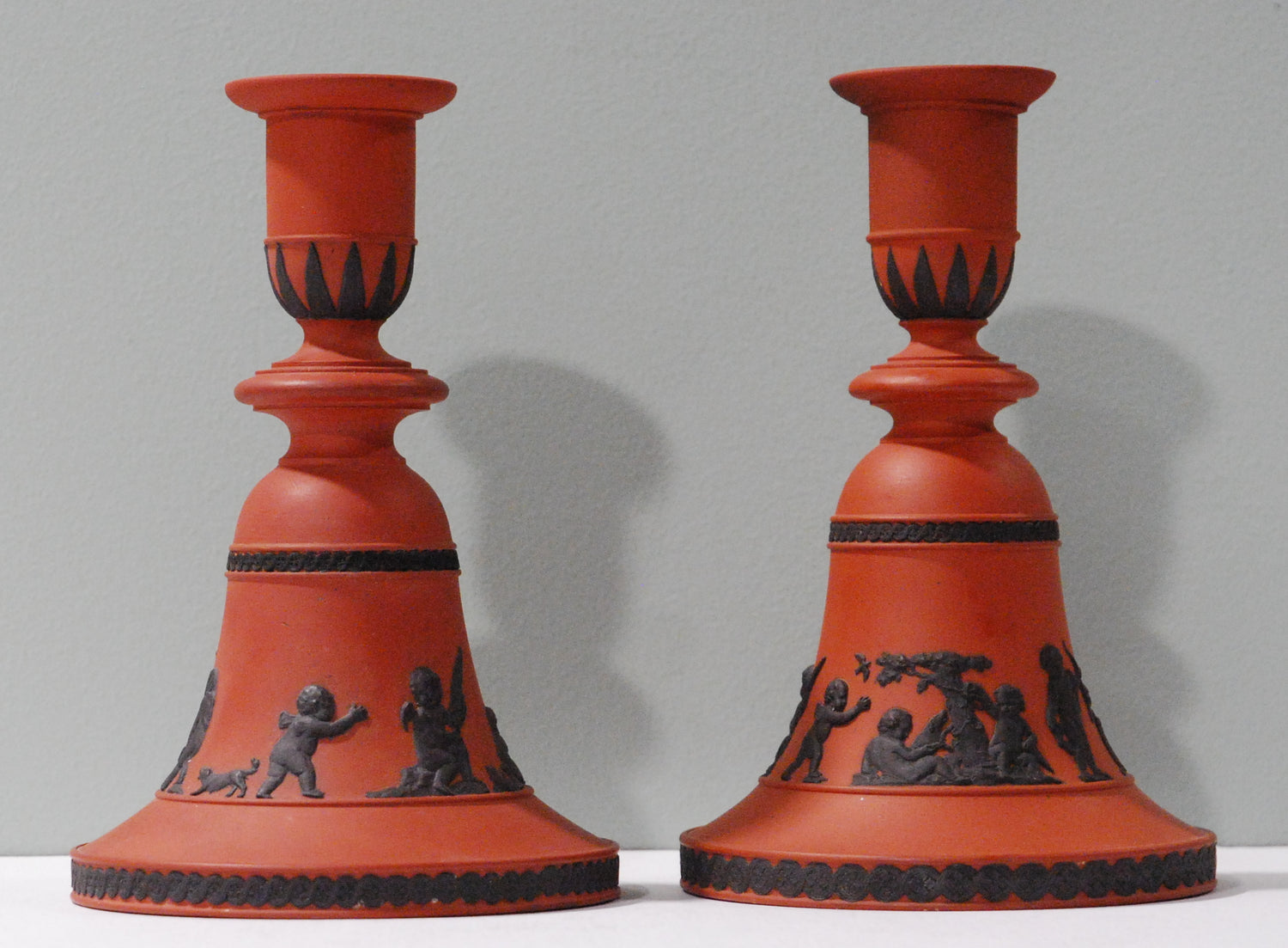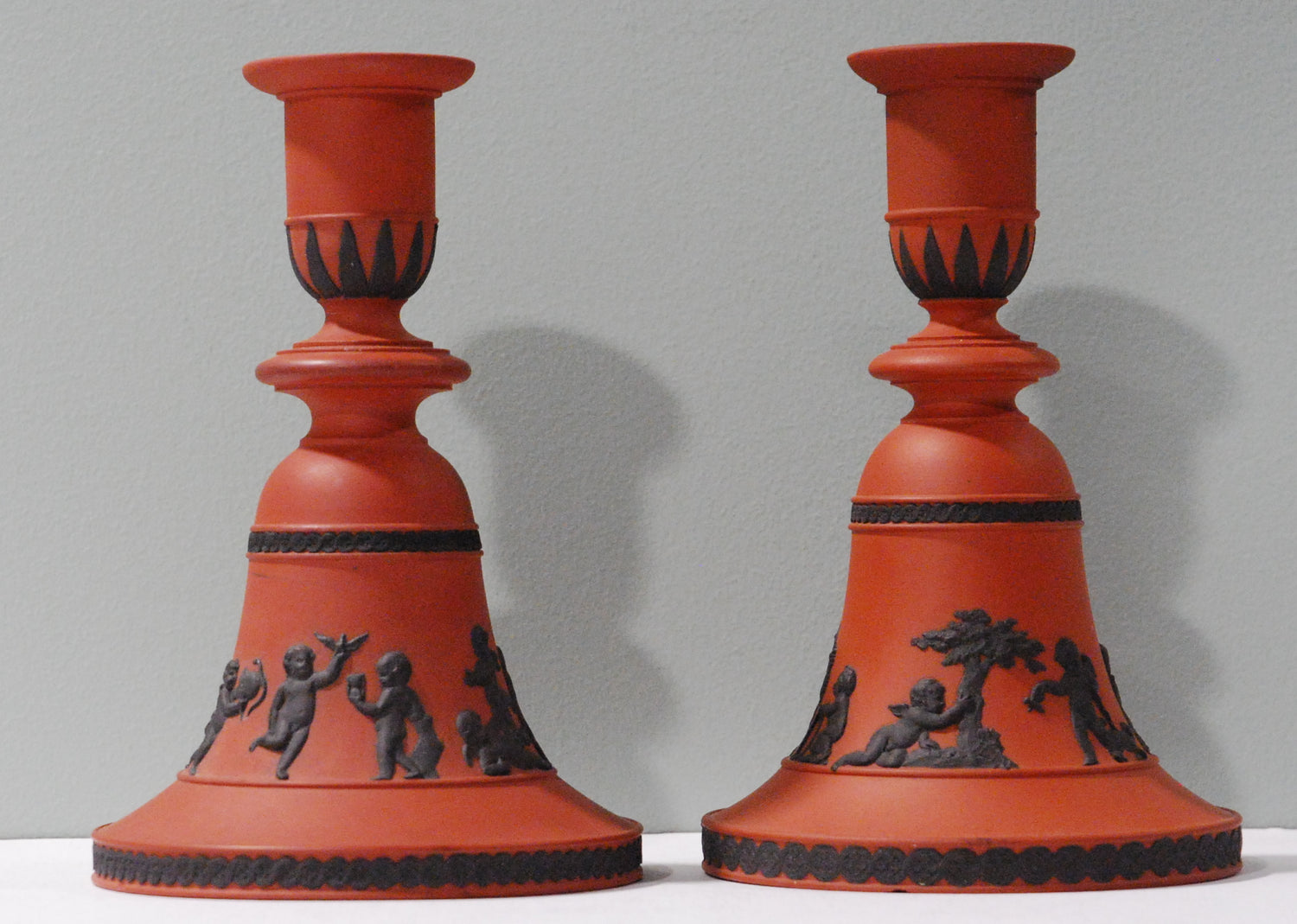 A rare pair of bell shaped candlesticks in rosso anticco, with black decoration of ‘Boys at Play’.