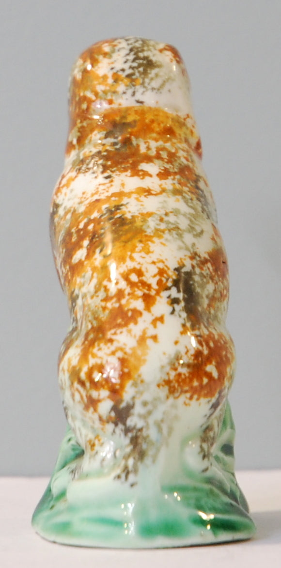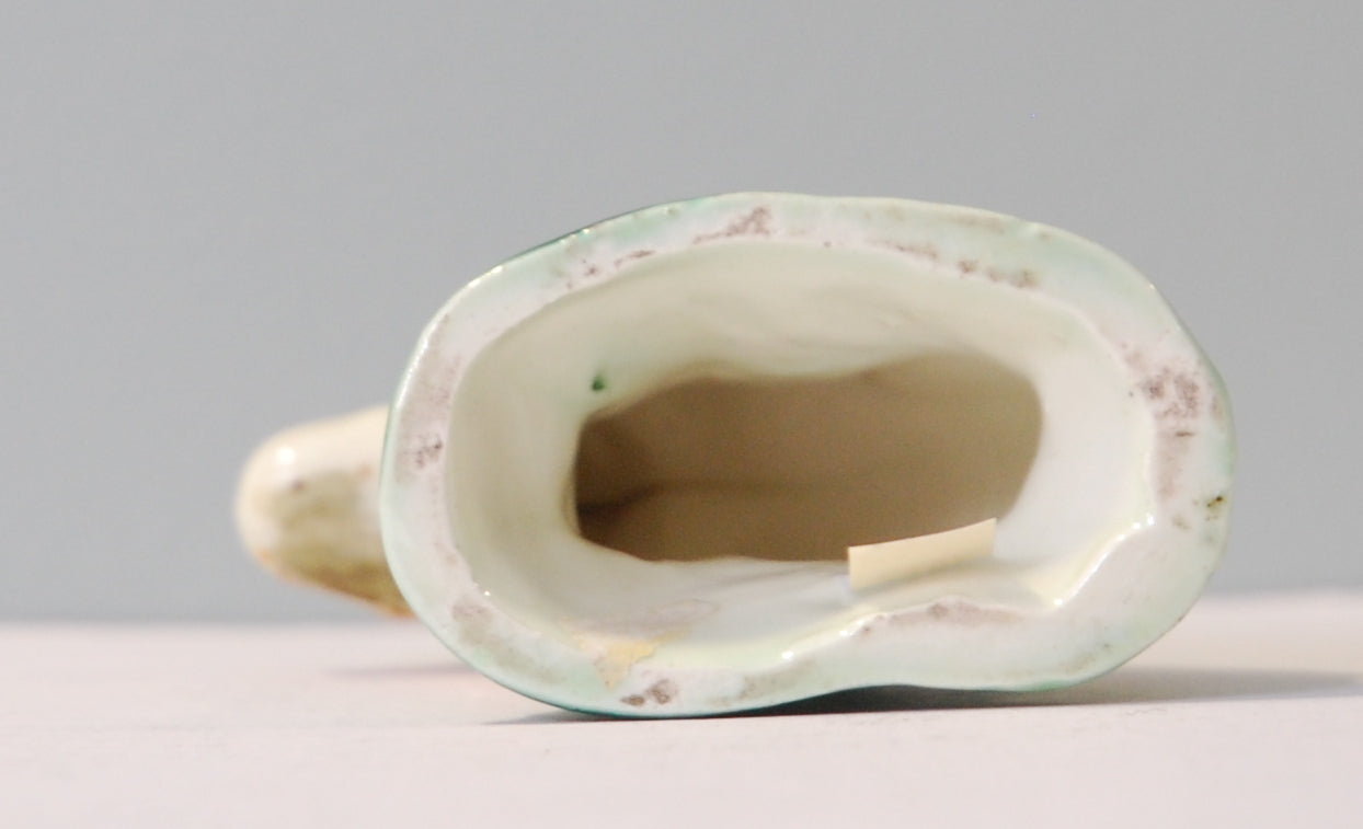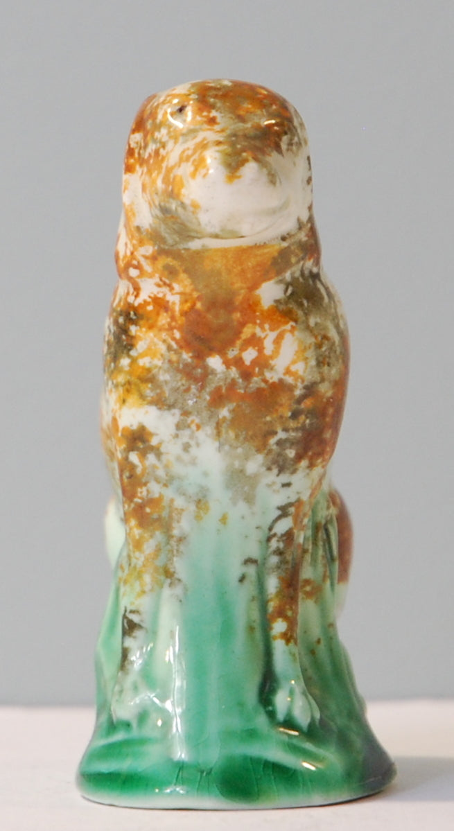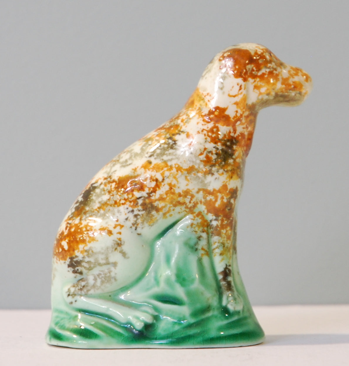 A Wheildonware, or prattware, figure of a hound. Identification of breeds is difficult with such naïve work, but it is possibly a Bassett Hound.