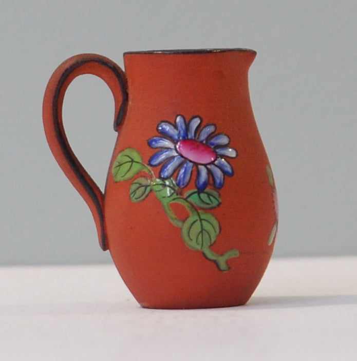 An early miniature milk jug in Rosso Anticco, decorated with famille rose flowers.