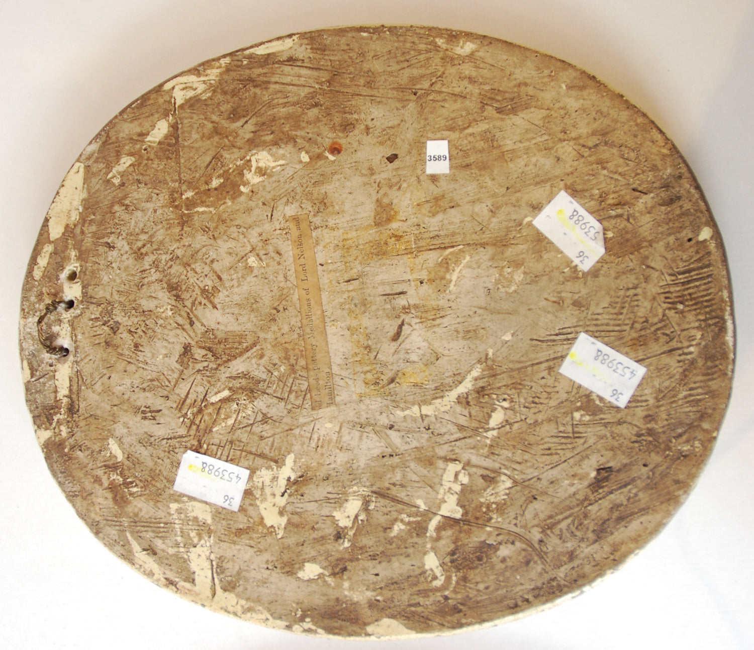 A pair of massive portrait medallions in enamelled creamware, depicting Nelson and Lady Hamilton.
