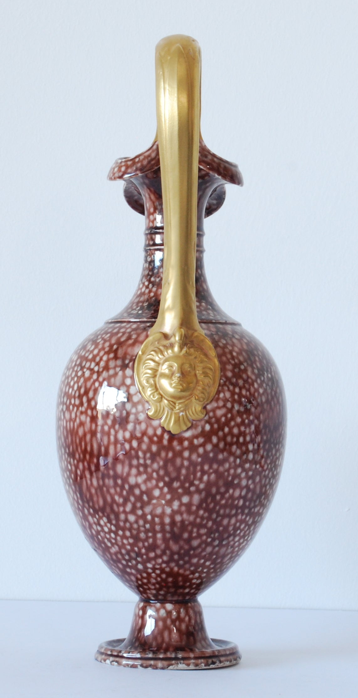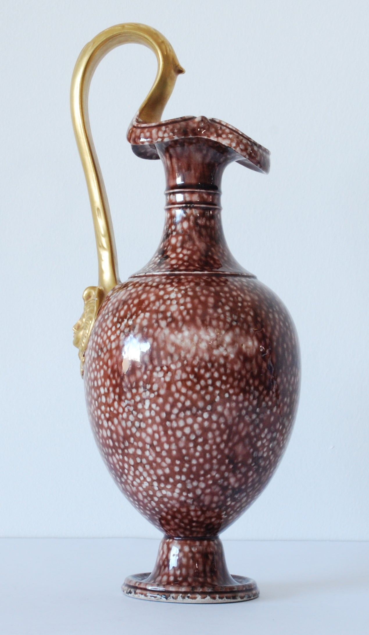 A fine neo-classical wine jug in creamware with oeil de perdrix decoration and a gilt handle. The thick, heavy gilding is typical of the period when Wedgwood was still relatively new to the process.