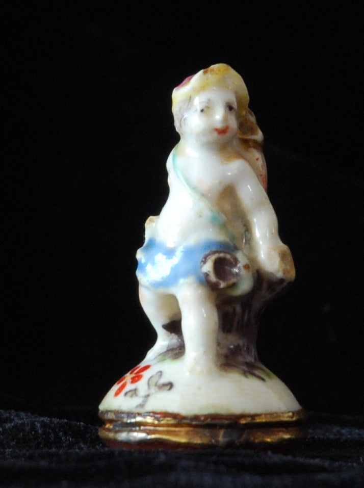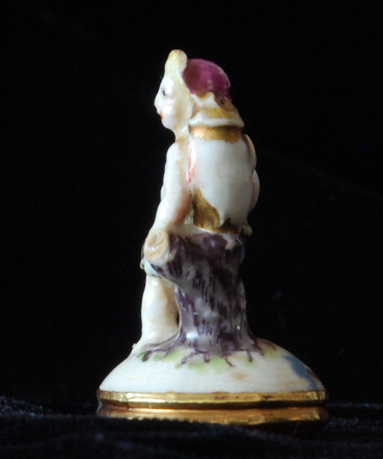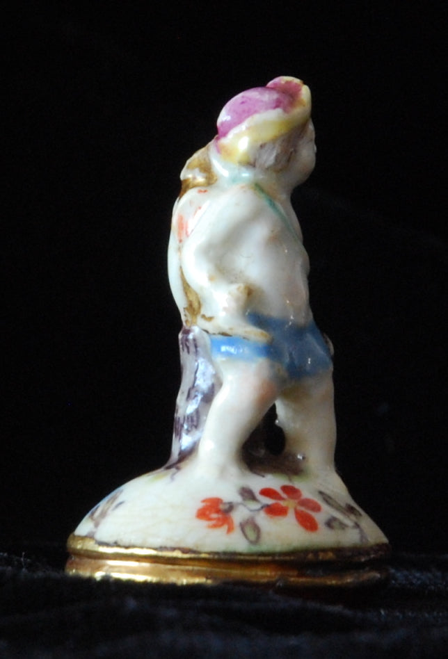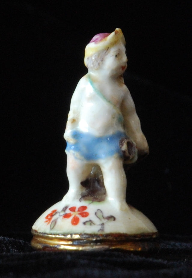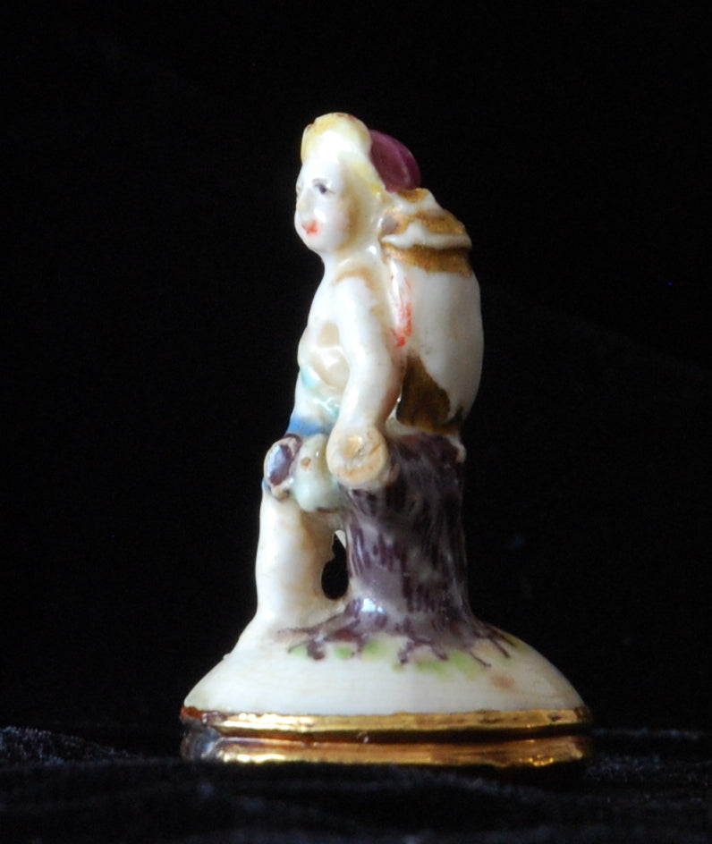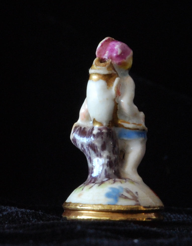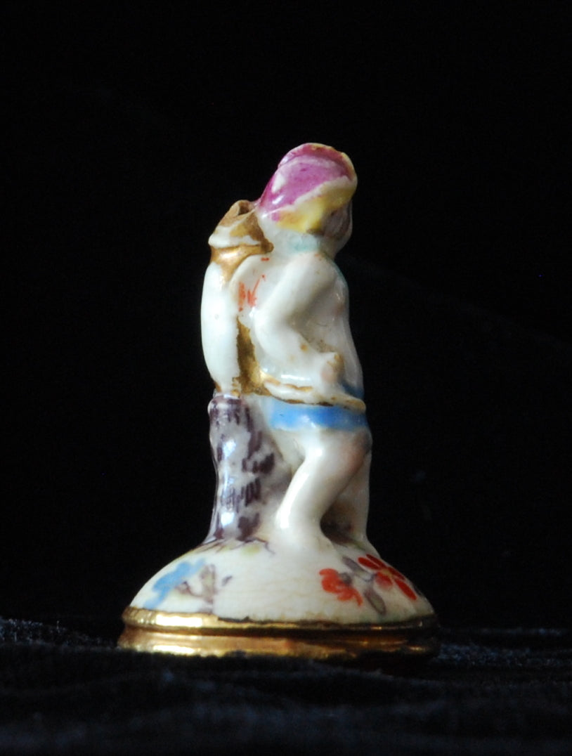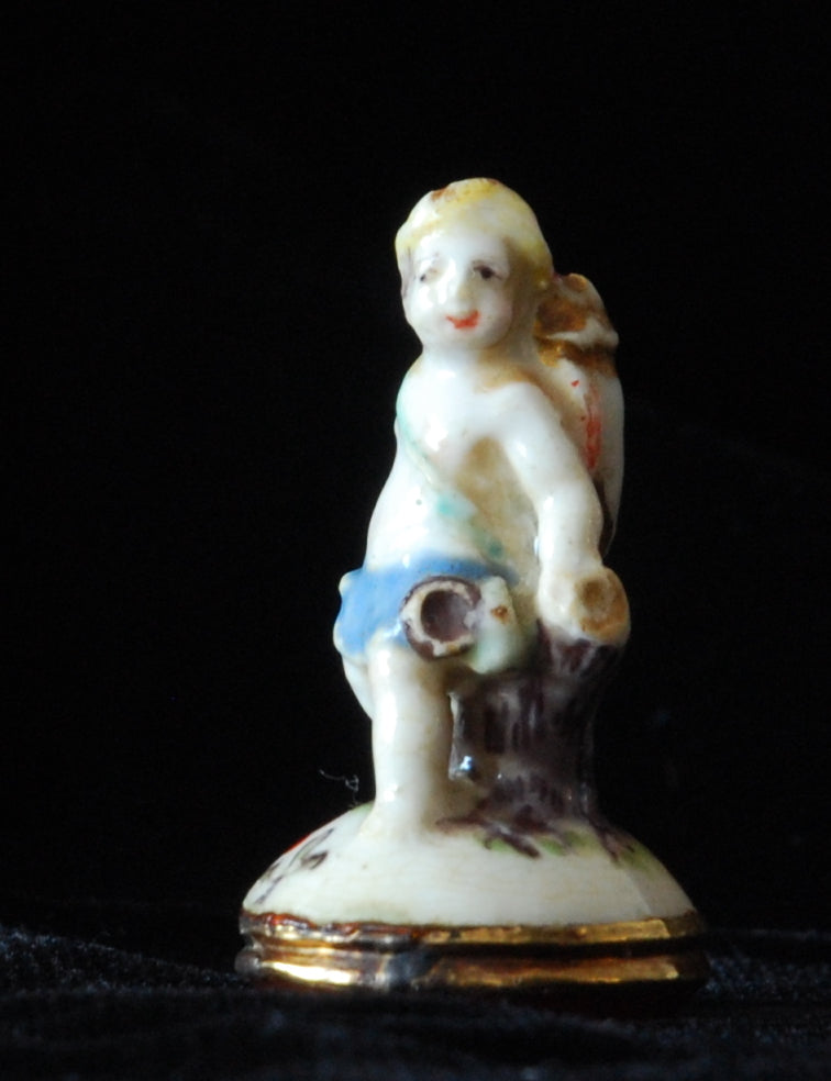 A rare seal from the Derby porcelain works, portraying Cupid with his quiver slung over his shoulder.