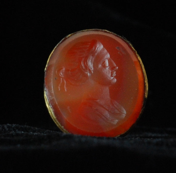 The matrix, mounted in gold or gilt-metal, is a finely carved semi-precious stone.