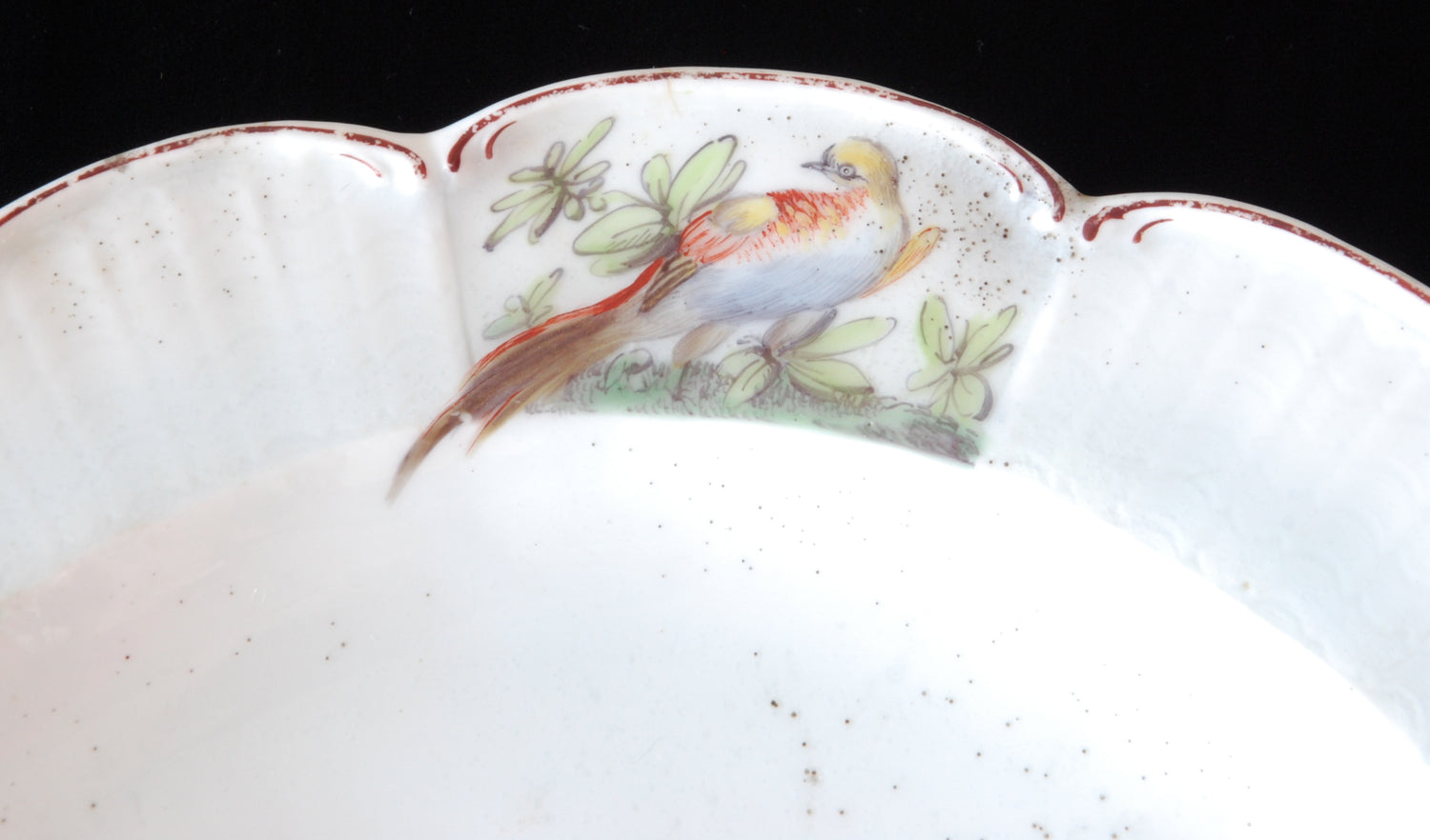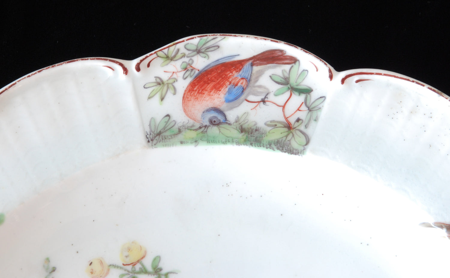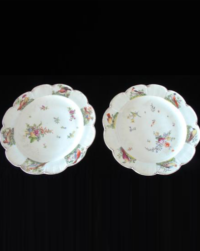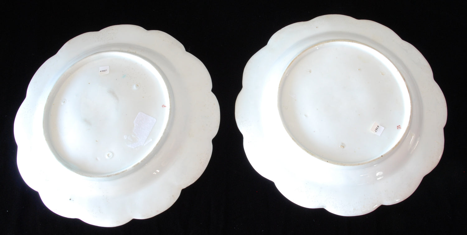 A pair of scalloped dessert plates, painted with bunches and sprays of flowers, with attractive naturalistic birds arranged around the outside.