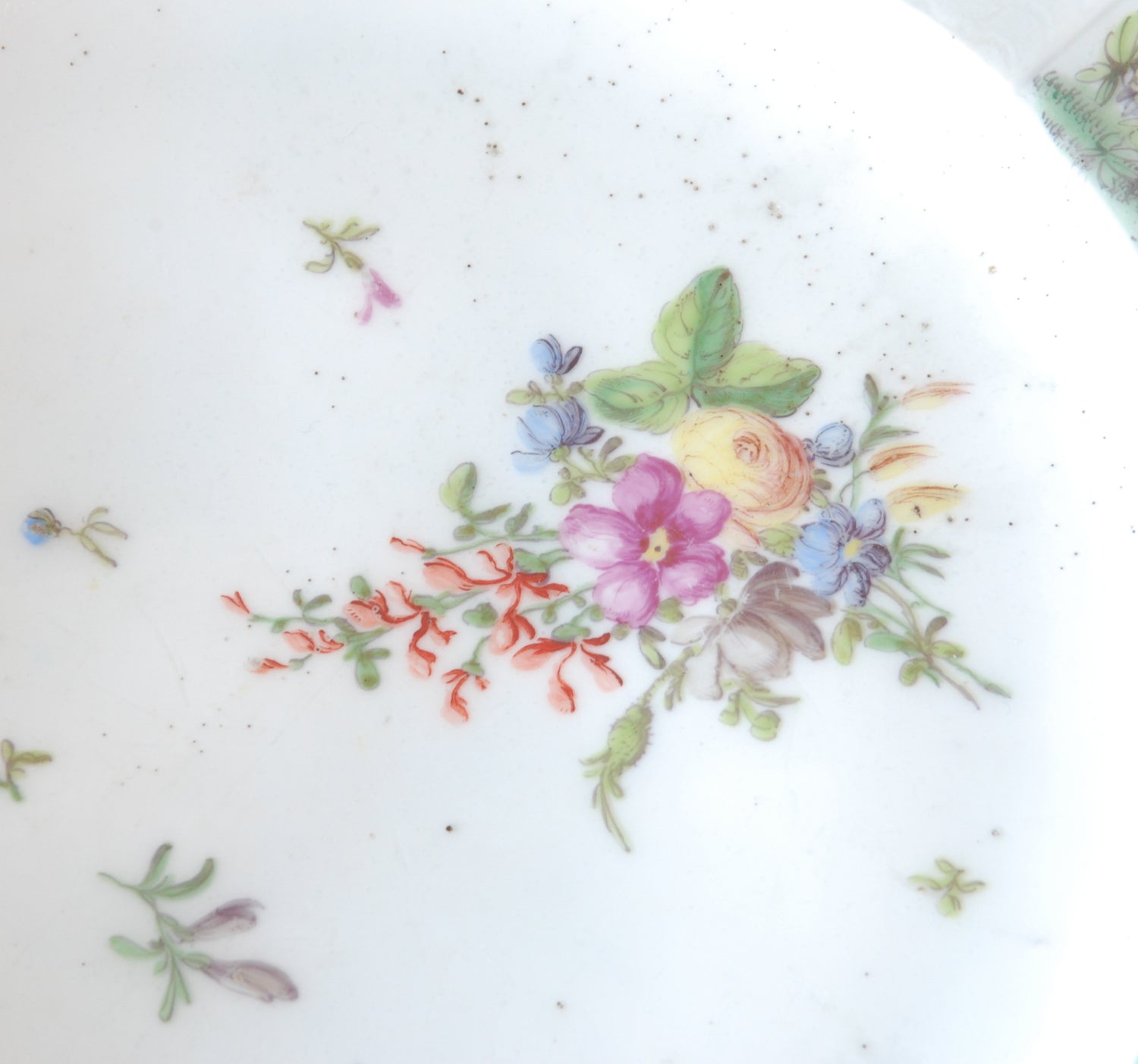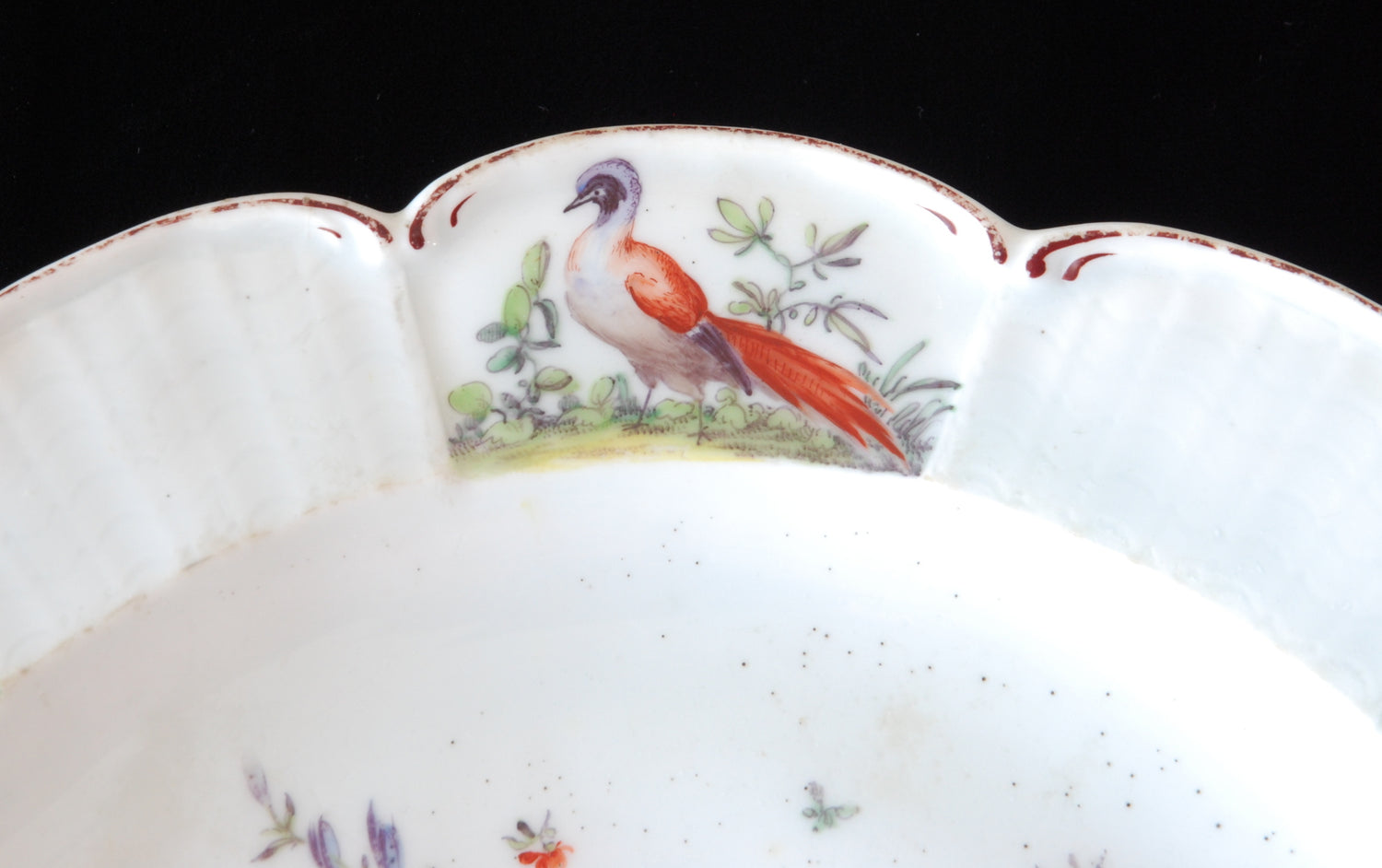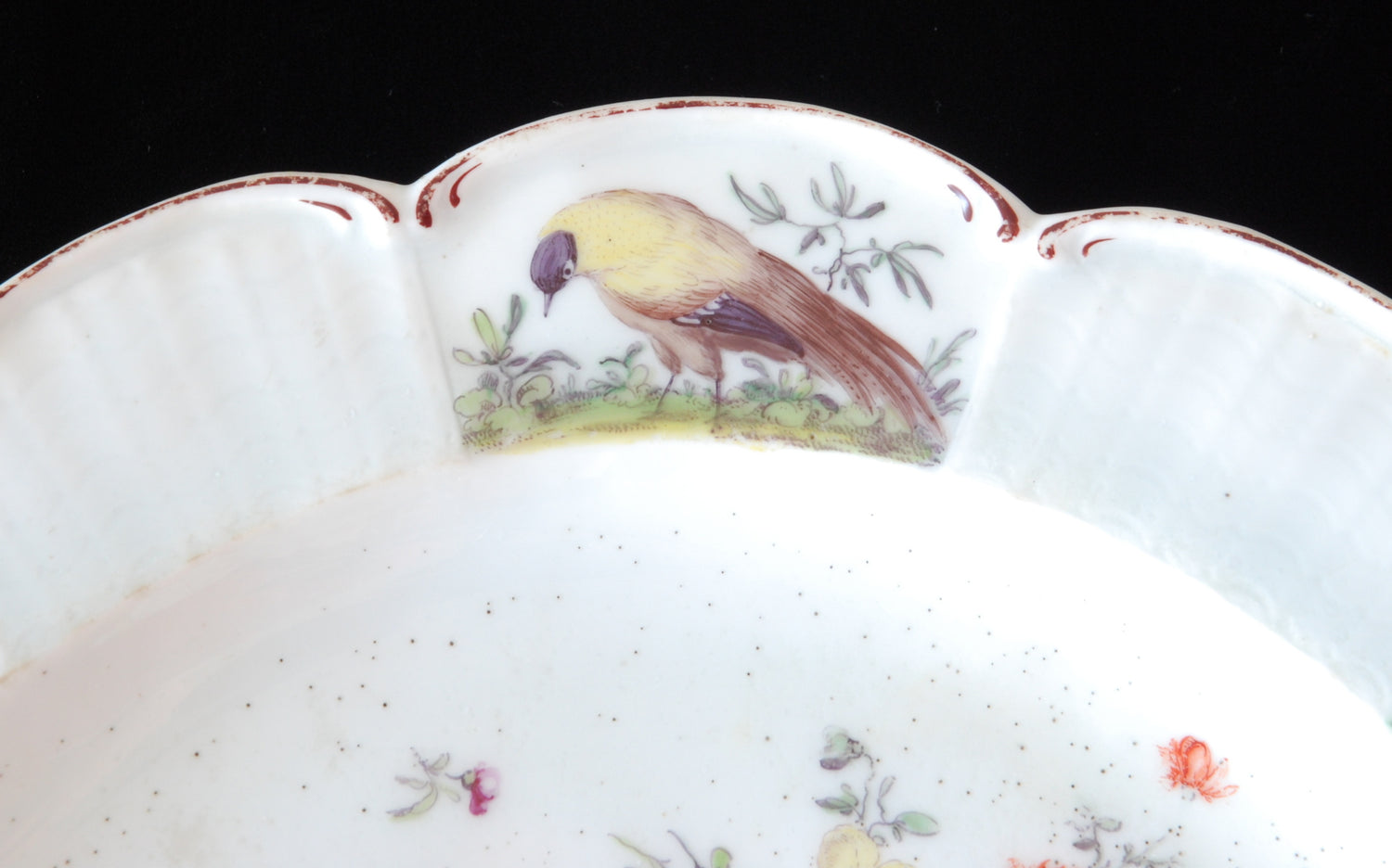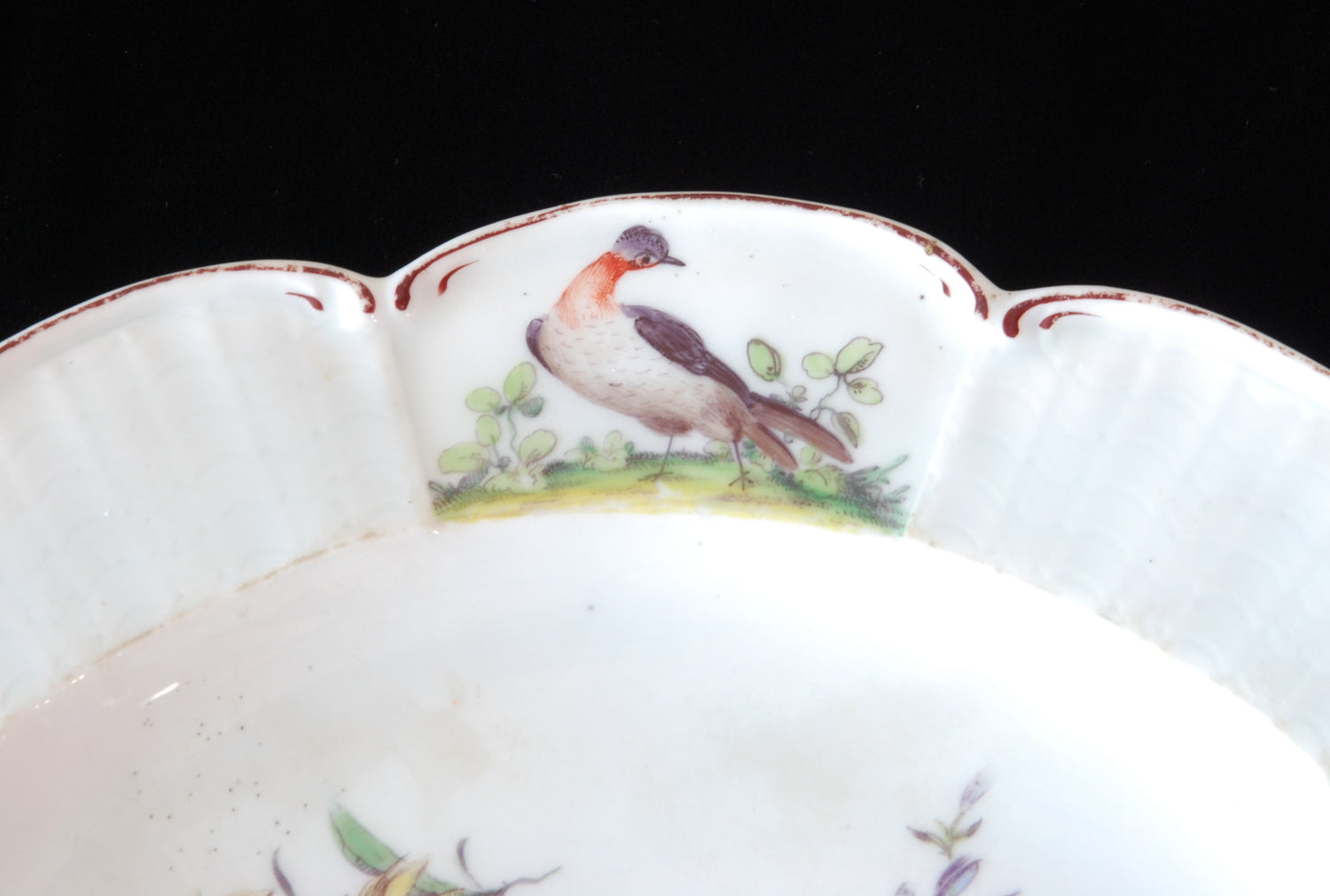 A pair of scalloped dessert plates, painted with bunches and sprays of flowers, with attractive naturalistic birds arranged around the outside.