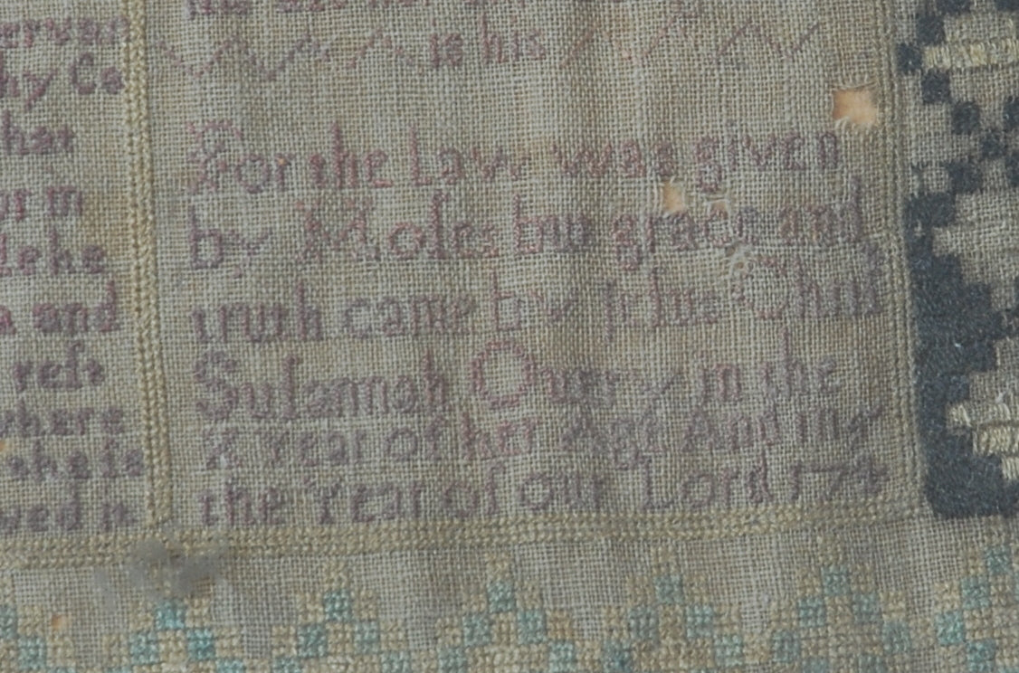 A very fine and early sampler by ‘Susannah Ourey in the 8 year of her Age And in the Year of Our Lord 1745’. The Ten commandments are finely wrought, and flanked by portraits of Moses and Aaron standing on diapered pedestals. A Seraph in the clouds surmounts the composition, typical of the period.