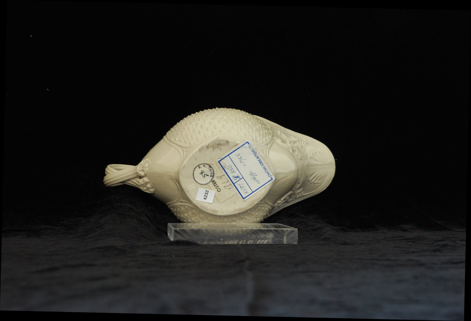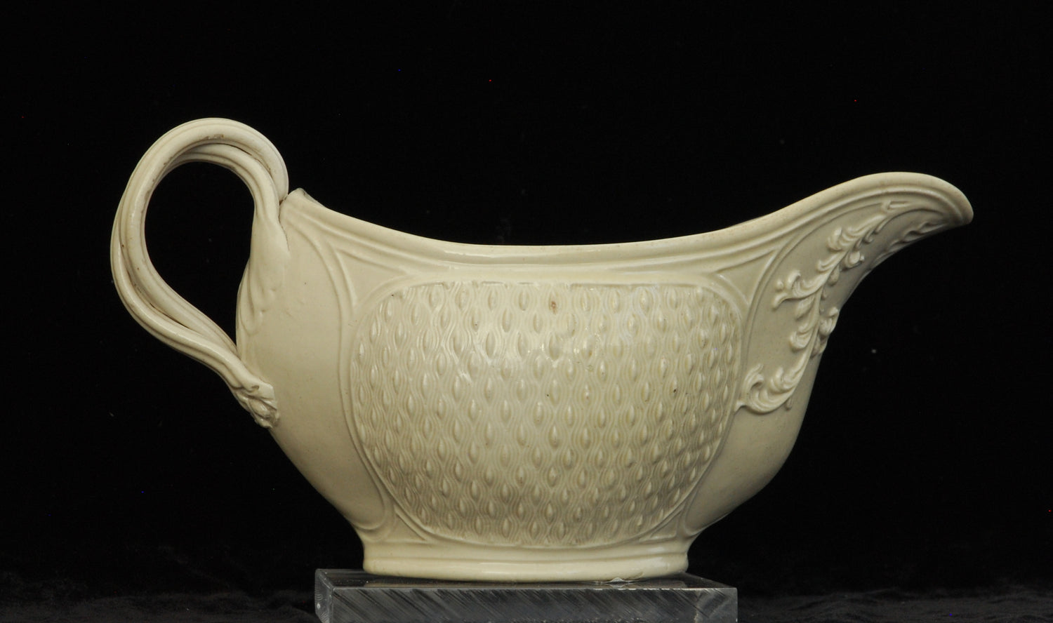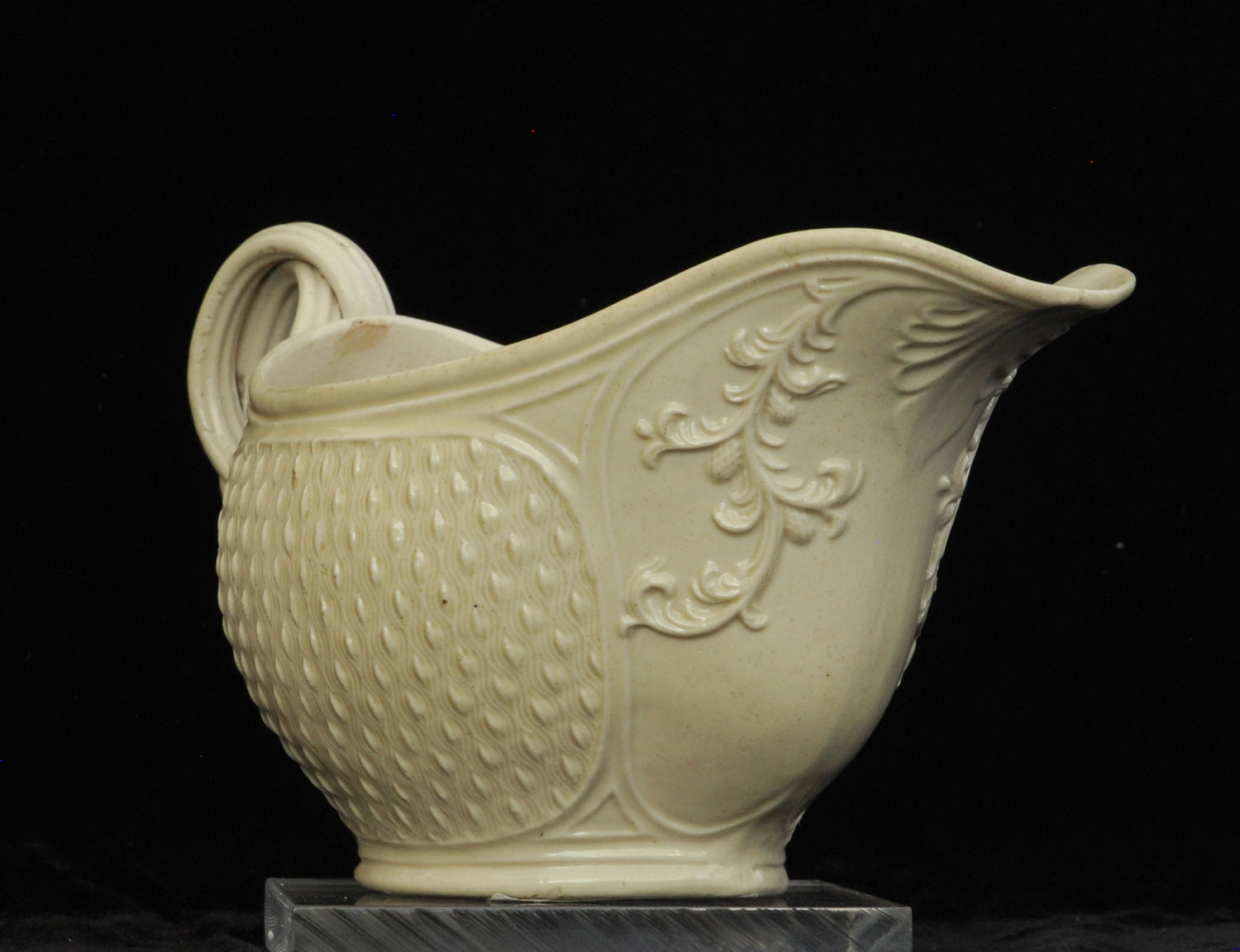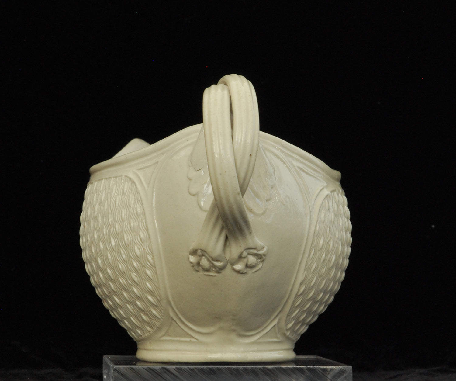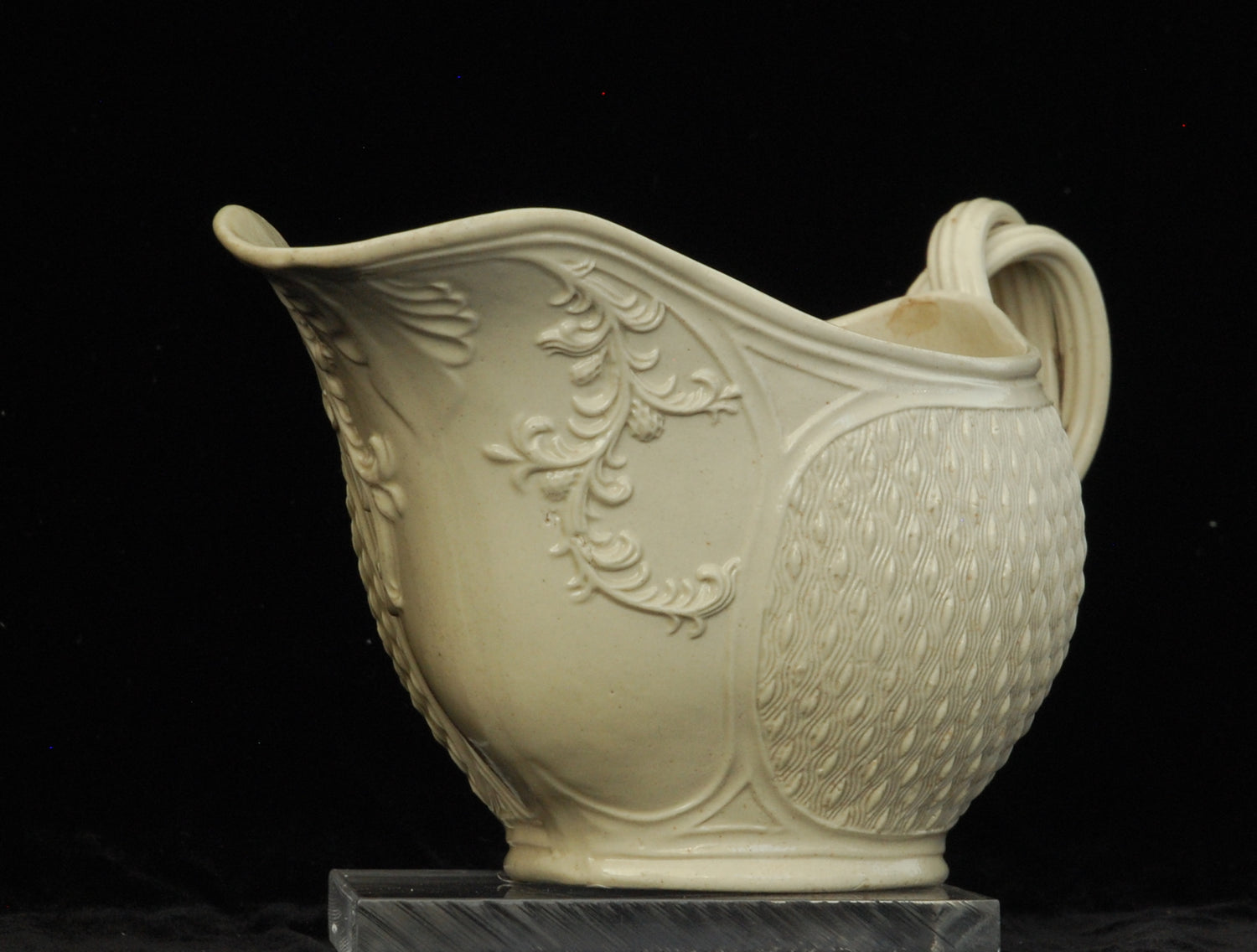 An excellent example of the popular Barleycorn pattern, crisply moulded in panels to the sides, with graceful sprigs. The twisted handles with their impressed terminals are the prototype of the sort that will be seen on the creamware versions in the 1770s. The design is just on the cusp of the beginning of the rococo movement.