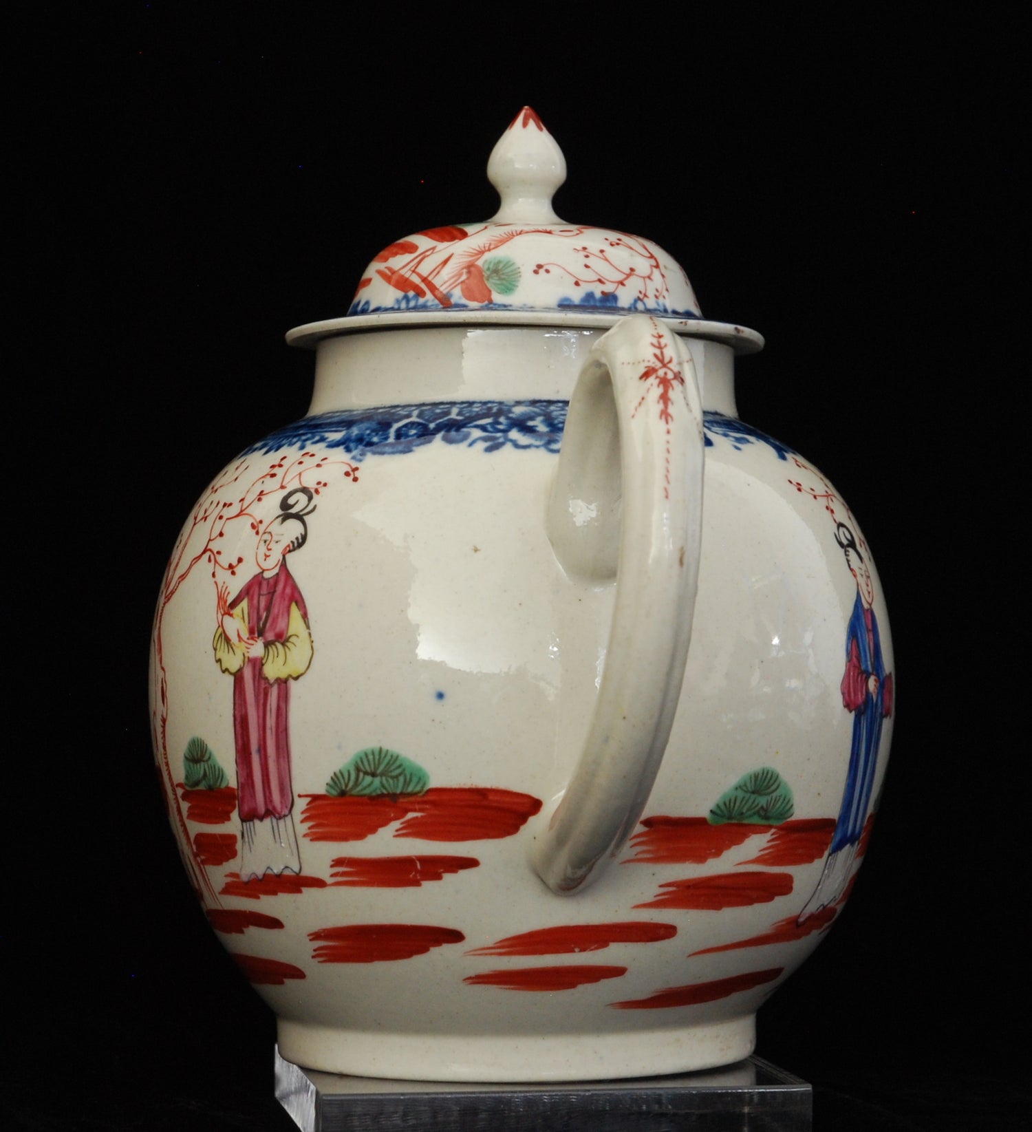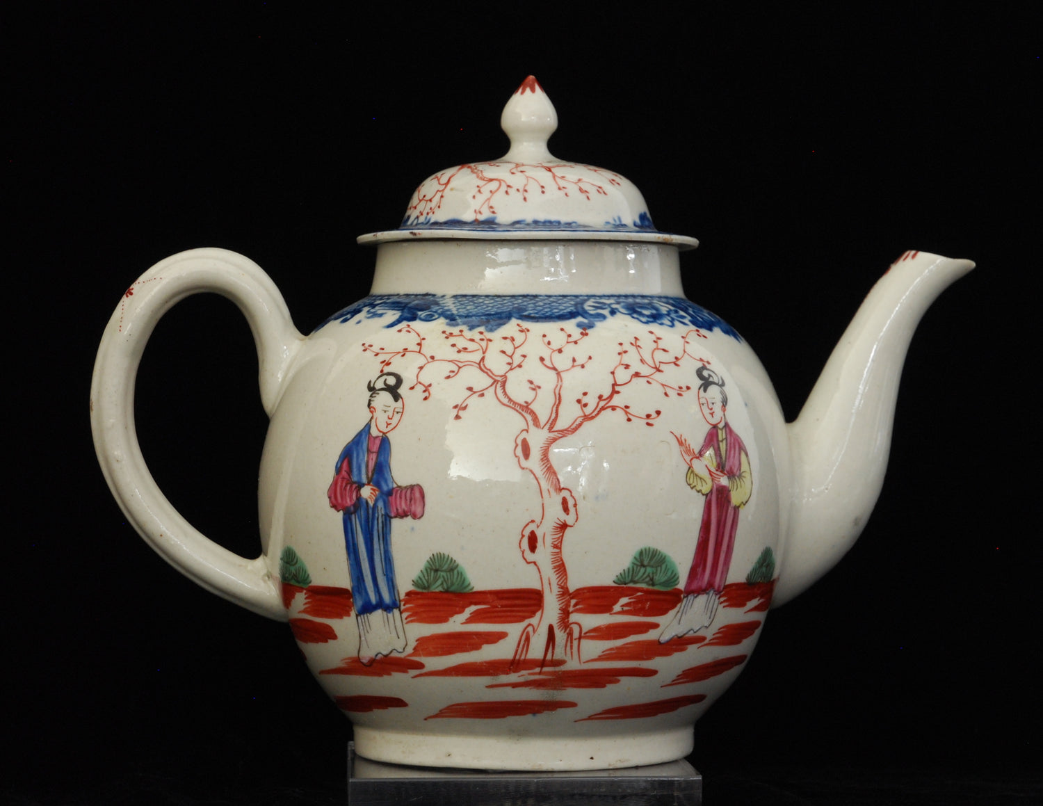 Globular teapot from one of the best known Liverpool factories, Charles Pennington; with underglaze blue decoration and enamelled with ‘Family’ pattern.