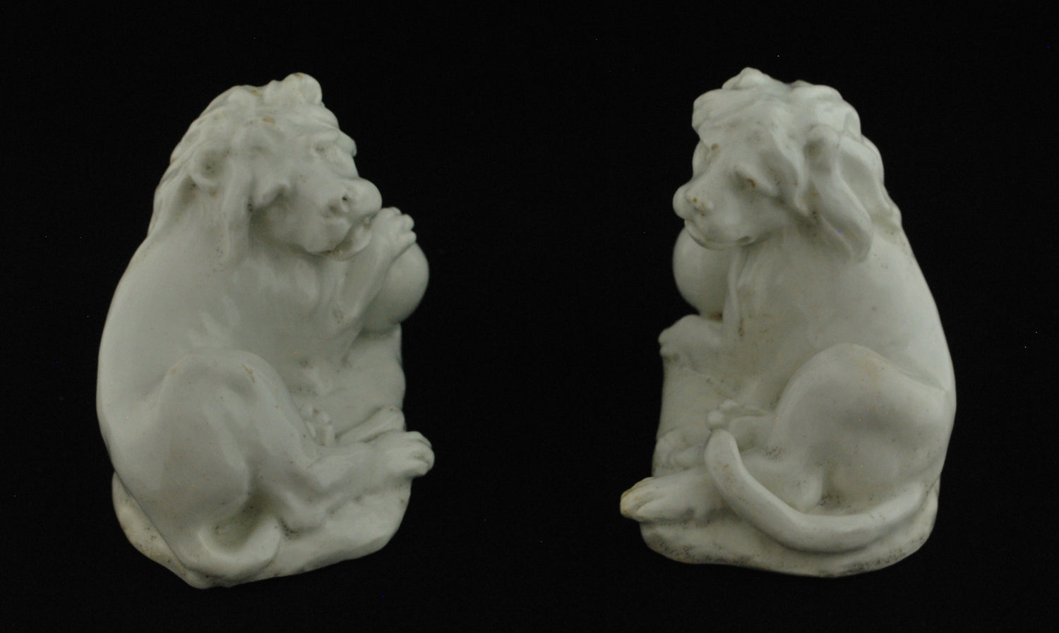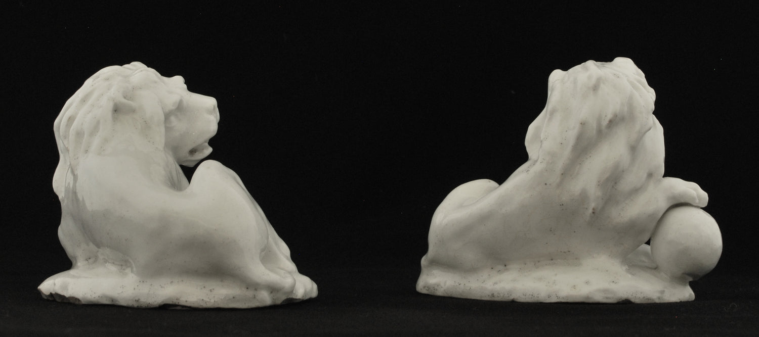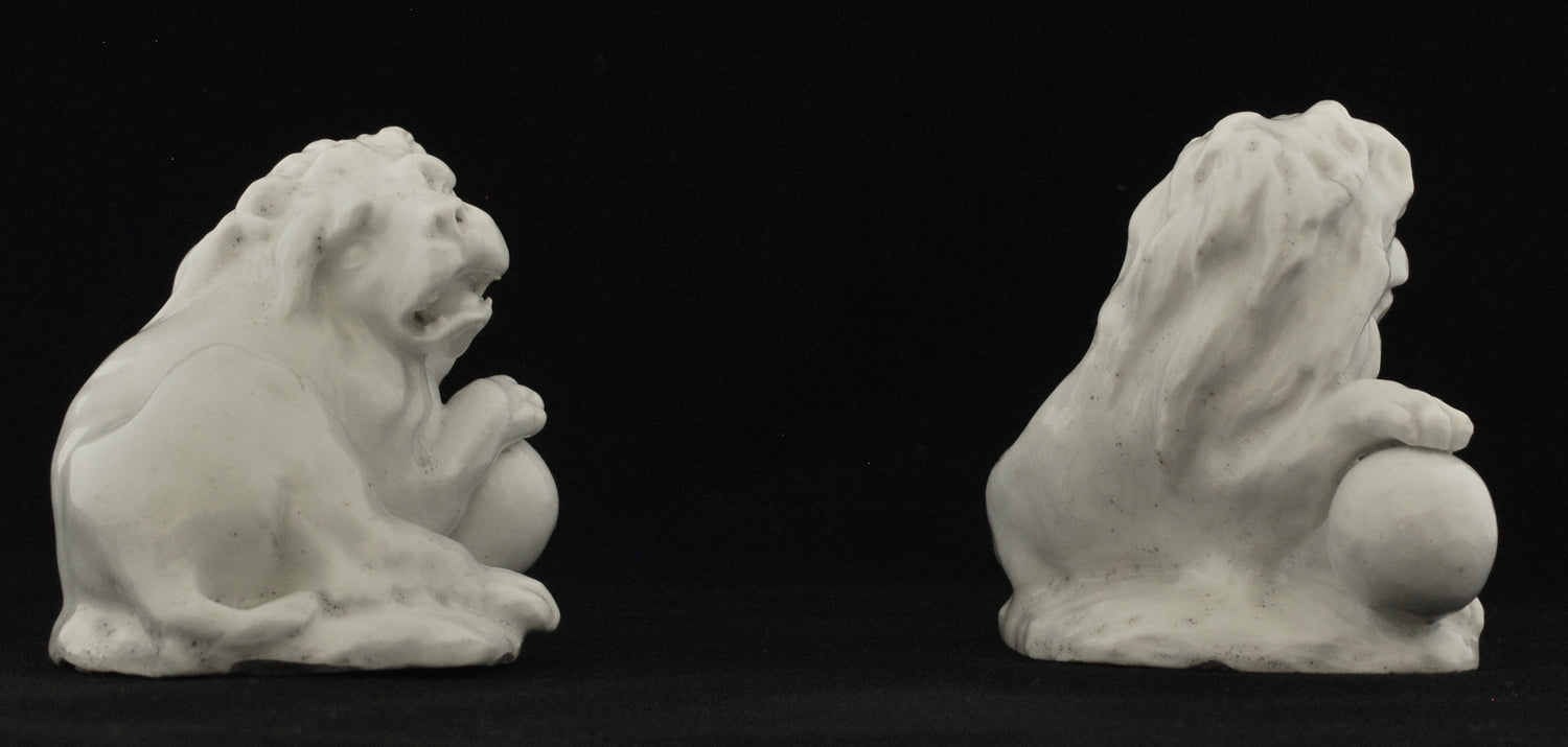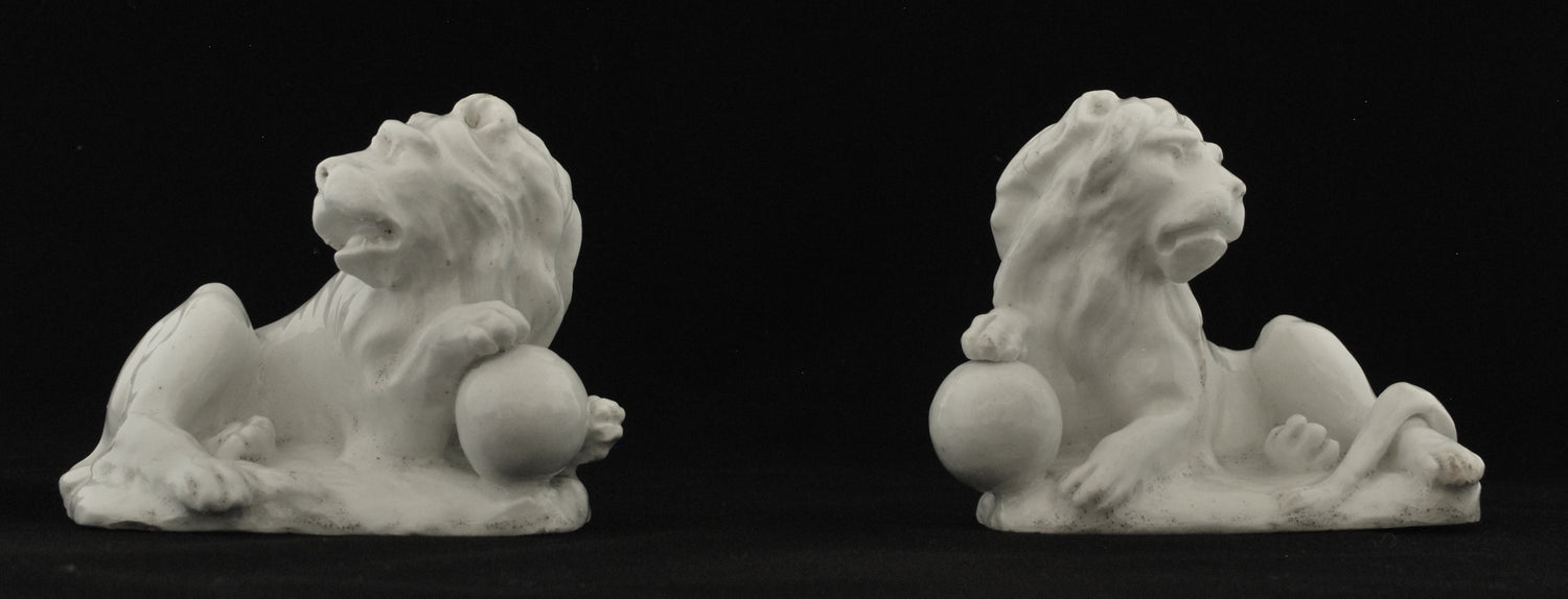 Most lion figures were apparently in the white although enamelled versions are known, some depicting the globes with geographic ‘details’ in colours: see Katz Collection, MFA, Boston, as circa 1752, #1988.588.