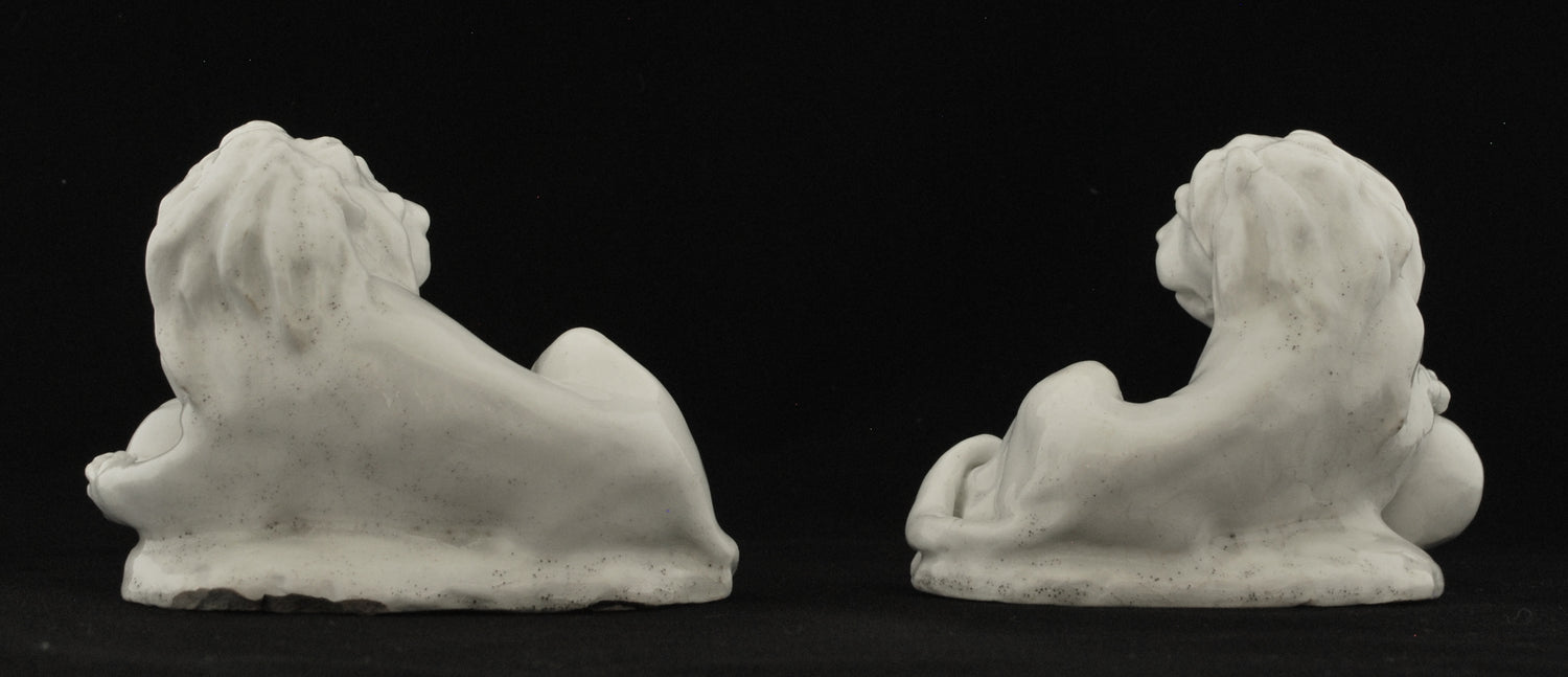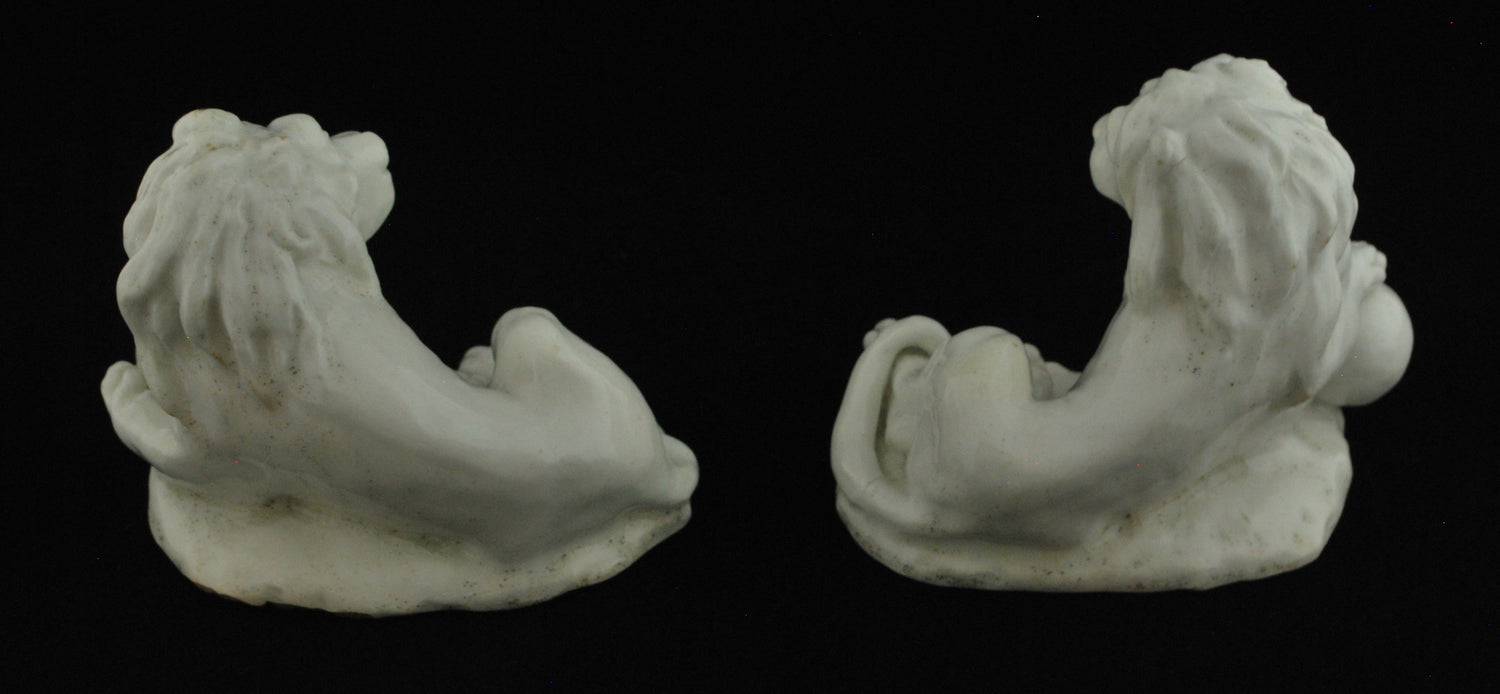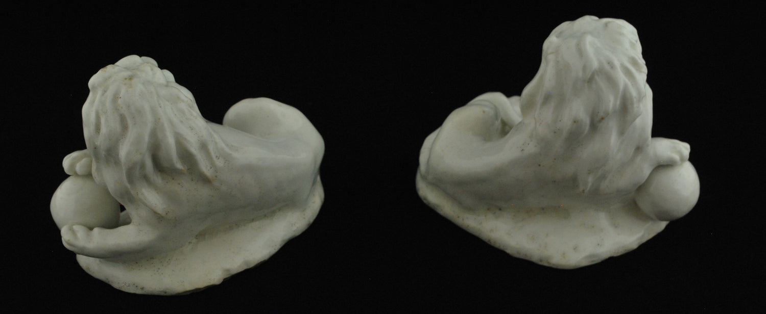 In the white. One modelled recumbent to the right, the other to the left; each with head turned towards its back and with forepaw on a large ball (globe or possibly a pearl in the presumably original Chinese imagery), and tail over back legs. Each on low rectangular base.