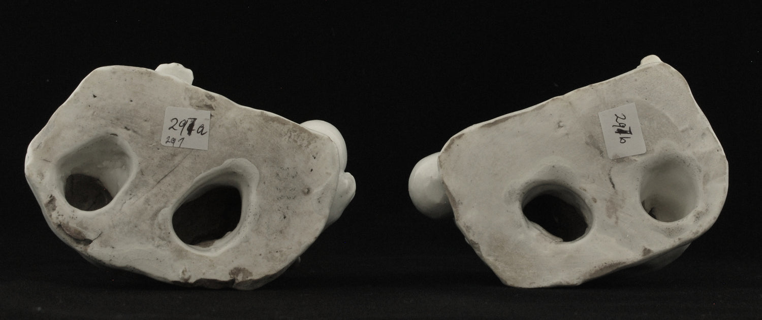 White porcelain and dense white glaze, with some black speckling. Grey-green translucency. Underside with circular holes. L. 4.0 in (10.0 cm).