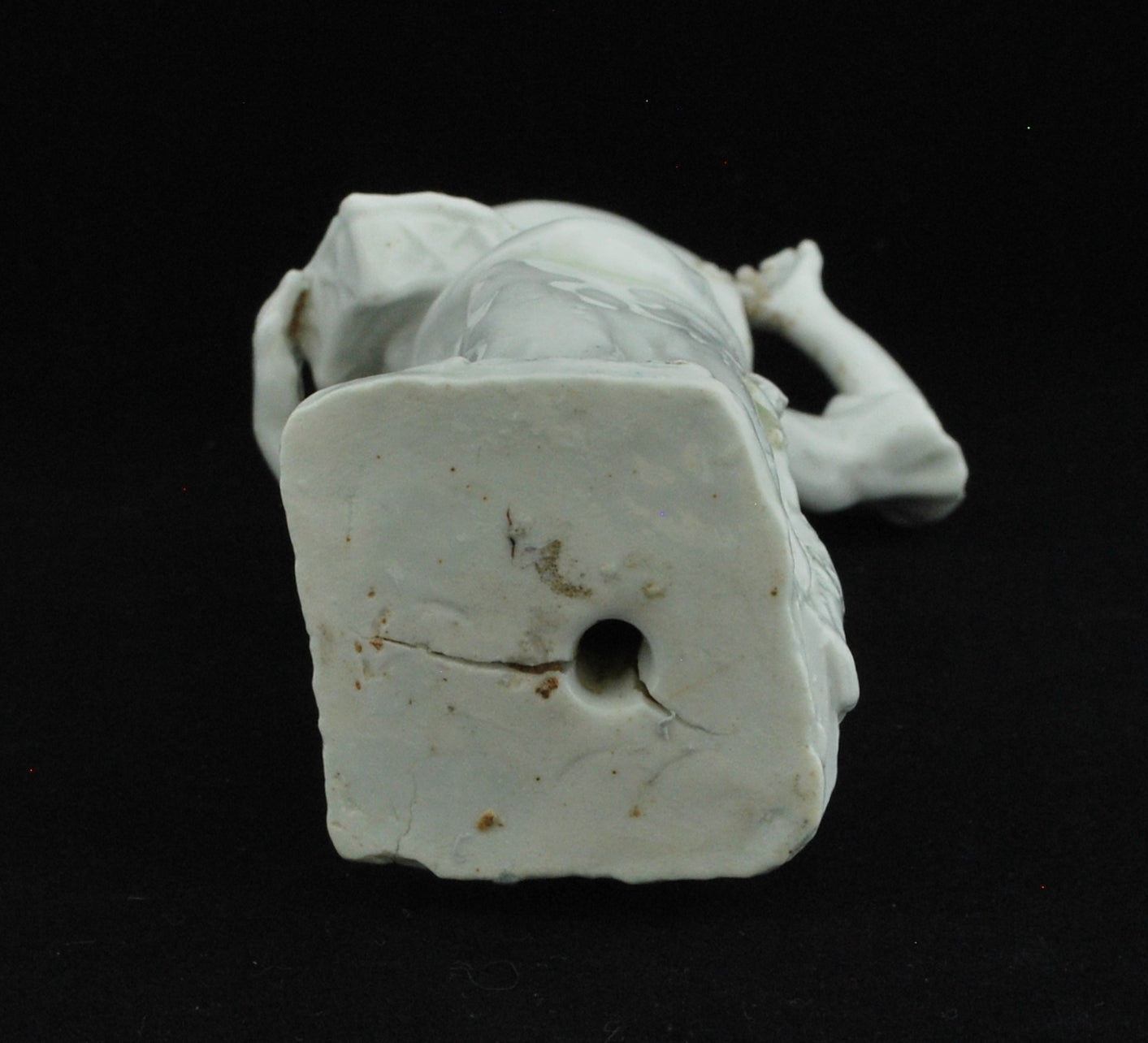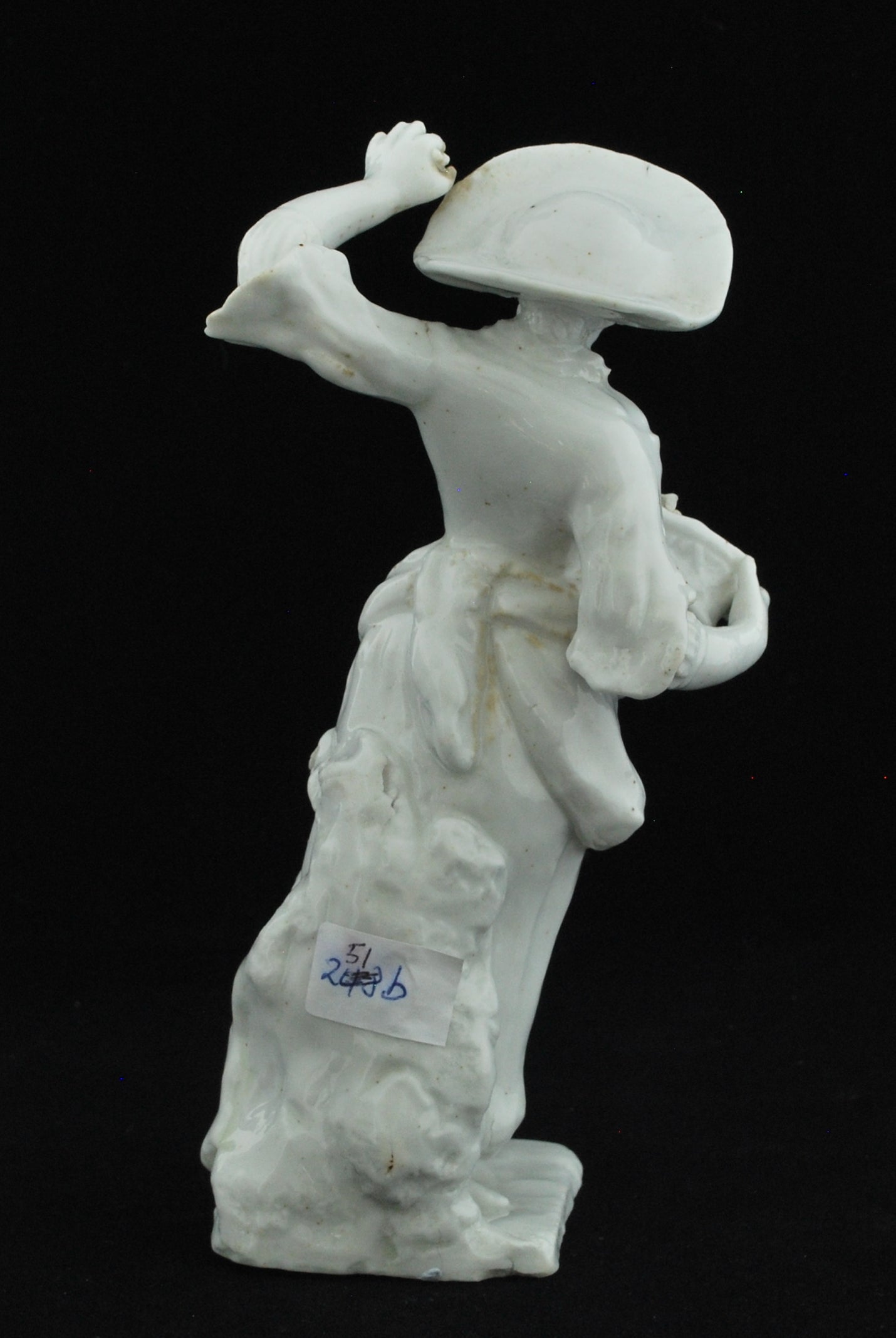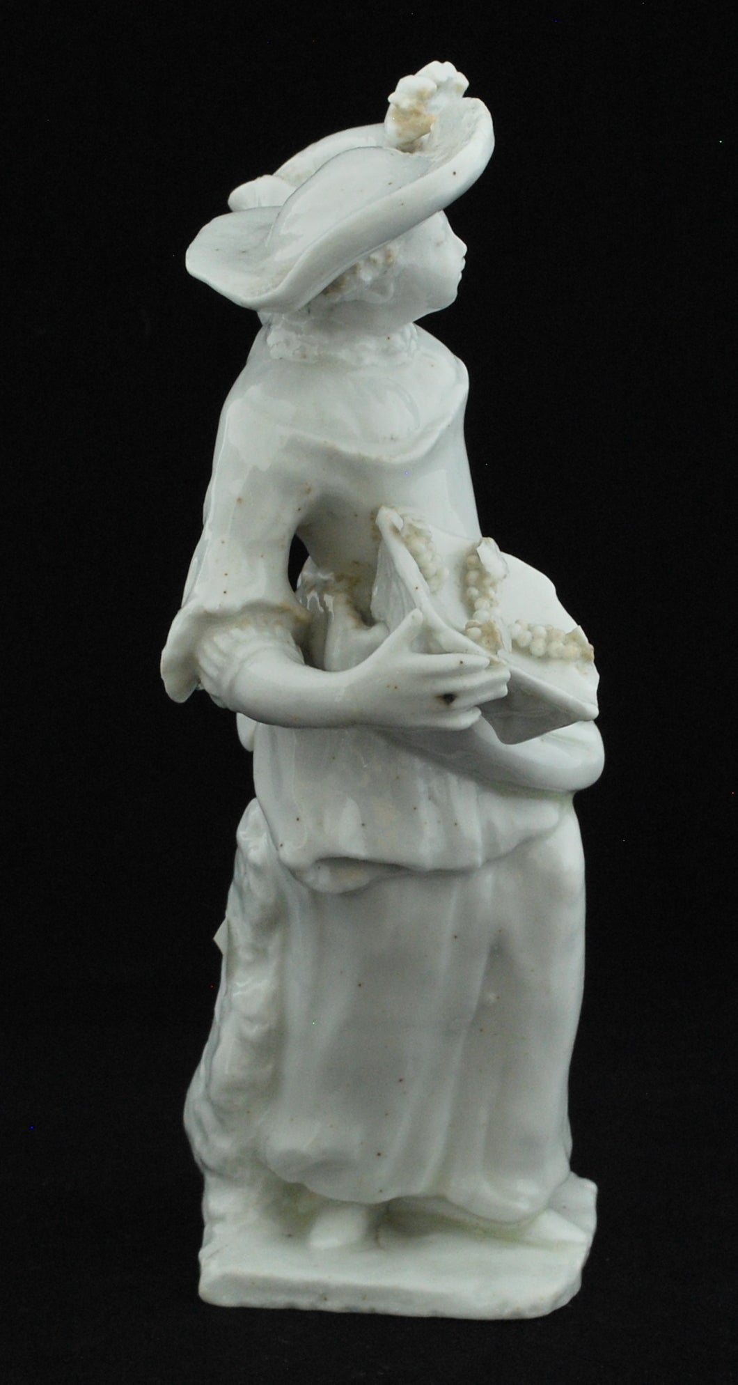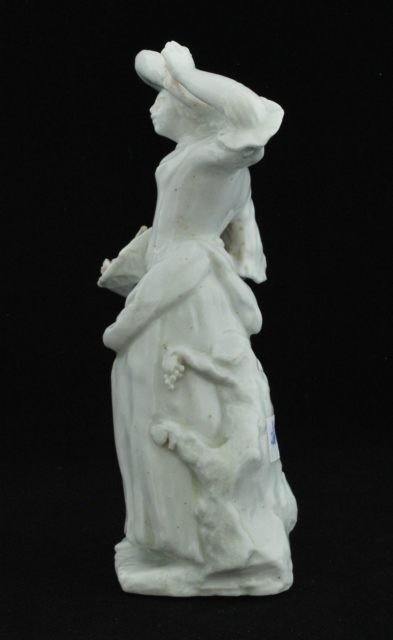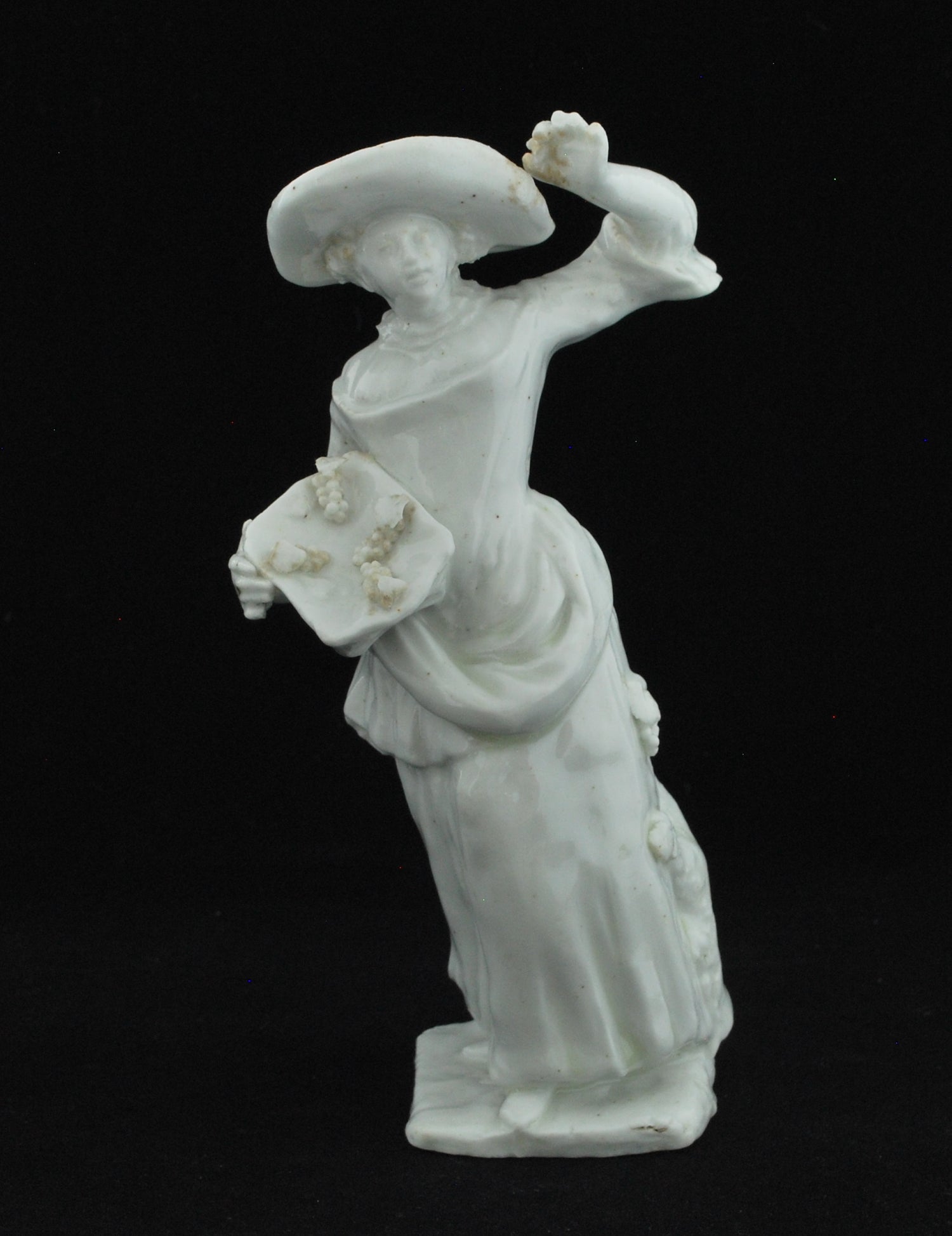 In the white: Young woman in a low-cut gown with puff sleeves and wearing a brimmed hat. She stands by a fruiting vinestock and carries a basket of grapes in her right hand, and raises a bunch of grapes (largely missing) in her left hand. Moulded in a dense body in typical muses modeller style and with slightly drab glaze. Straw translucency. Base partly wiped. H. 5.9 in (15.0 cm).