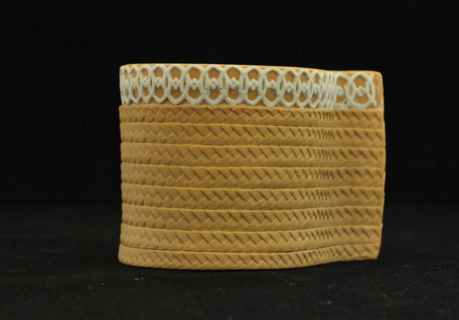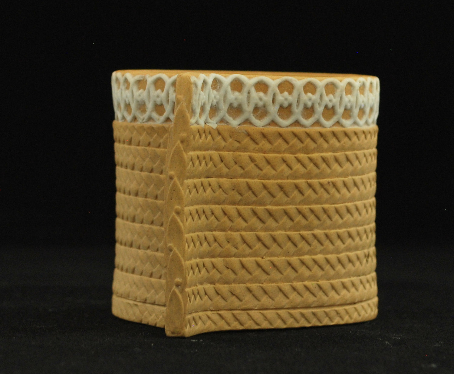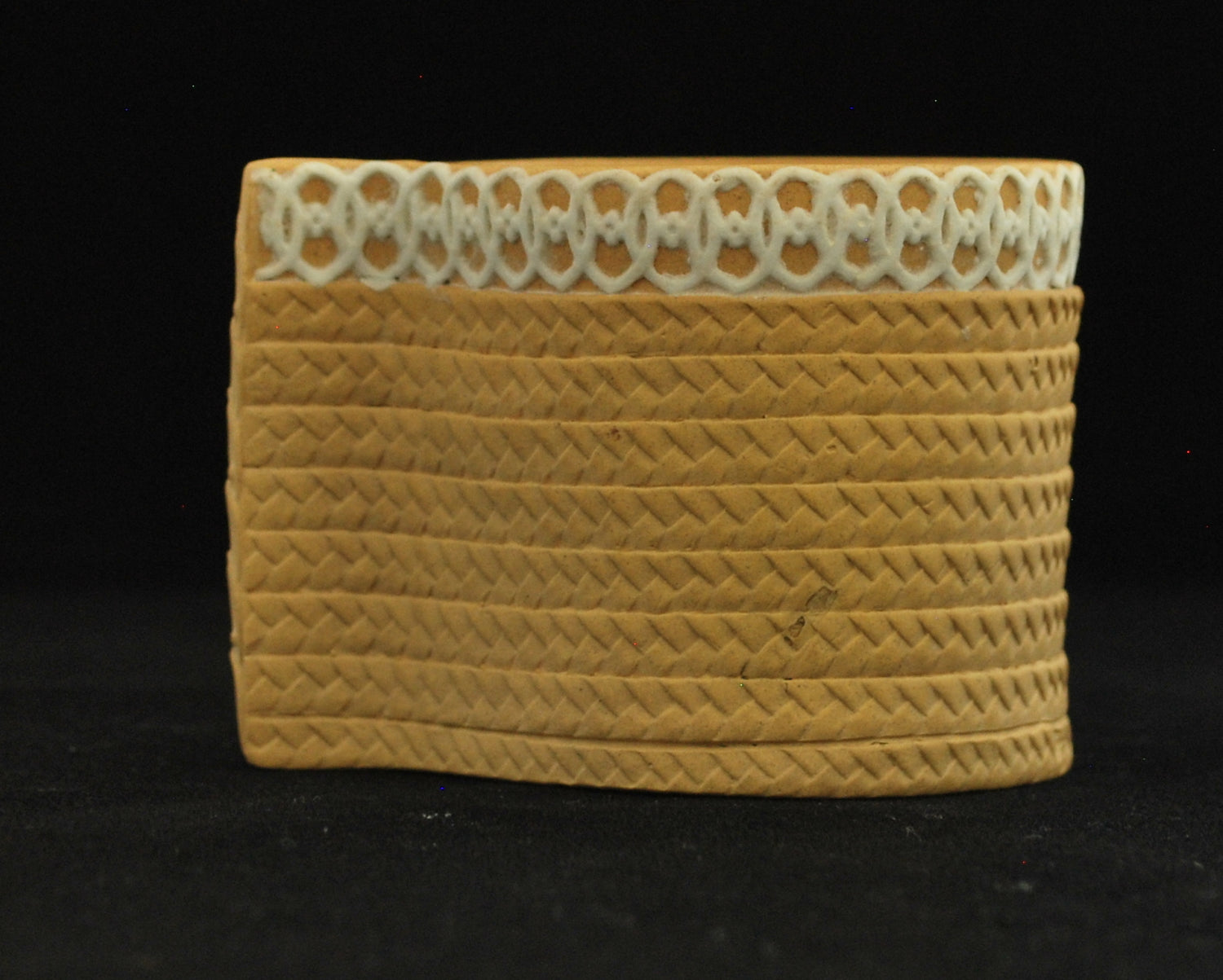 Caneware tear-shape cup with applied white decoration. Unmarked, probably Turner.