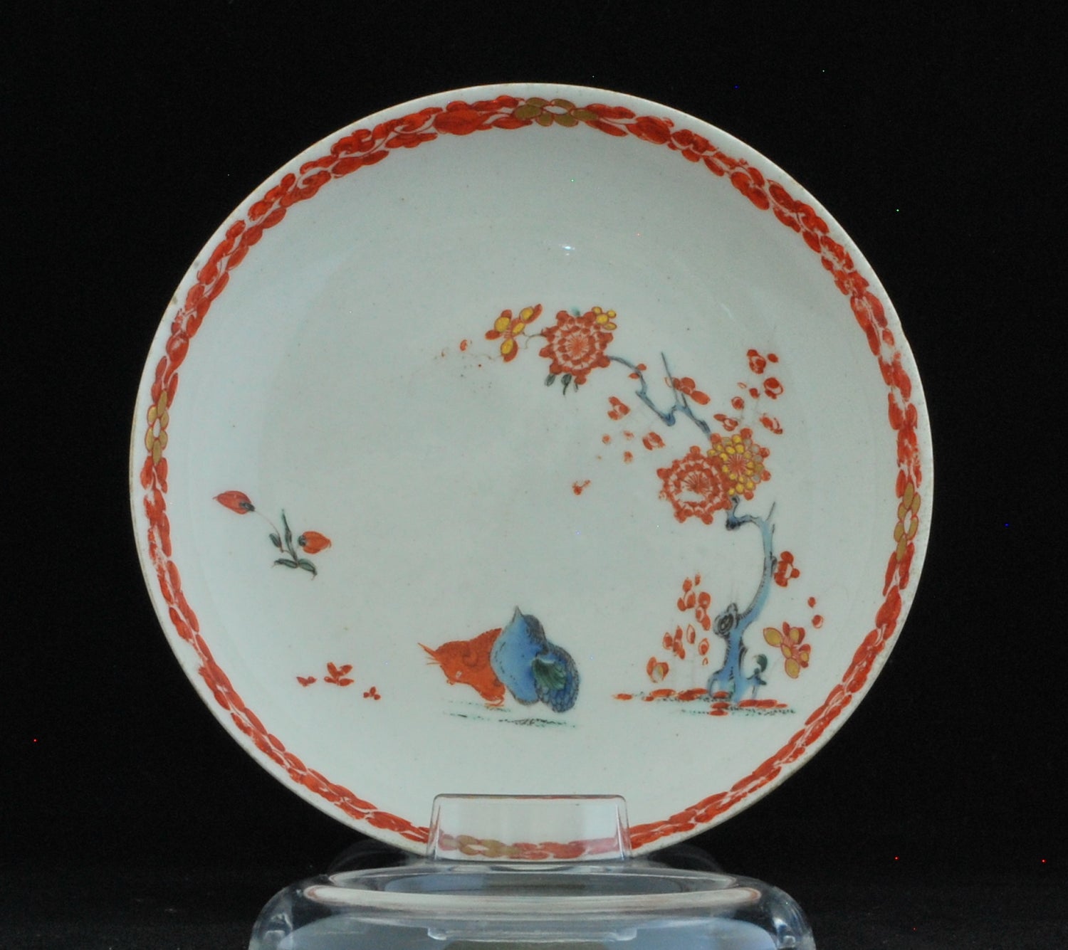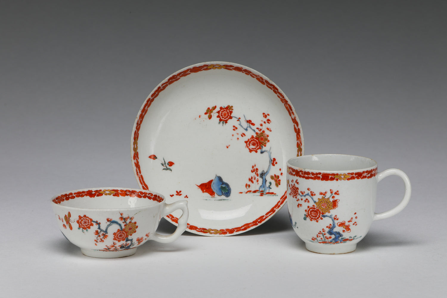Low tea cup with clip handle, with matching saucer, decorated after the Kakiemon with the Two Quail pattern. An unusual form with scarce decoration.