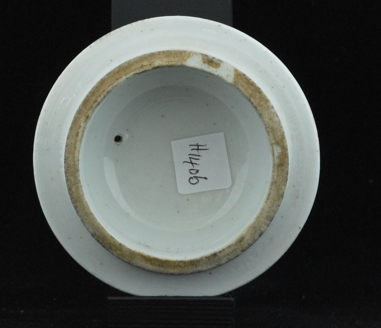 Typical early form with loop-handle, decorated in the famille-rose palette. Saltire cross inscribed on base.