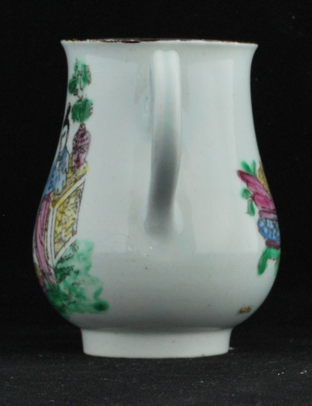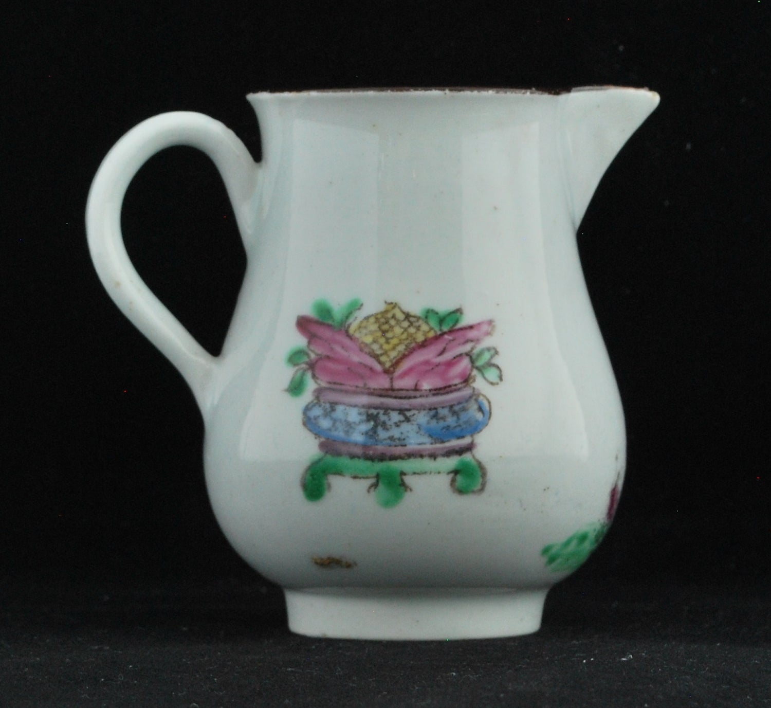 A small pear-shaped milk jug, with a transfer-printed outline, filled with wet enamels, in the Chinese Mating Chickens pattern; the rear with symbols of pomegranate, leaves and censer.