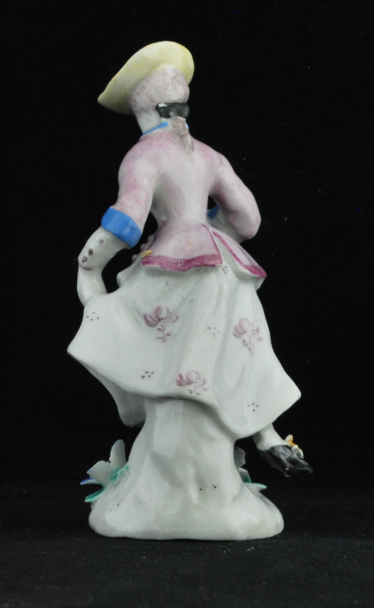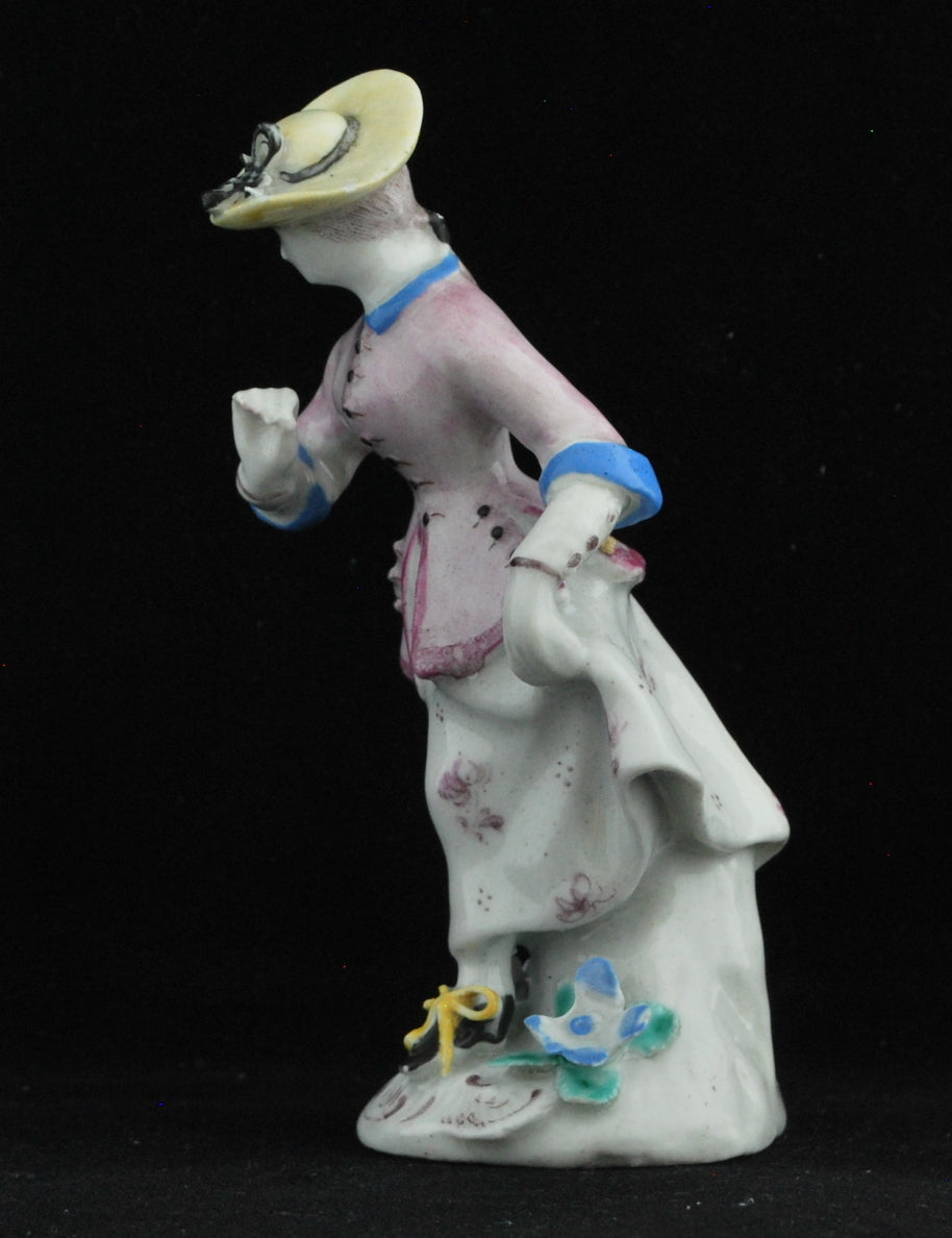 Small figure of a young woman wearing a puce-sprigged white skirt, lifted slightly with her left hand, pale pink jacket with typical Bow opaque blue collar and cuffs.