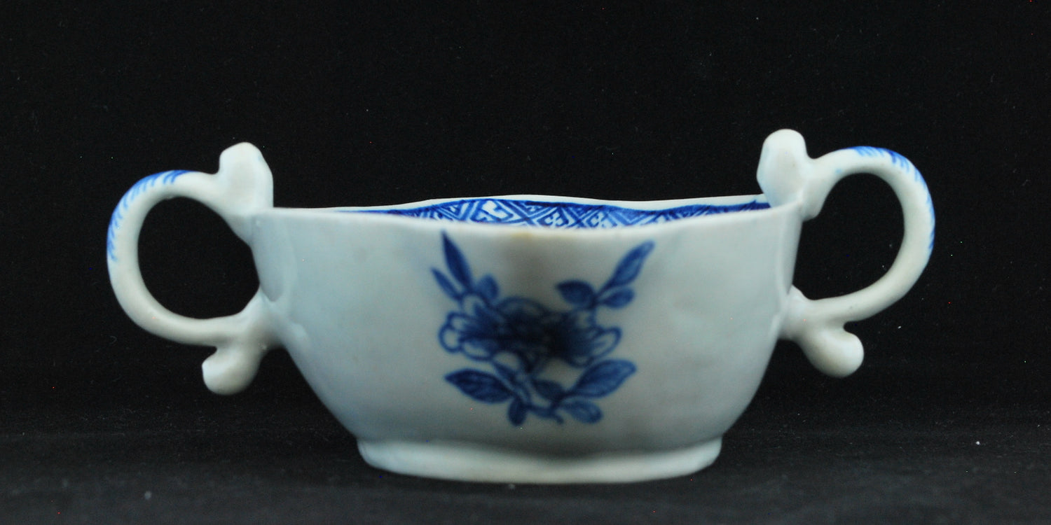 Of silver form; oval, double lipped, and with scroll handle with stylized mask to each side. The interior painted in blue underglaze with a songbird on a branch, a peony and an inner rim diaper border. The exterior of each lip painted with a leafy floral spray; the handles with feathering. L.7.1 in (18.0 cm).