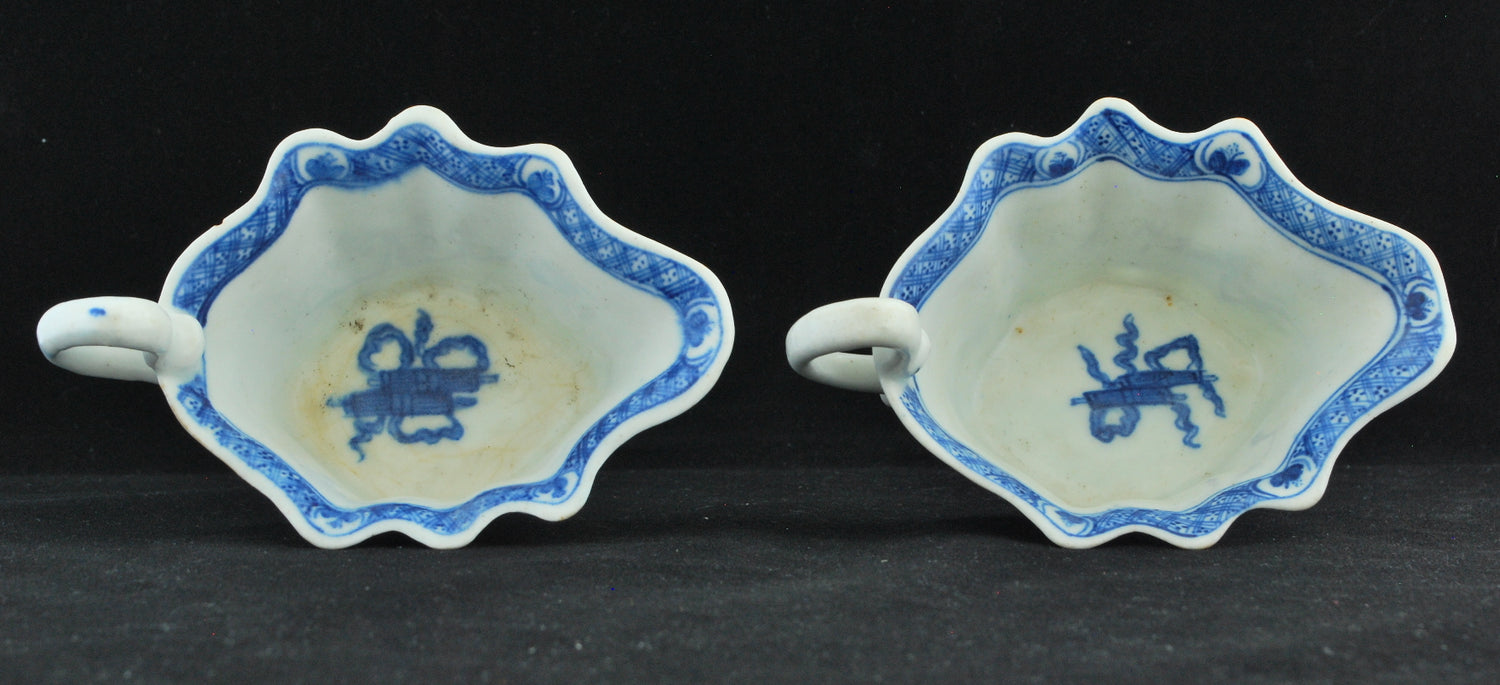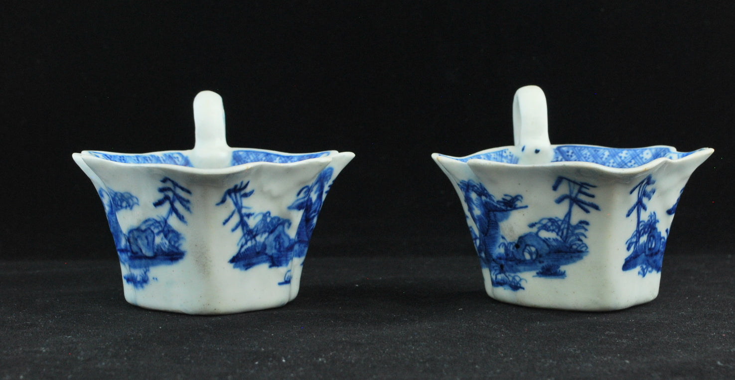 Of flat hexagonal form with waved top and scroll handle, painted after the Chinese in blue with the ‘desirable residence pattern’ of a building amidst rocks and trees; the interiors with hatched borders. Grey-straw translucency. Blued glaze. H.2.5 in (6.4 cm); L.4.8 in (12.1 cm).