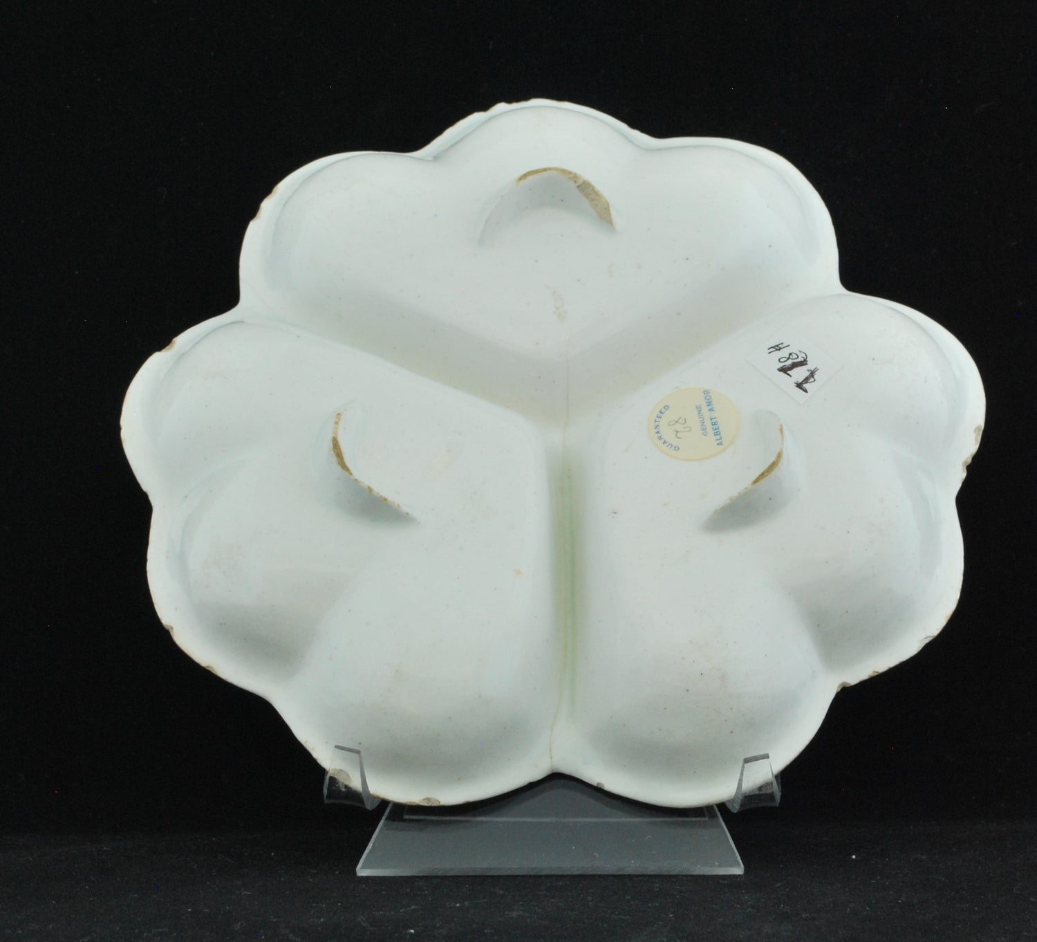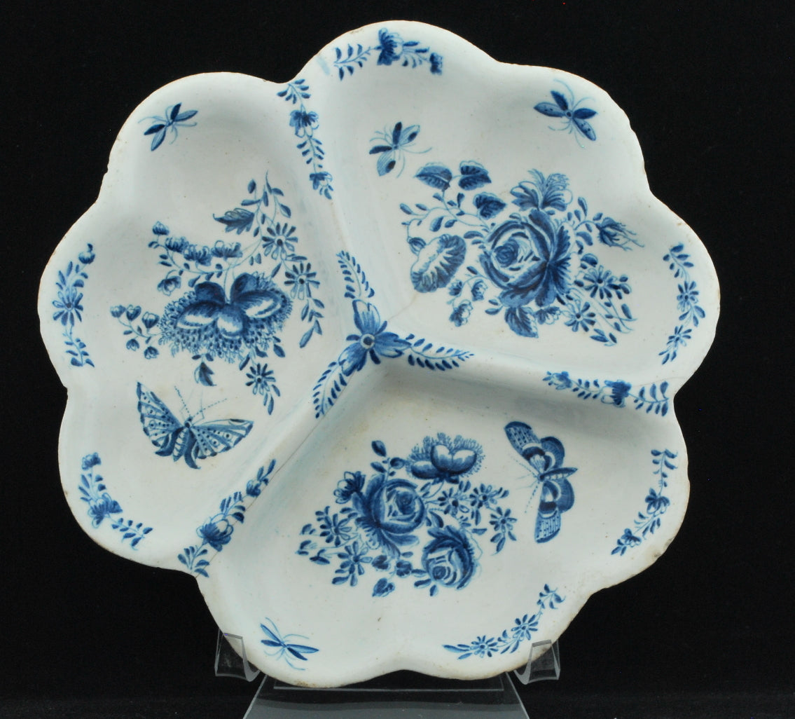 Circular, probably for sweetmeats or hors d’oeuvres; divided into ‘triangular’ sections painted in blue underglaze with European flowers and butterflies.