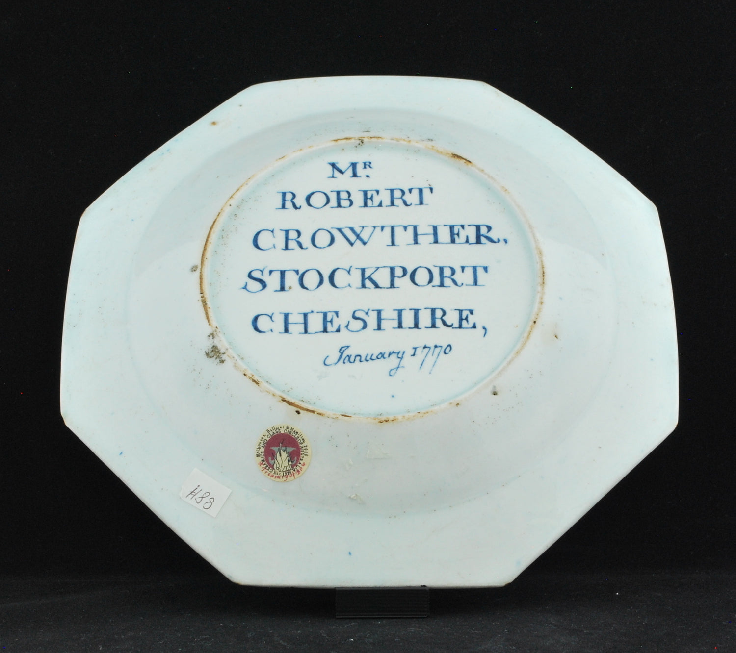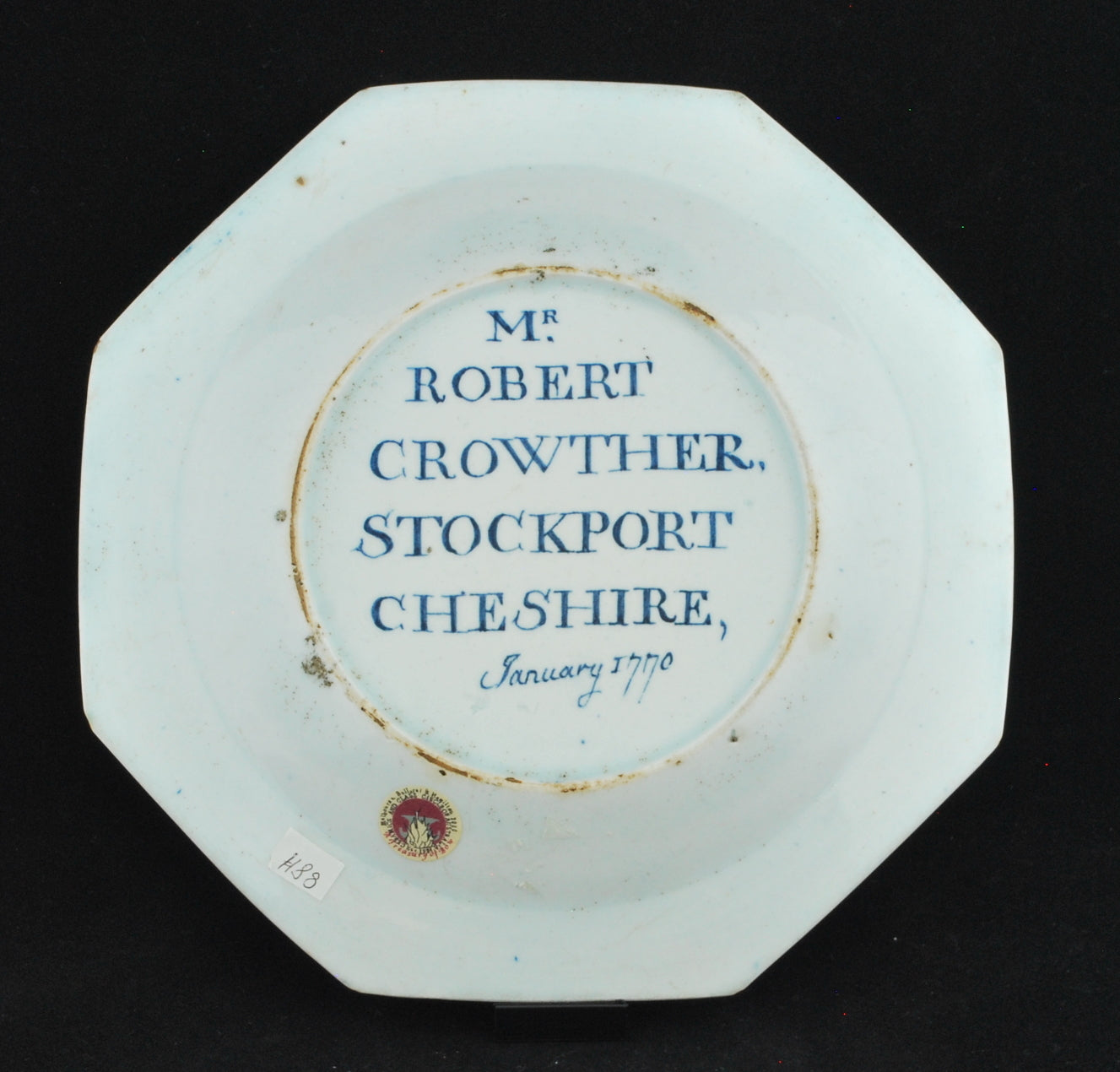 The underside in blue underglaze with the inscription ‘MR. ROBERT CROWTHER, STOCKPORT CHESHIRE, January 1770’. Grey-white body with blued glaze. No discernible translucency.