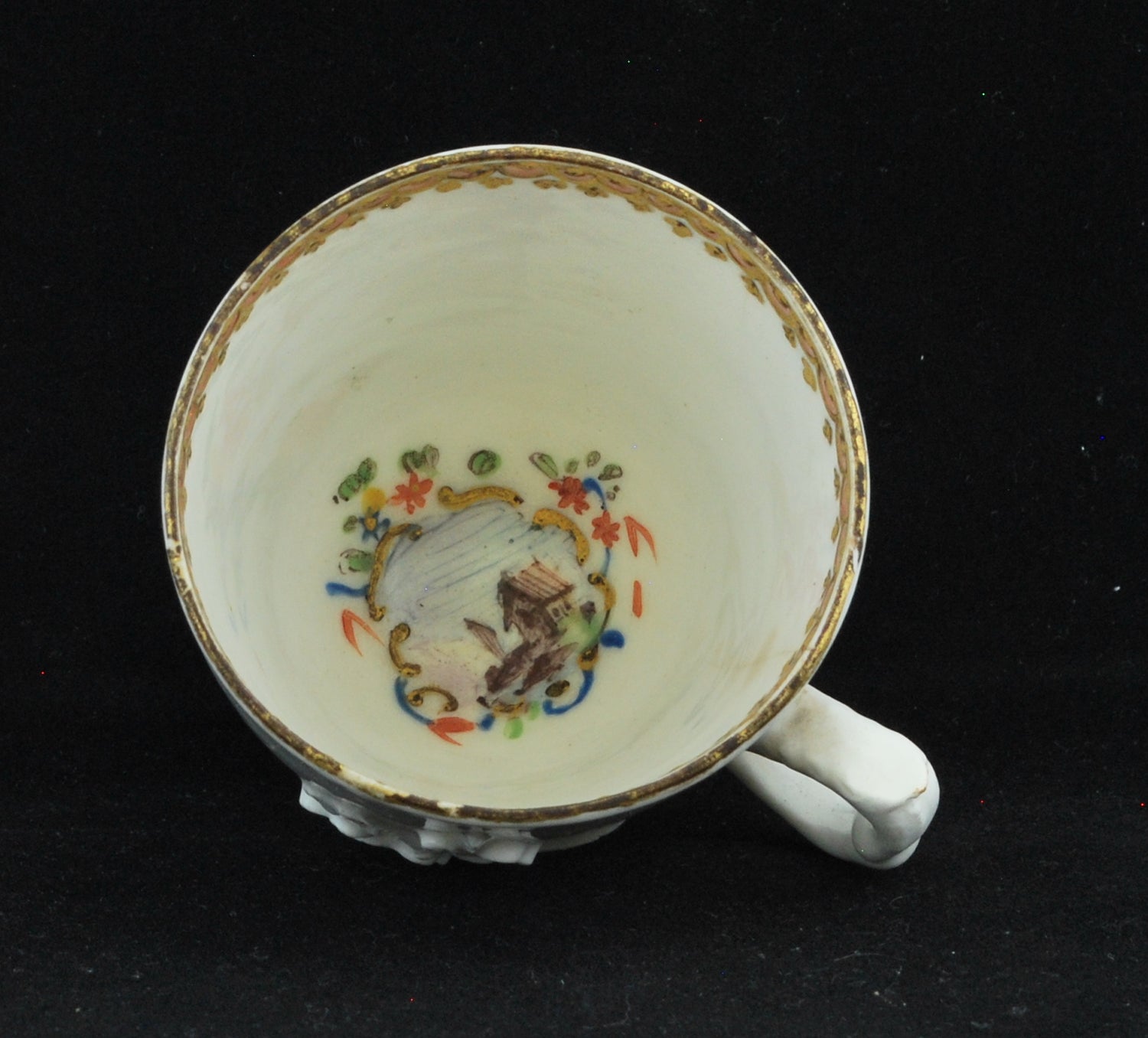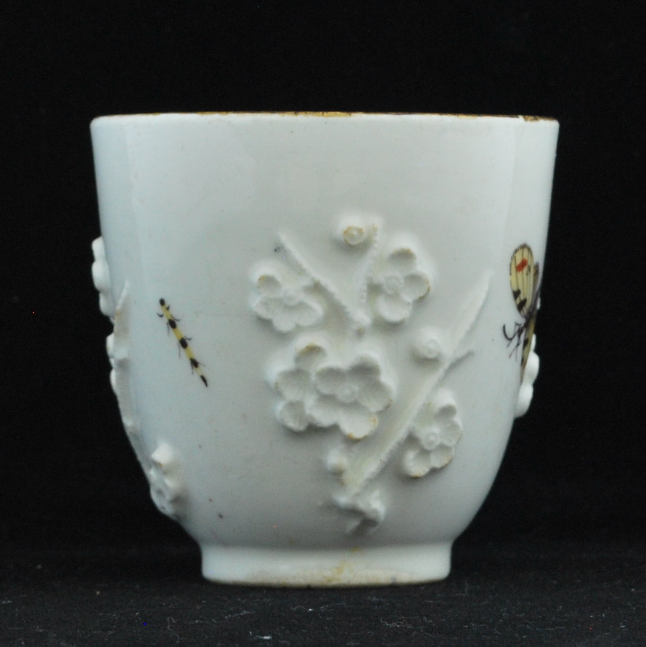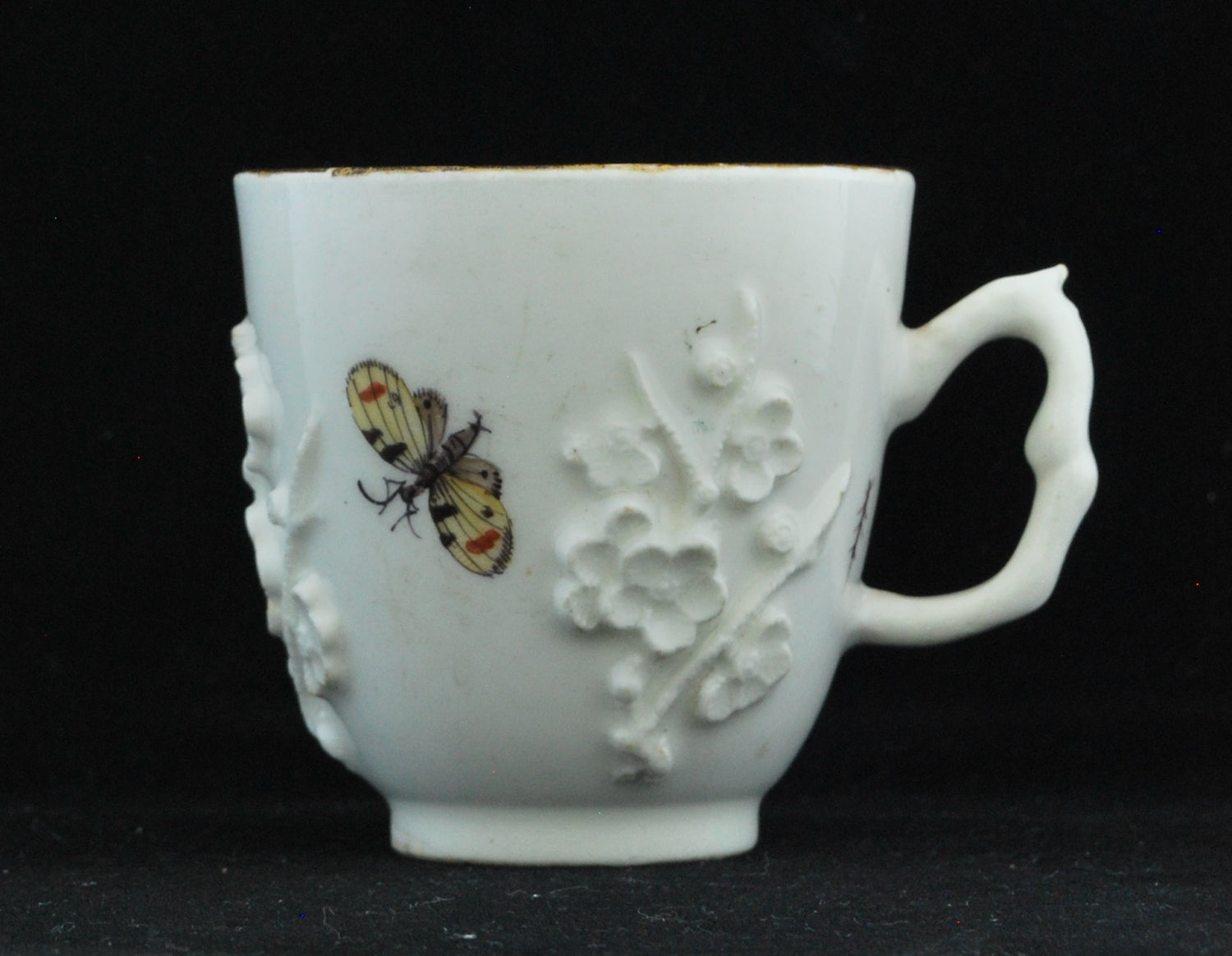Coffee Cup, circa 1752: White sprigged cup with high footrim and double scroll handle. The body with applied prunus sprigs and painted on the outside with moths and insects, and on the inside painted with a scene of European buildings within a foliate cartouche, all in coloured enamels. H. 2.5 in (6.4 cm).