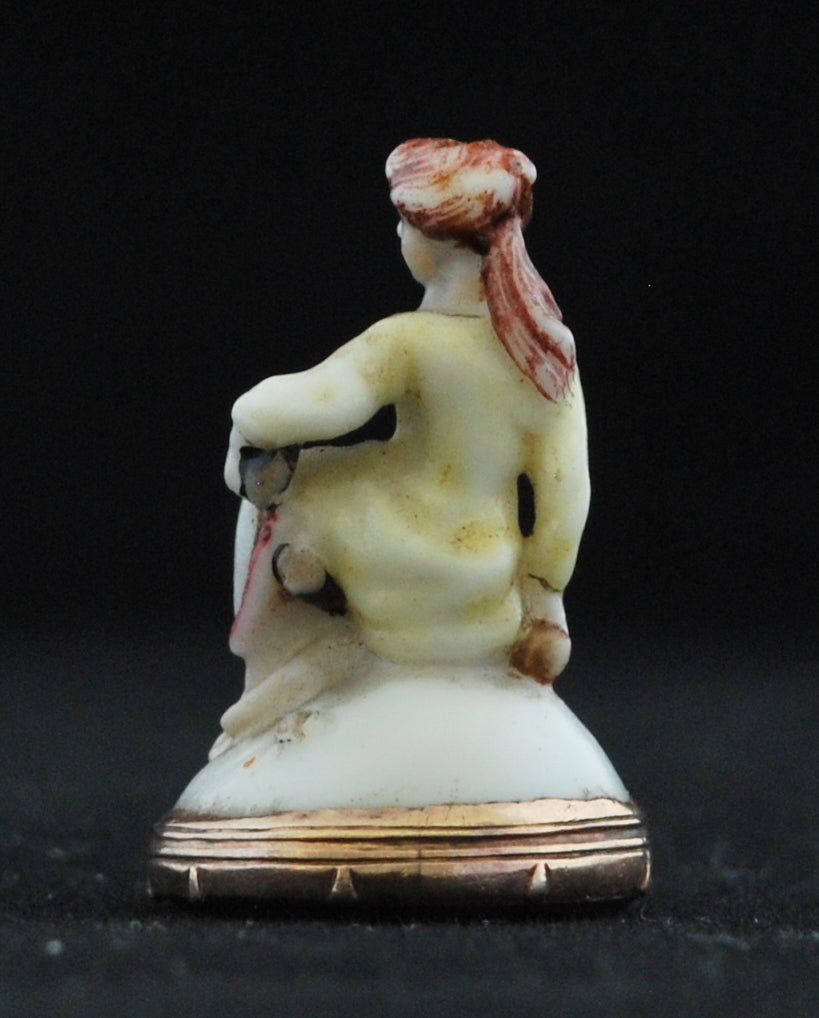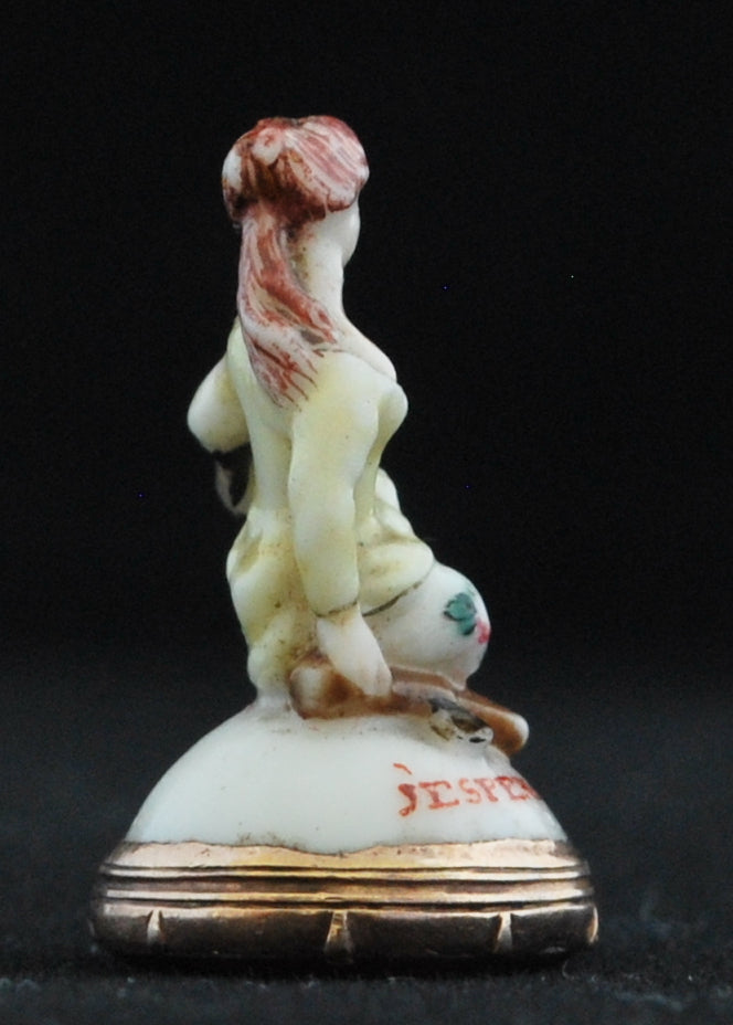 Small seal in the form of a seated woman, polychrome decoration with a French inscription – I still hope.