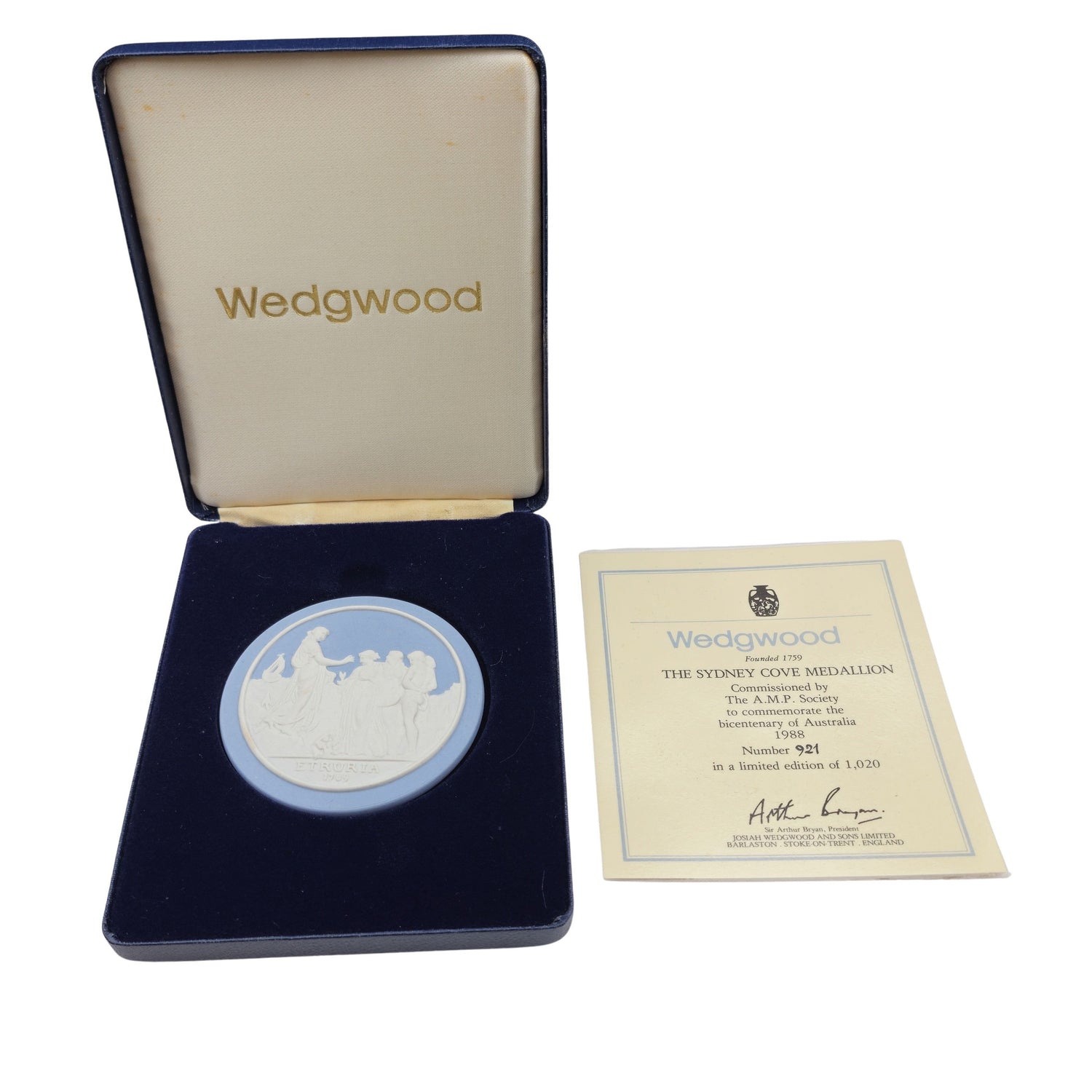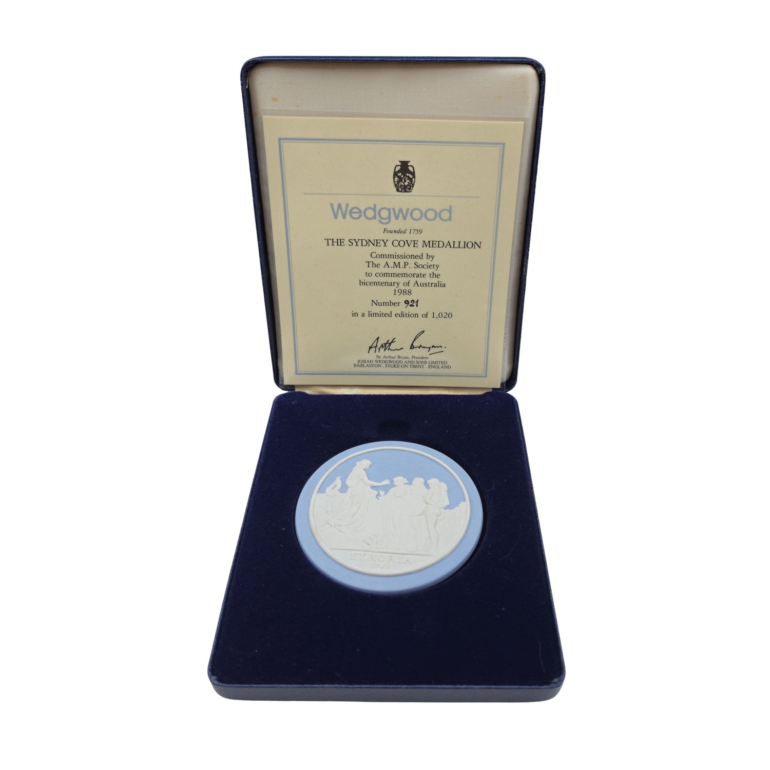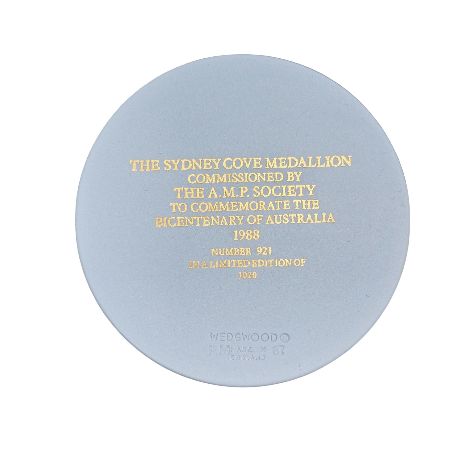 Boxed Sydney Cove Medallion. From an edition commissioned by AMP to mark the Bicentenary in 1988. Not sold, but awarded to employees.