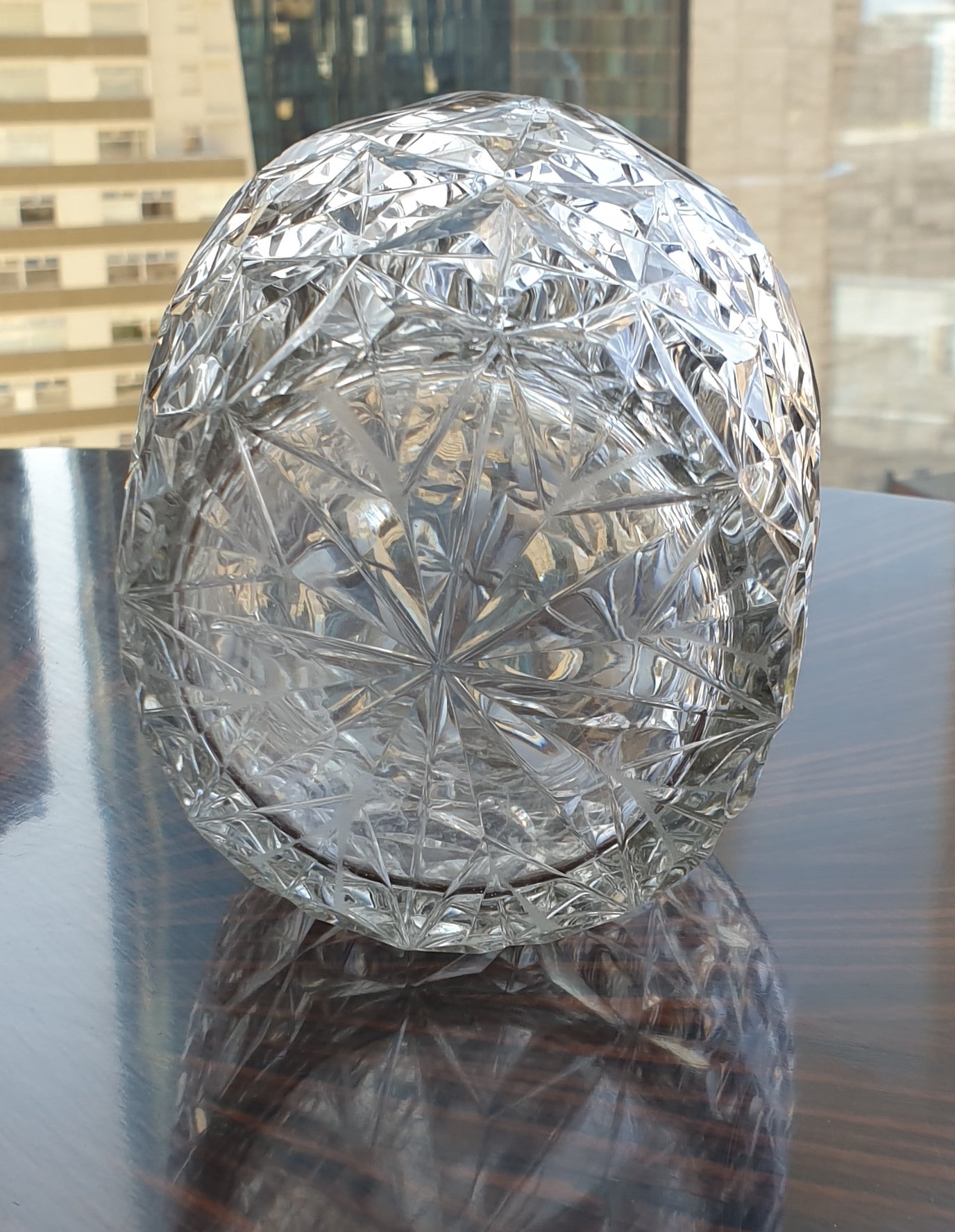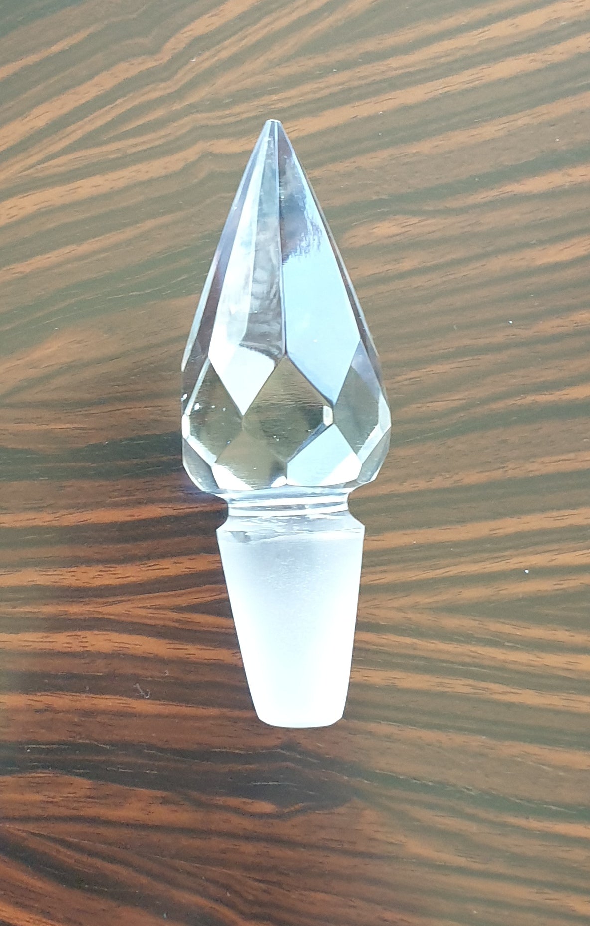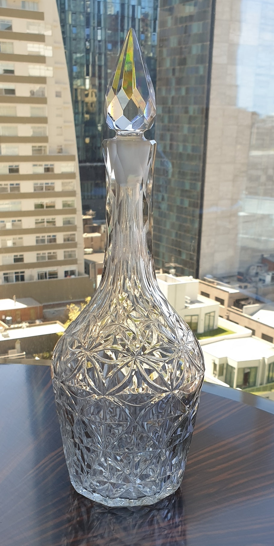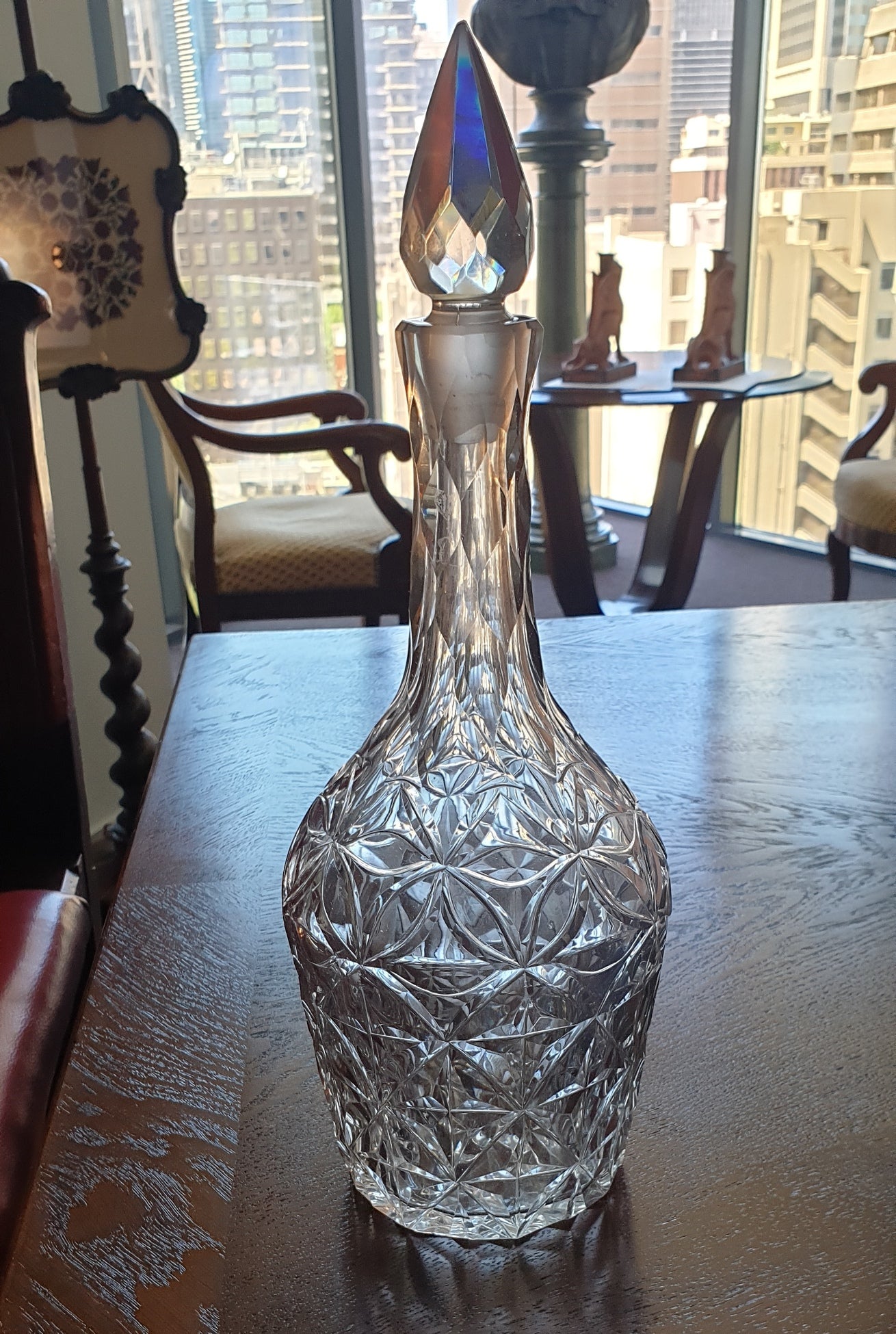 An Indian Club shaped decanter, decorated with wheel-cut interlocking circles.