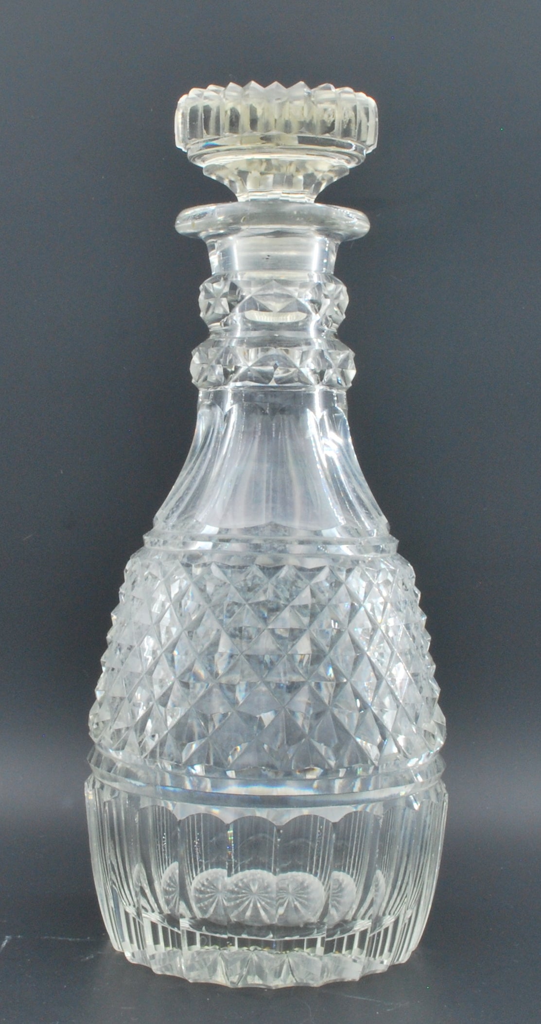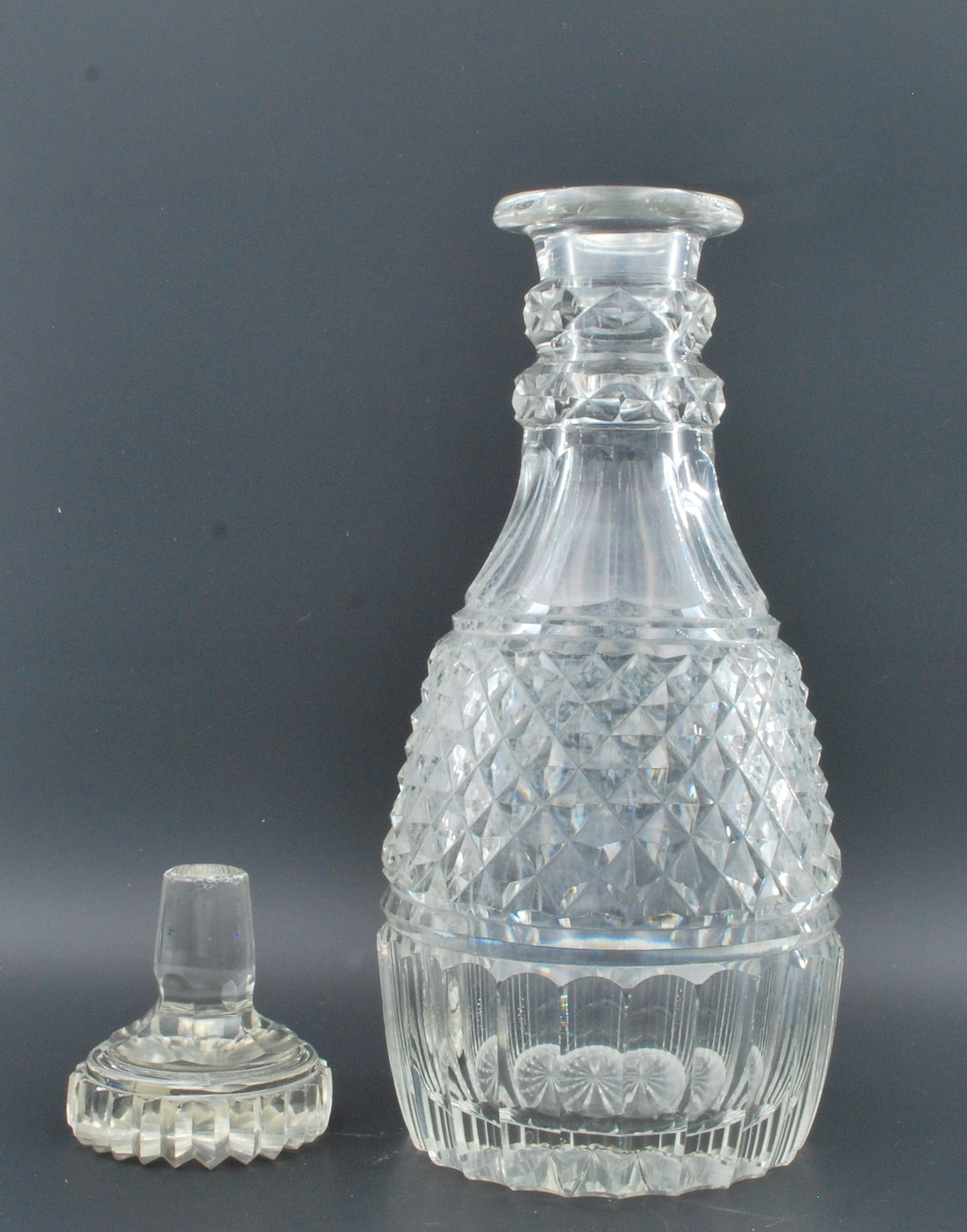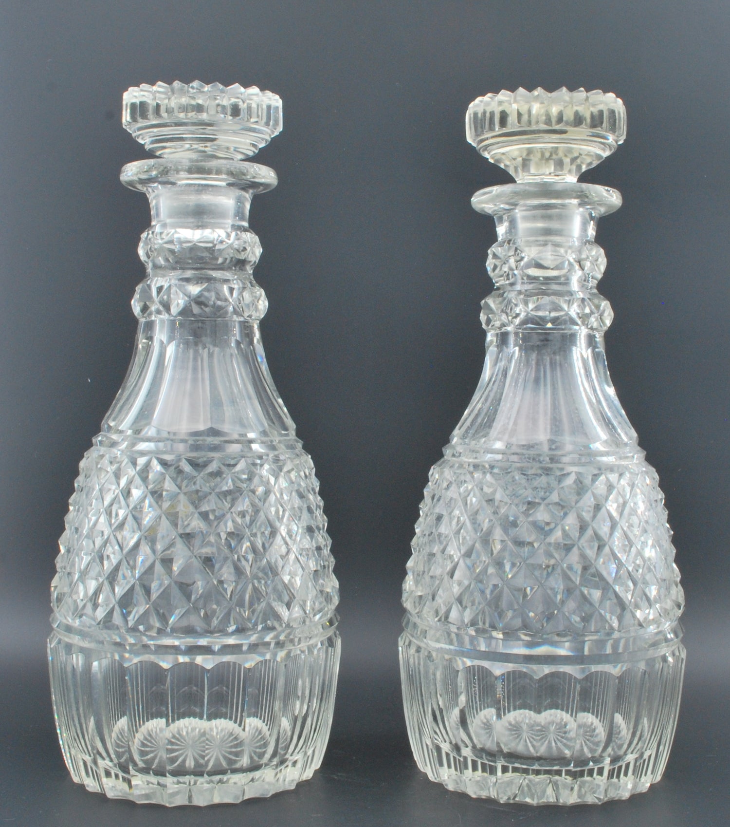 A good pair of mallet-shaped decanters, with two diamond-cut rings to necks, fluting and diamond-cuts to bodies.
