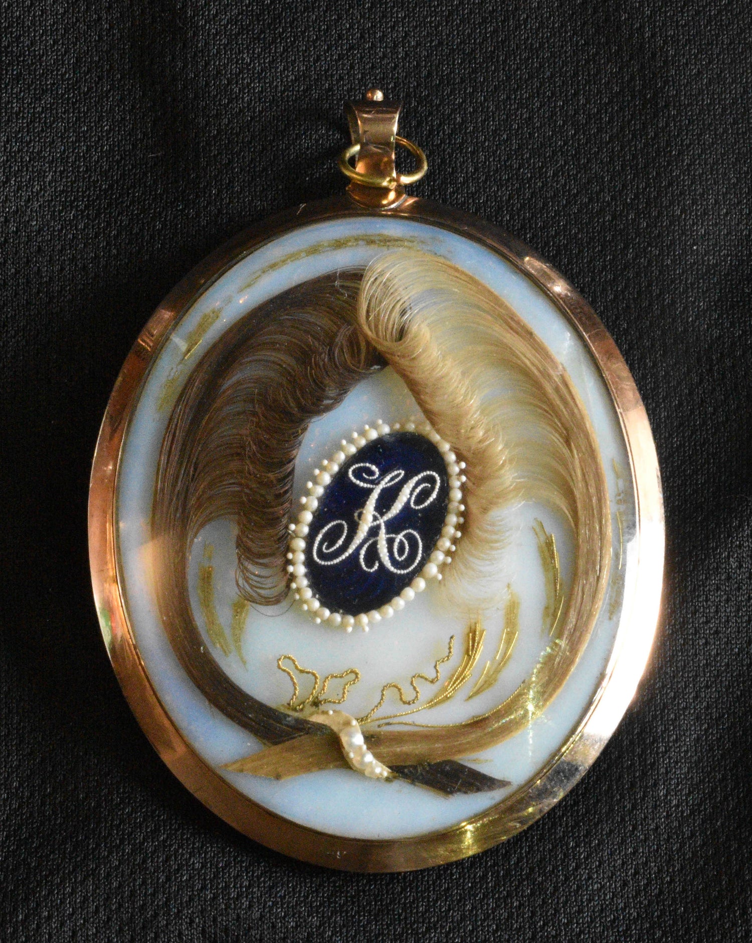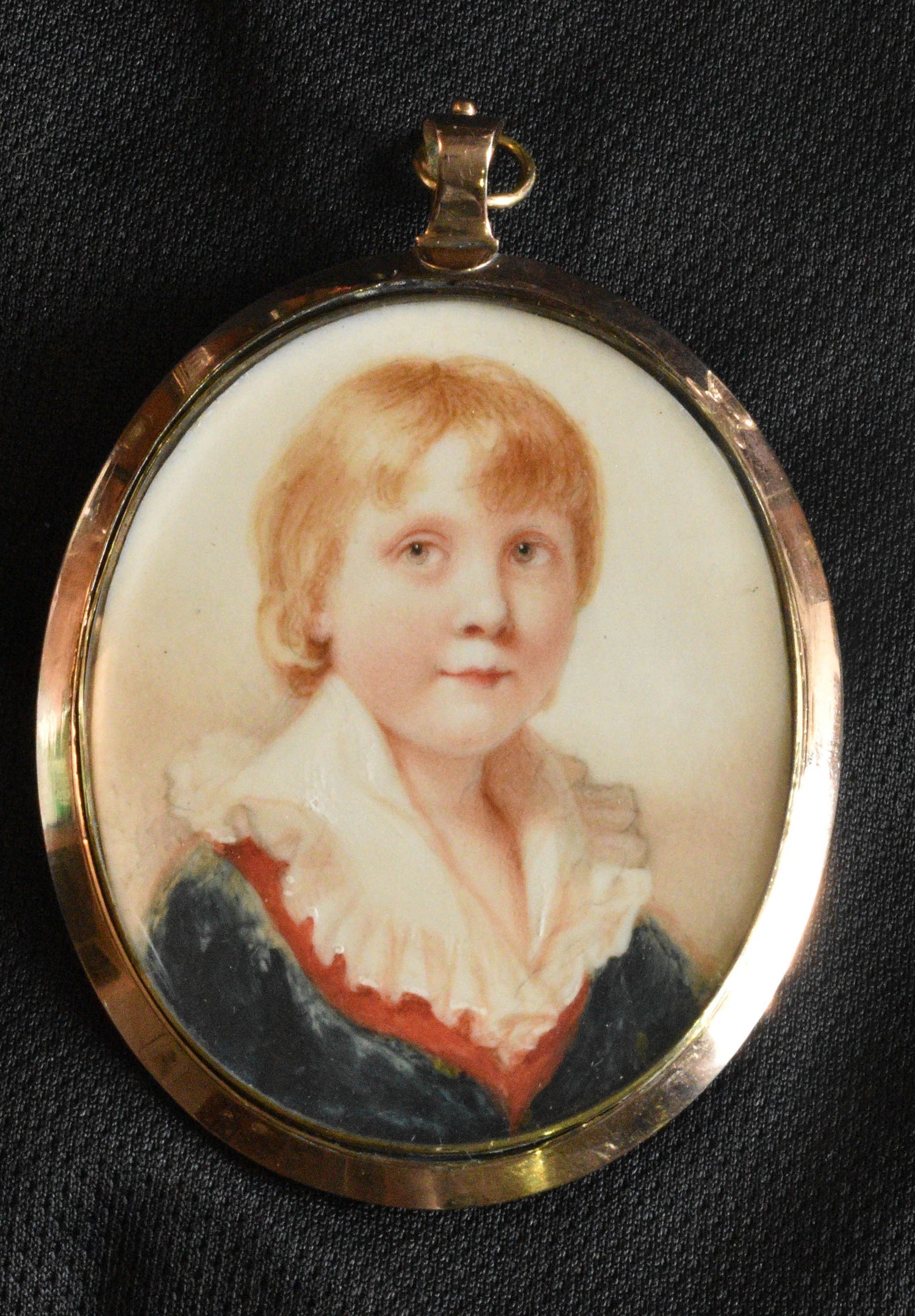 Portrait on ivory of a boy by Abraham Daniel. Gold frame, with an elaborate back featuring a K monogram, pearls, and two colours of hair, probably mother and child's.