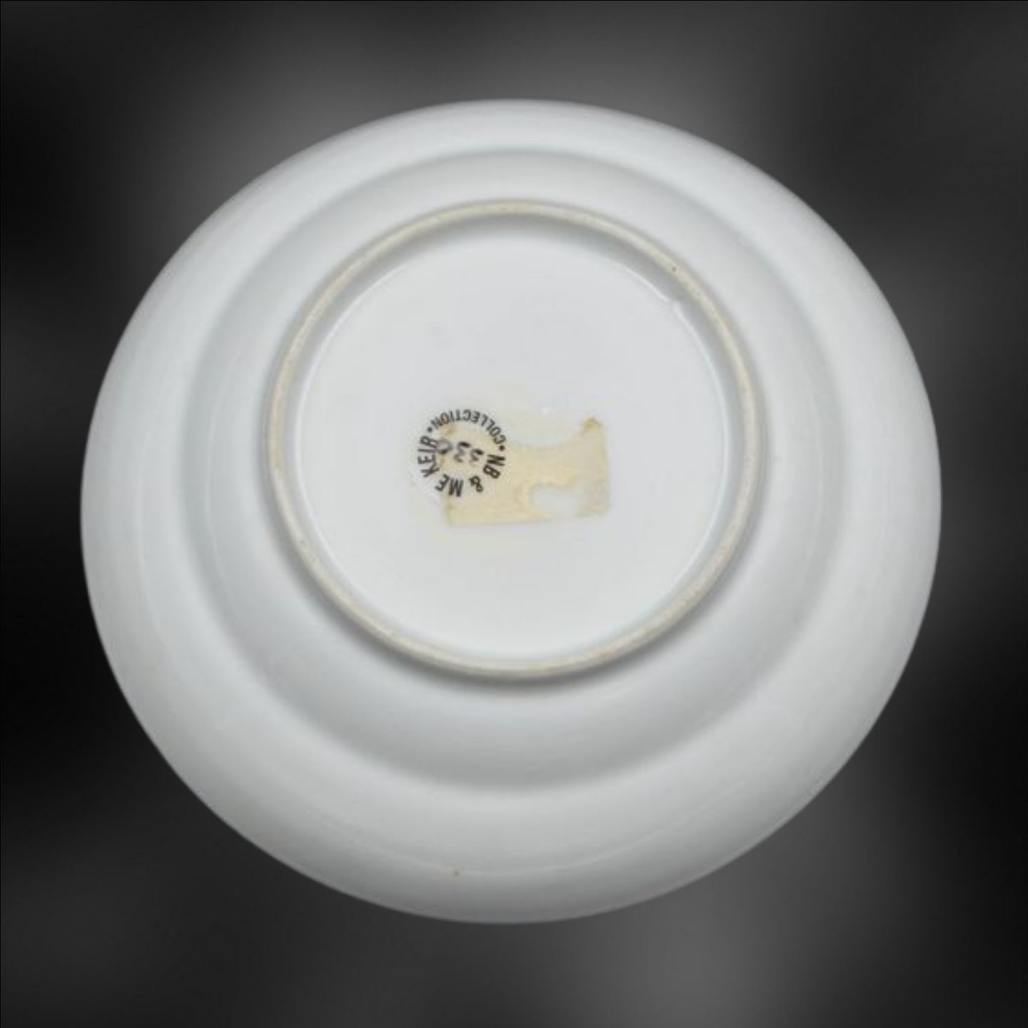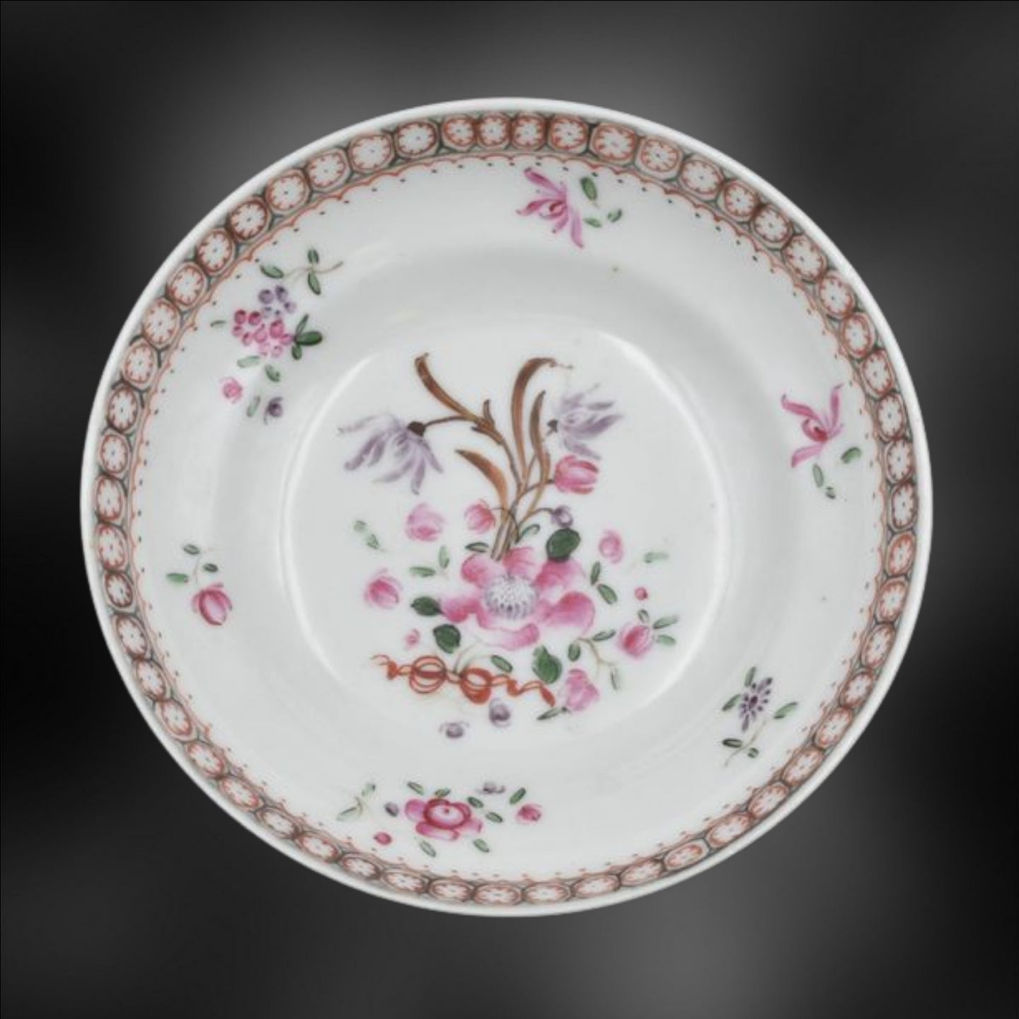 Deep saucer painted in over-glaze enamels in pink, aubergine, green, brown and iron red central flower spray and scattered flowers.The border has continuous circular pattern.
