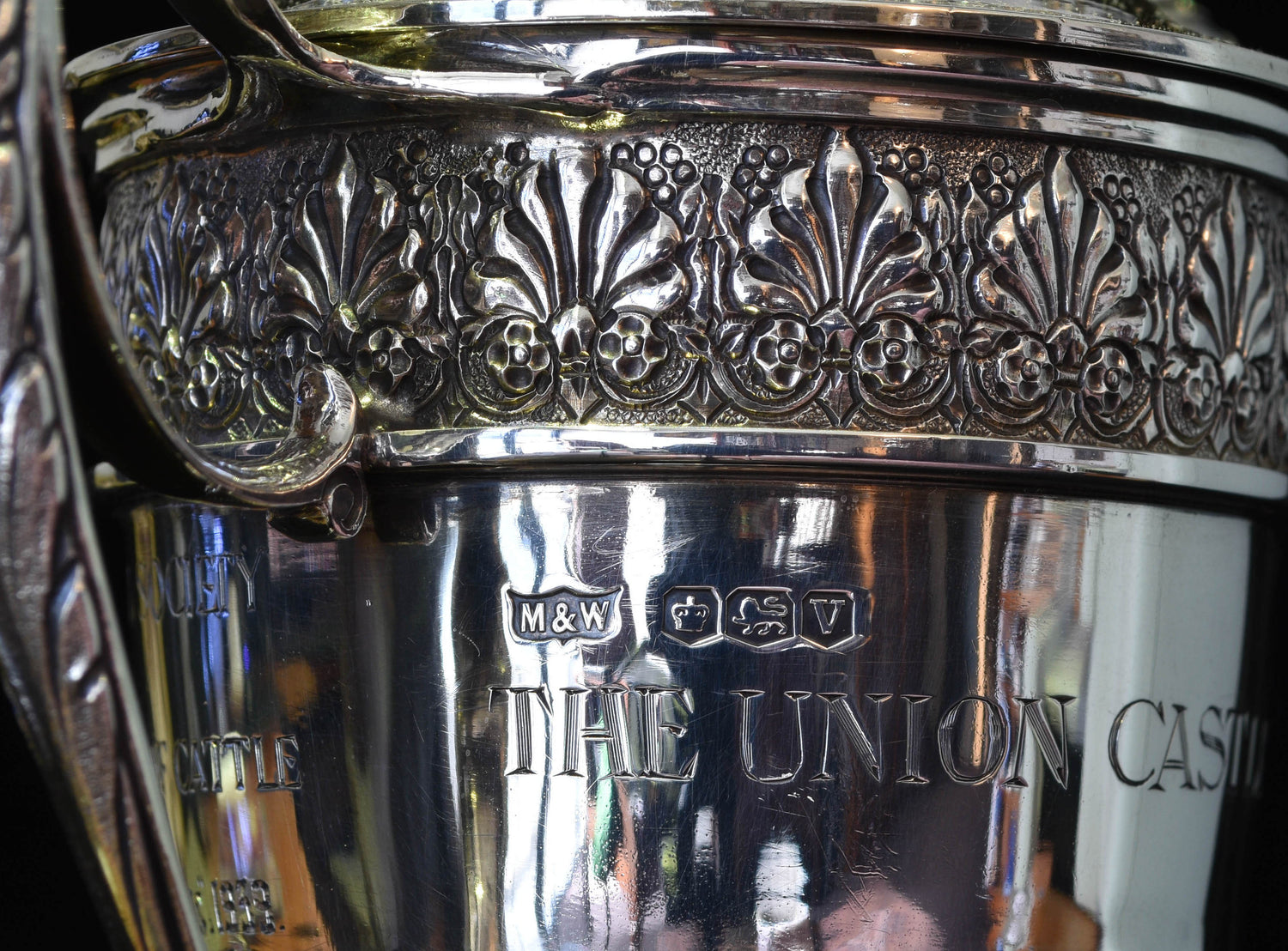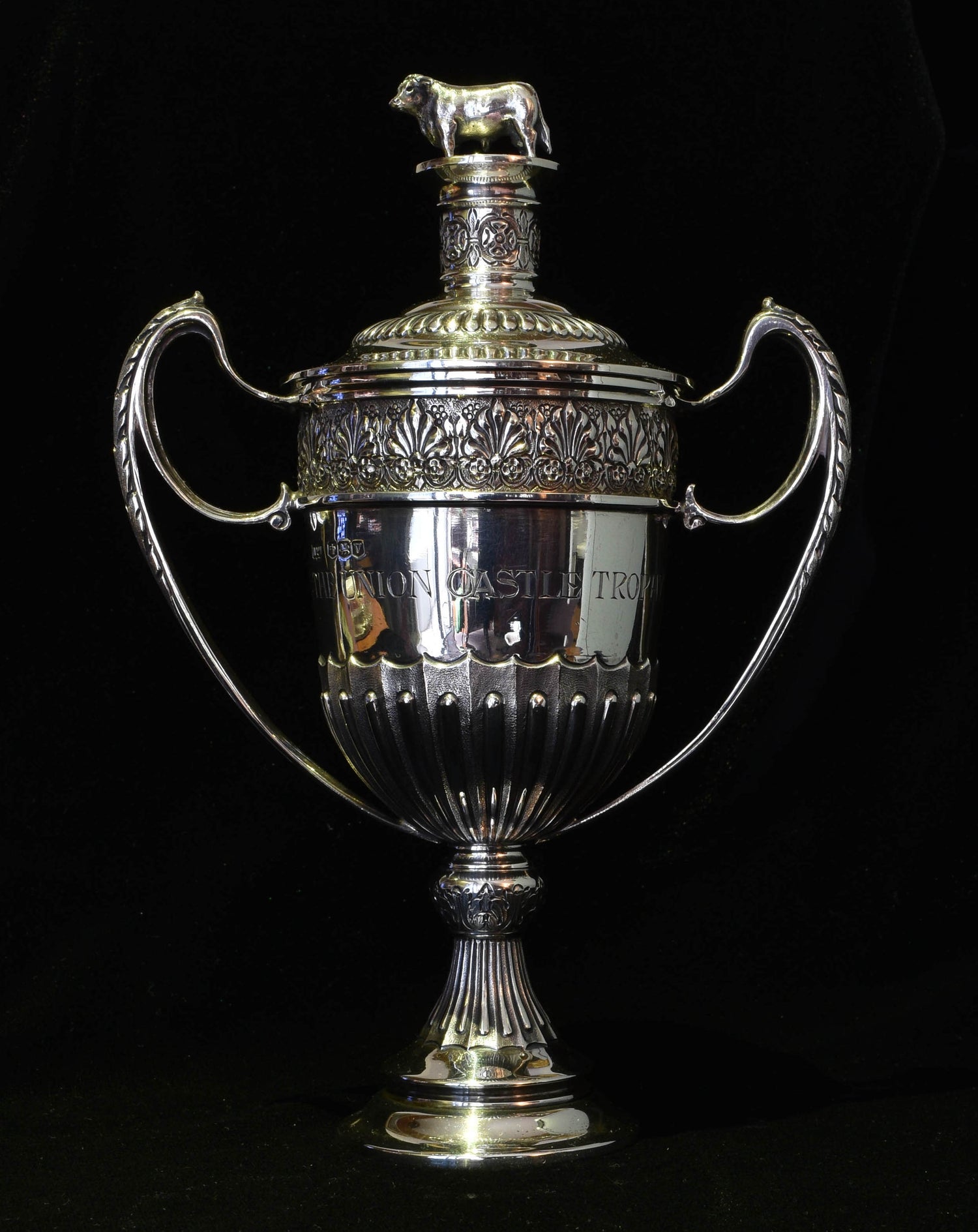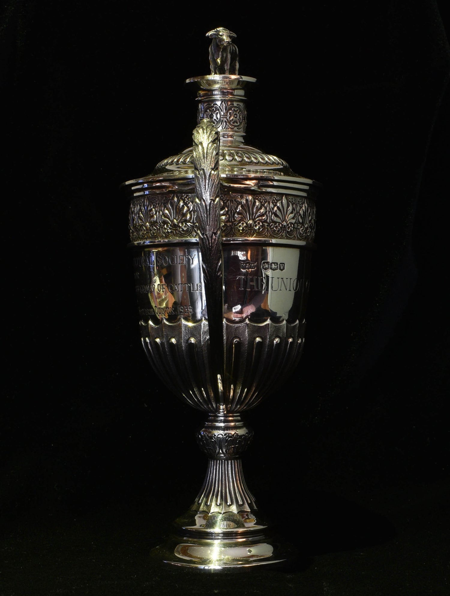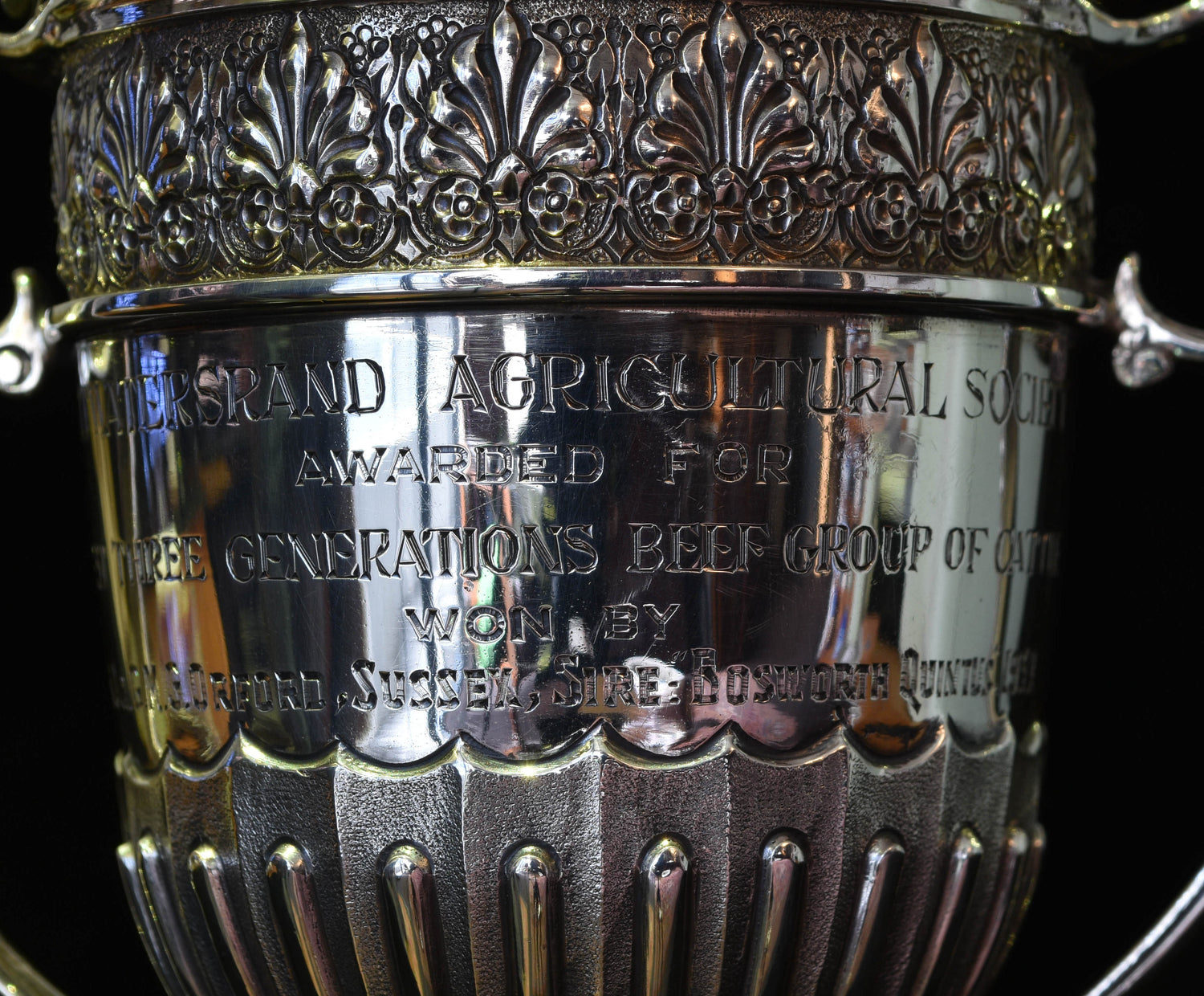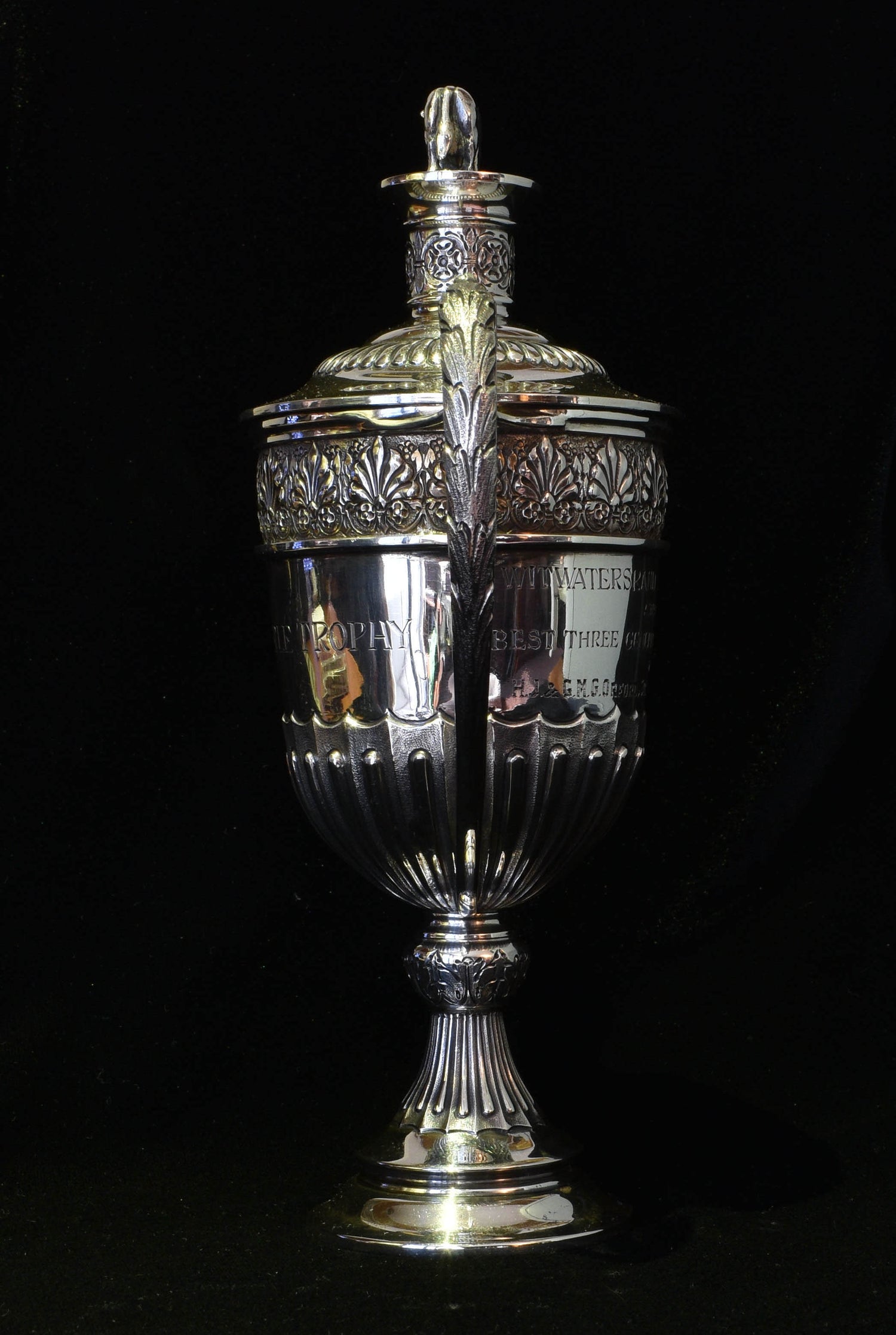 A finely wrought covered trophy cup in sterling silver, with chased inscription: