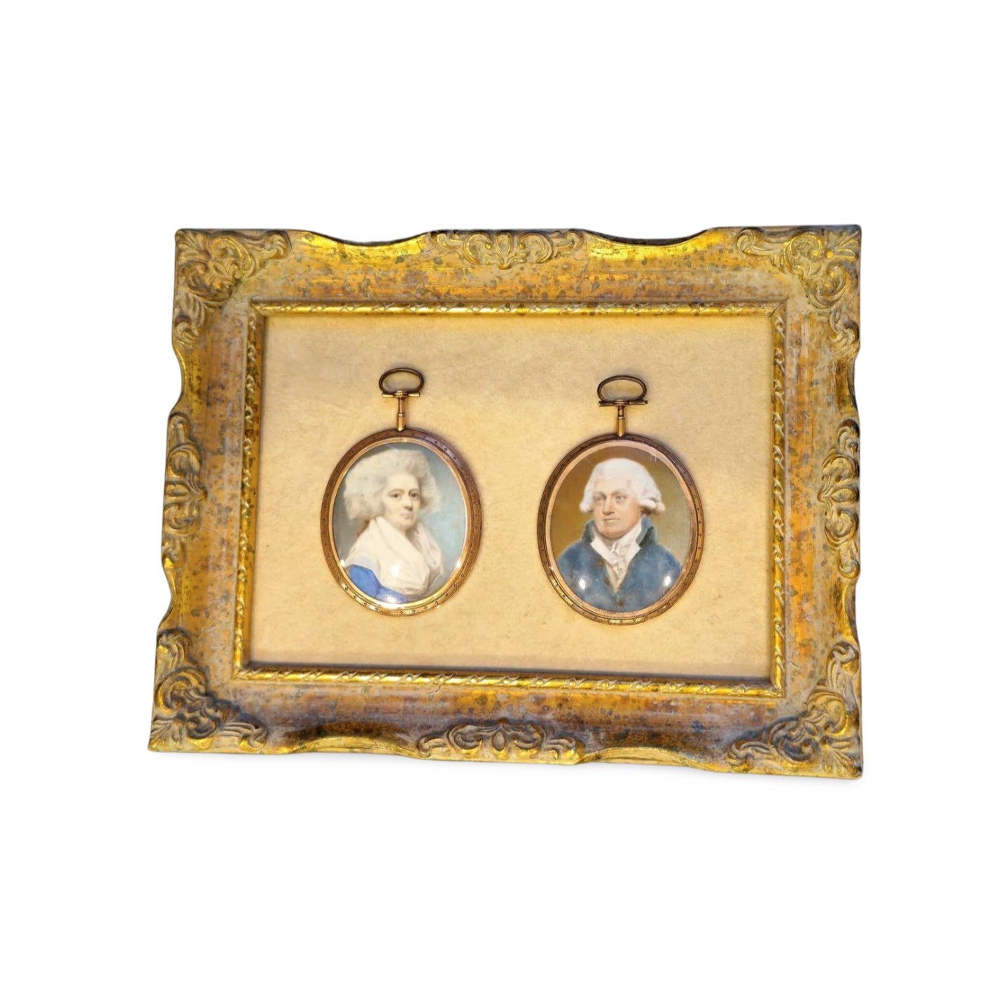 A very fine pair of miniatures on ivory, attributed to Charles Shirreff, a deaf miniaturist who lived about 1757 to 1829. Set in gold watch-case frames, which have themselves been set in a larger frame.