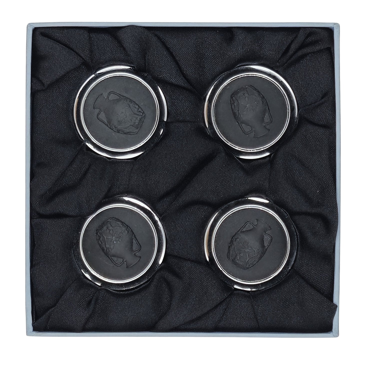 A set of four menu stands in stainless steel and black basalt.