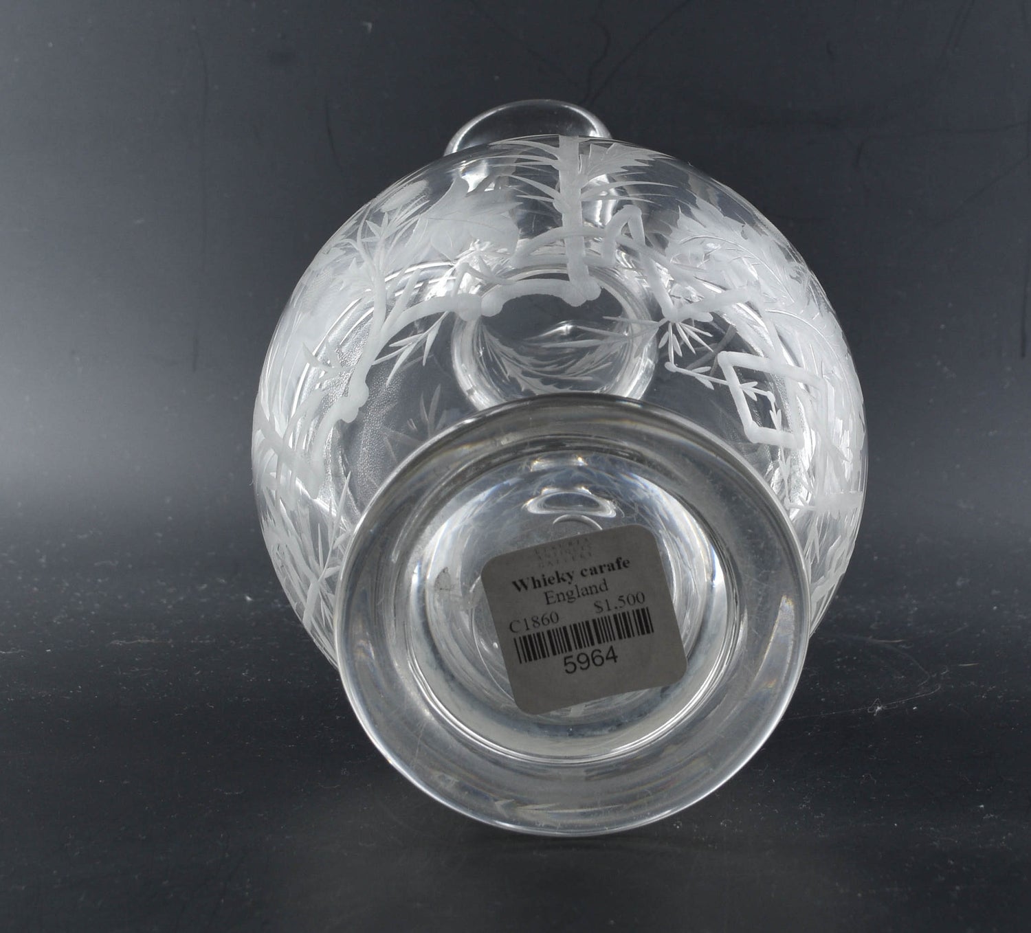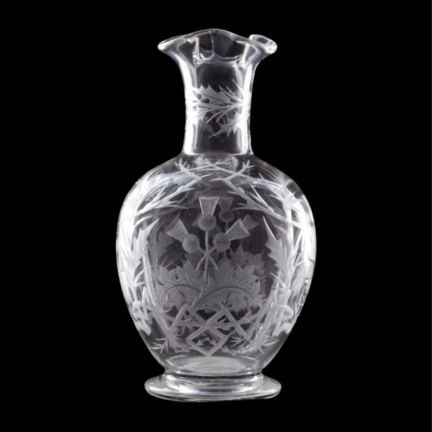 A Stourbridge glass whisky carafe, with wheel-cut decorated of thistles and briars. As it has (and had) no stopper, probably intended for for serving water with whisky.