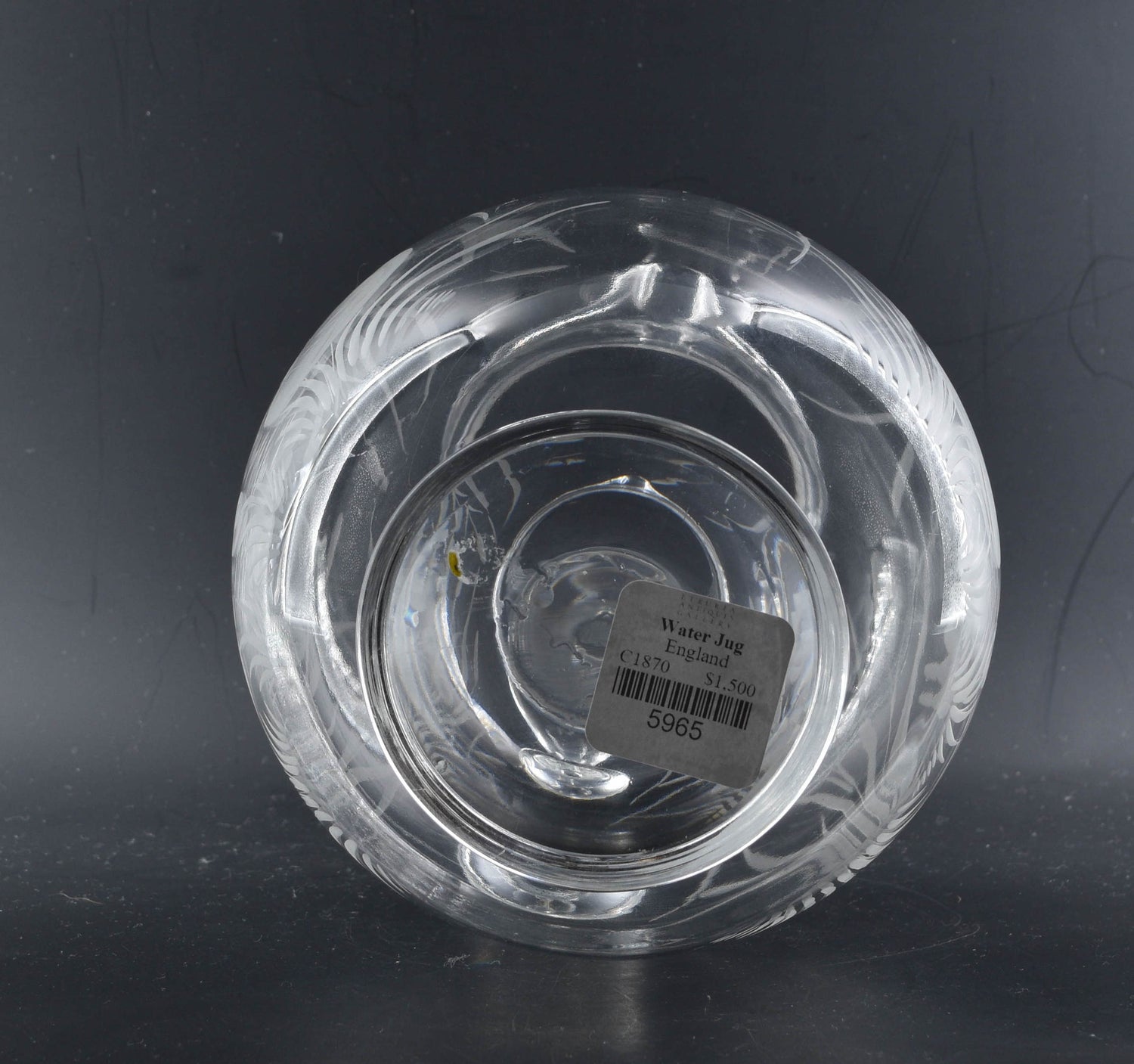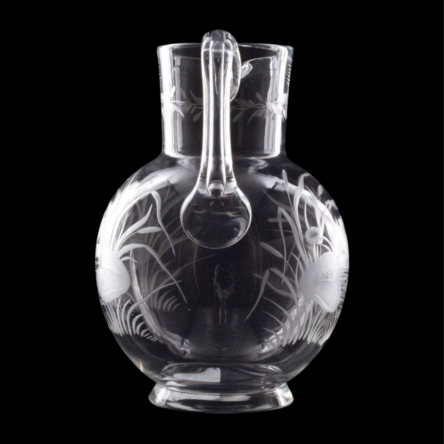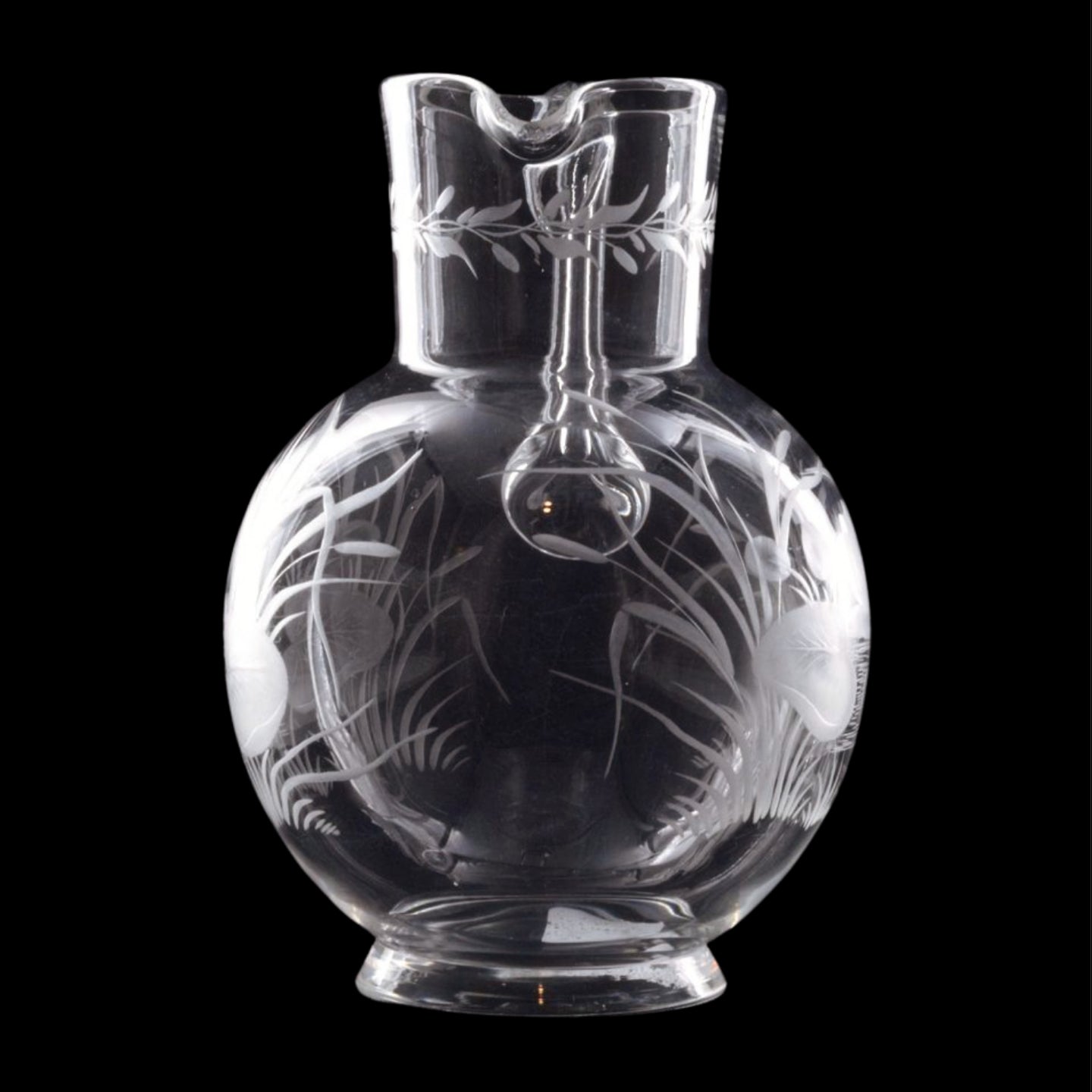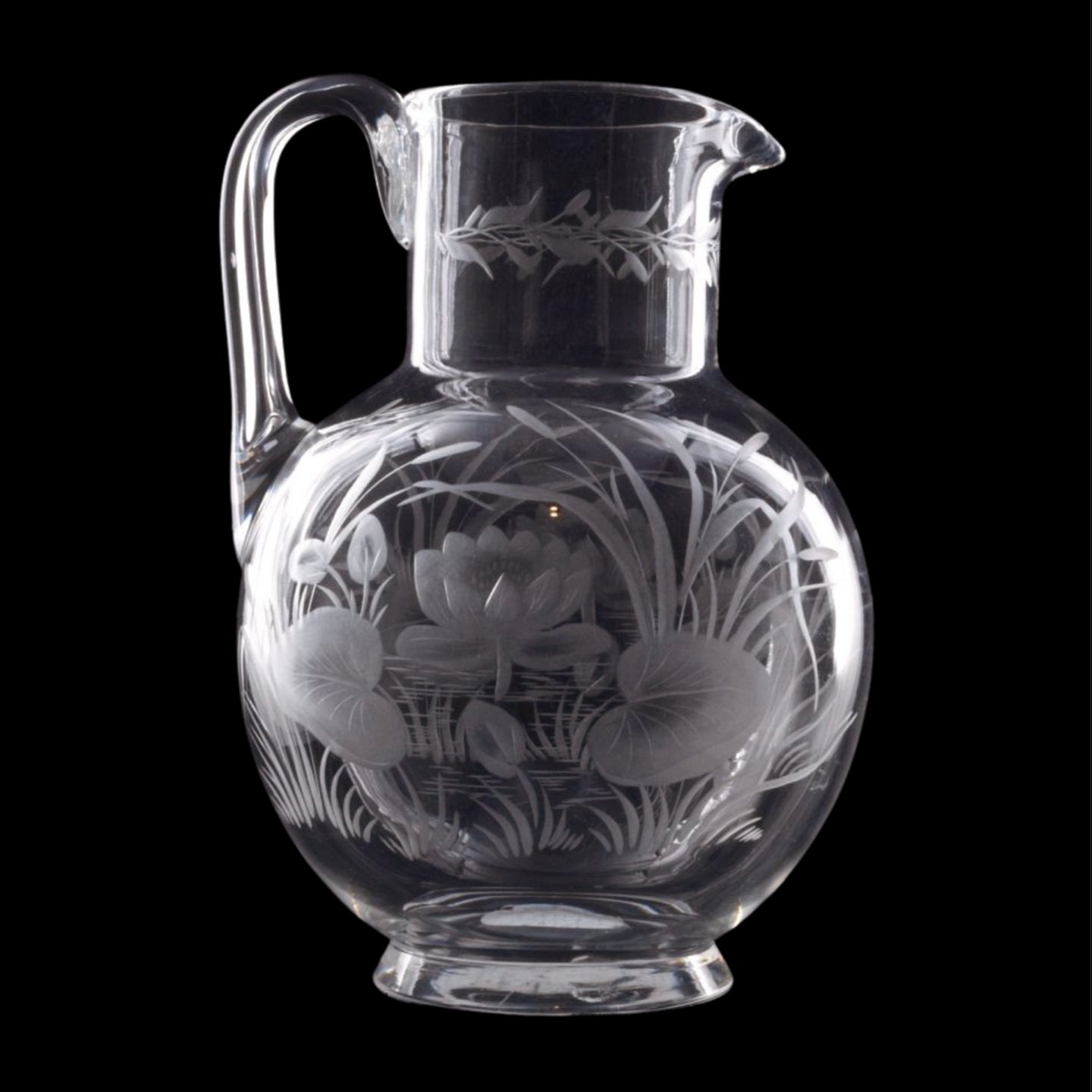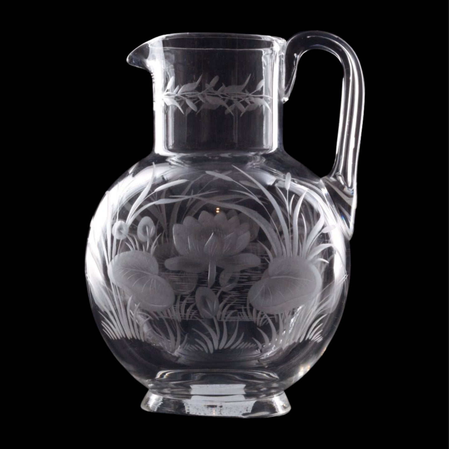 A Stourbridge glass water jug, with wheel-cut engraving of lillies and other water plants. The feeling of of early Art Nouveau, but still with a basis in the Aesthetic movement.