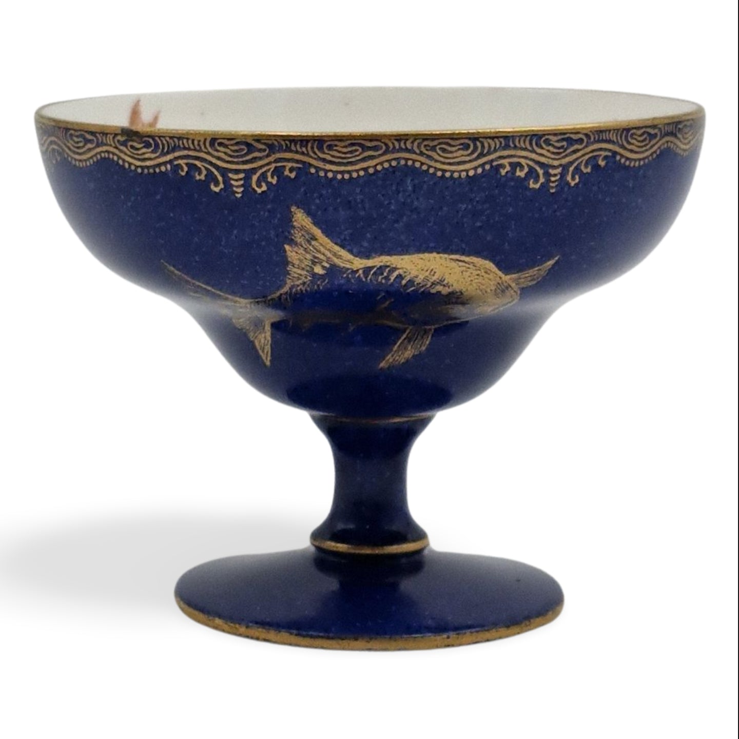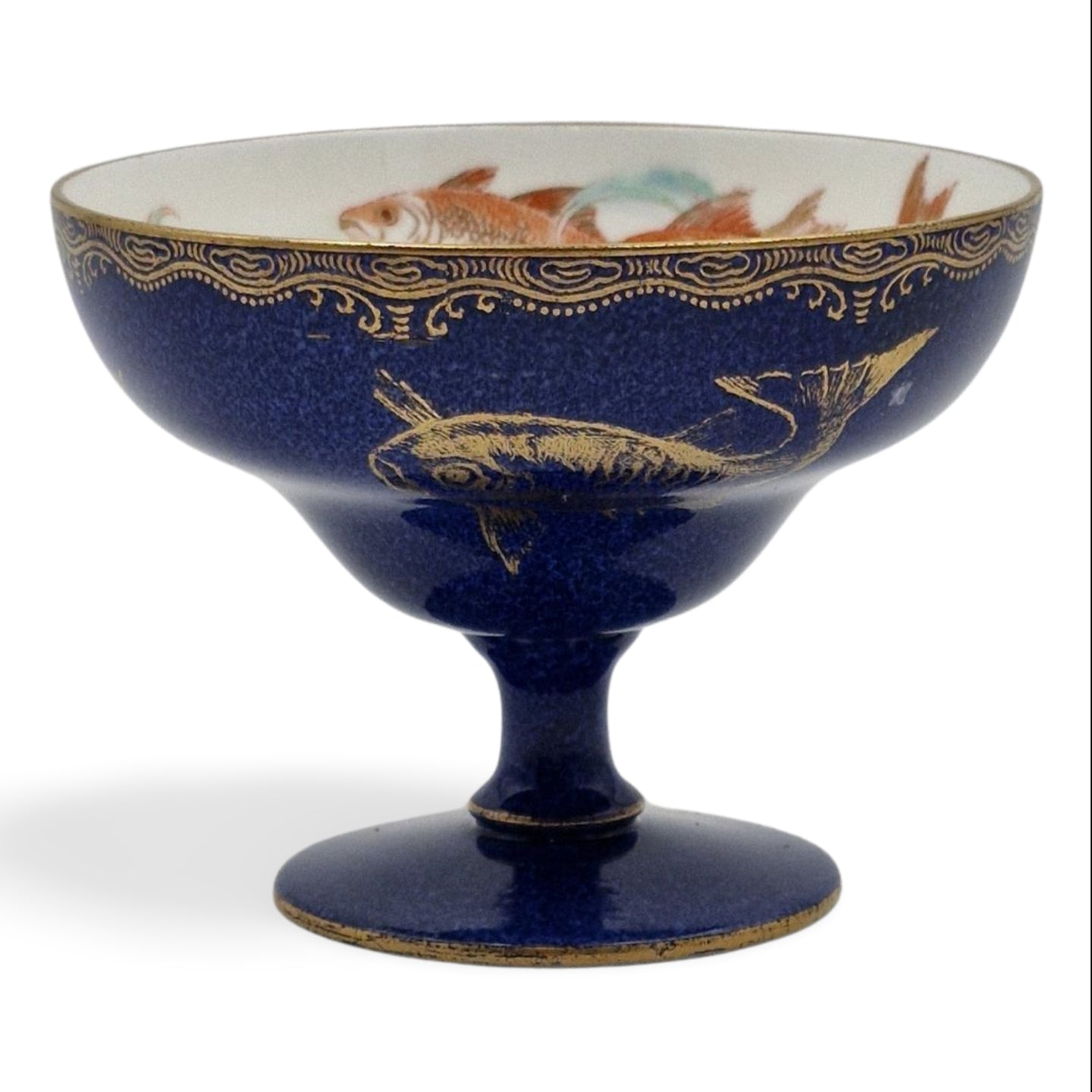 An unusal Melba cup with powder-blue exterior and polychrome fish to the interior. Made for James Powell & Sons' retail outlet in London.