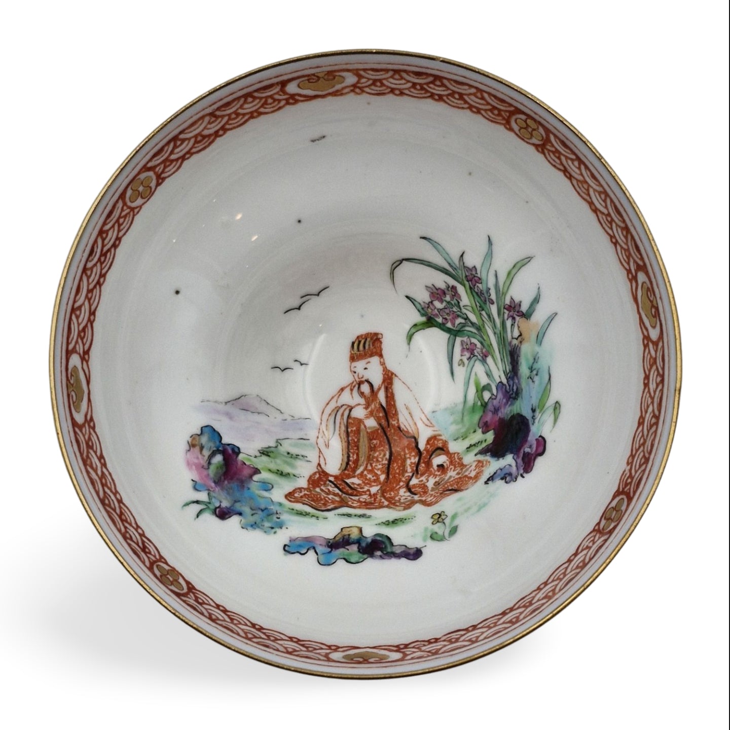 An unusal Melba cup with powder-blue exterior and a polychrome Chinaman in a garden to the interior. Made for James Powell & Sons' retail outlet in London.