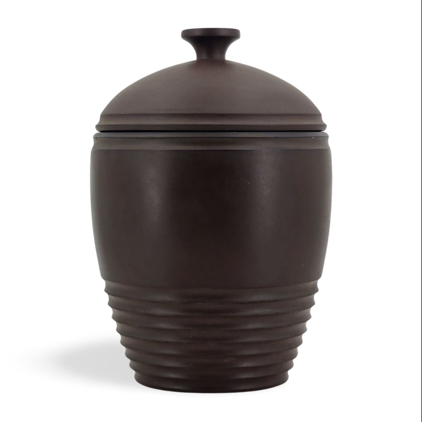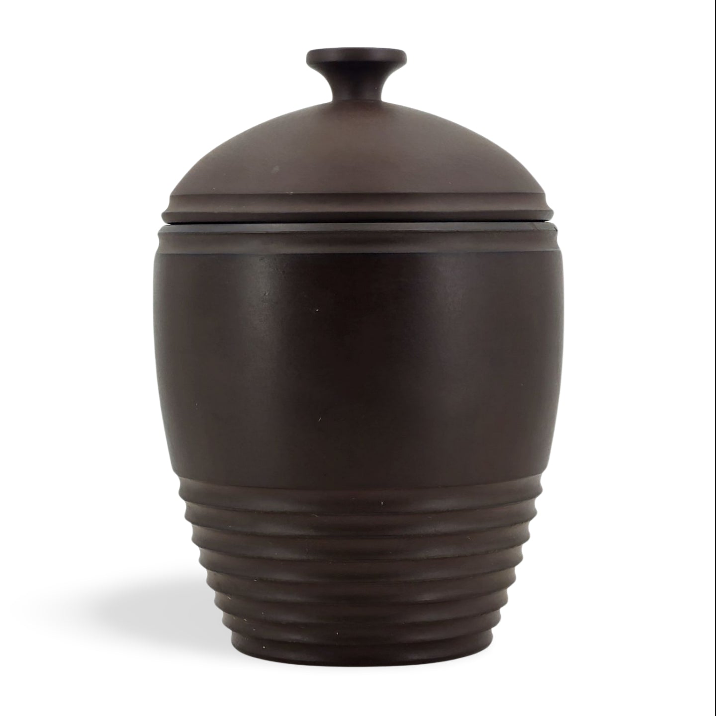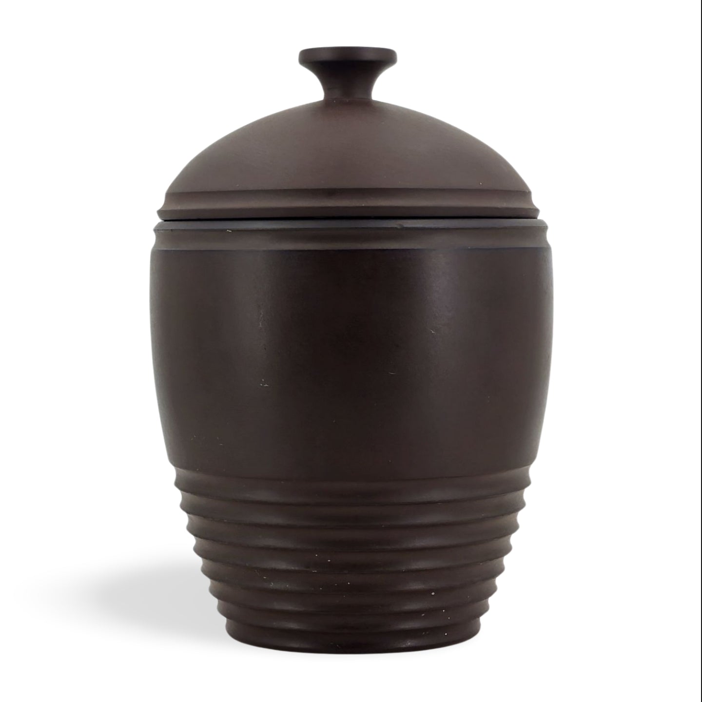 Tobacco jar in bronze basalt, designed by the New Zealand architect Keith Murray. A classic of Art Deco design.