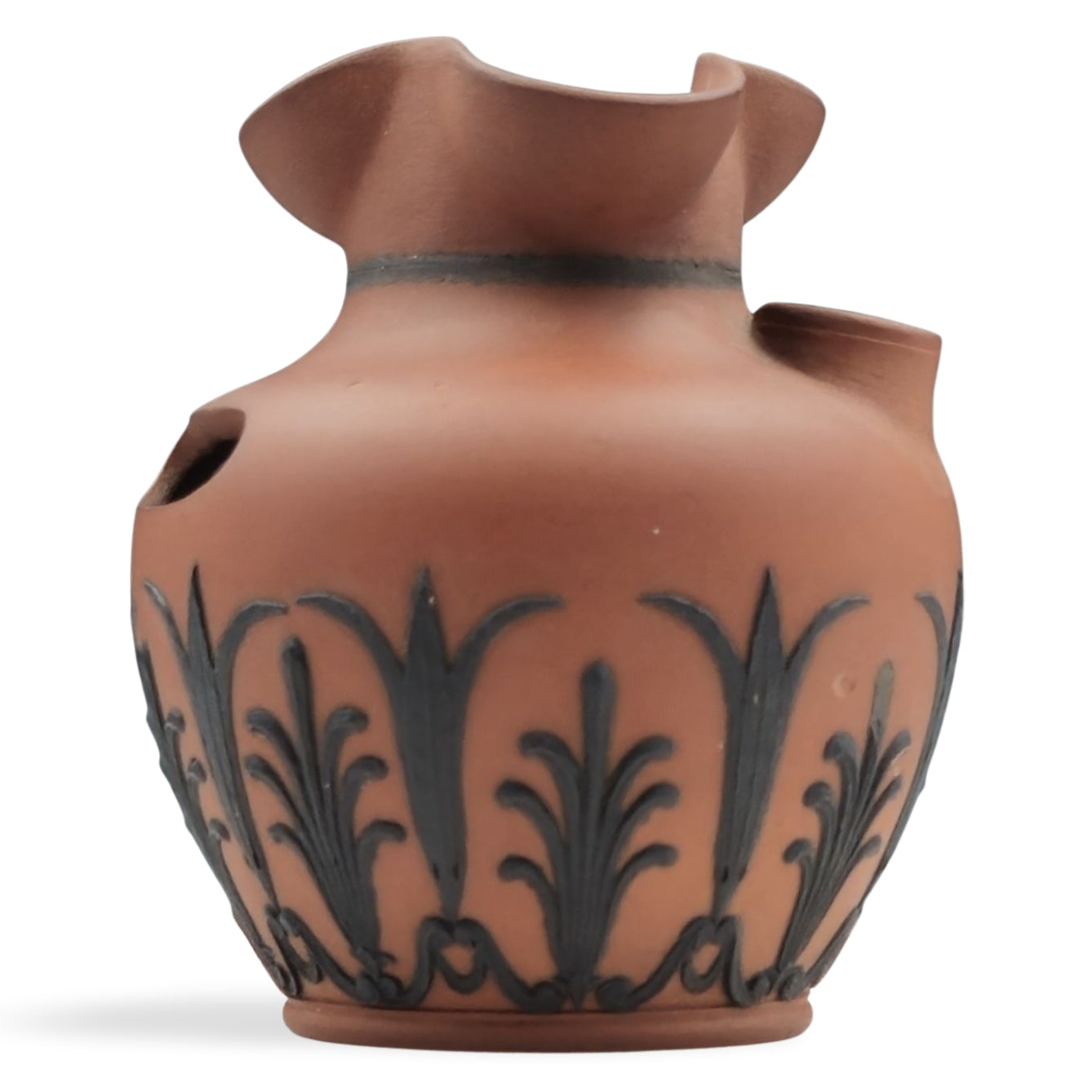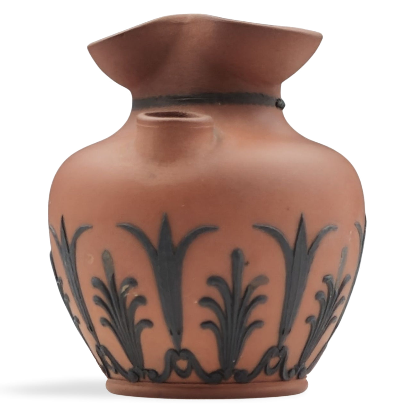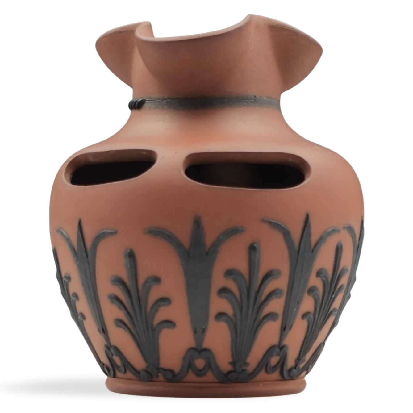 Vase in rosso with black decoration. It is intended for sulphur matches, a short-lived invention that was supplanted by the much safer phosphourous variety.
