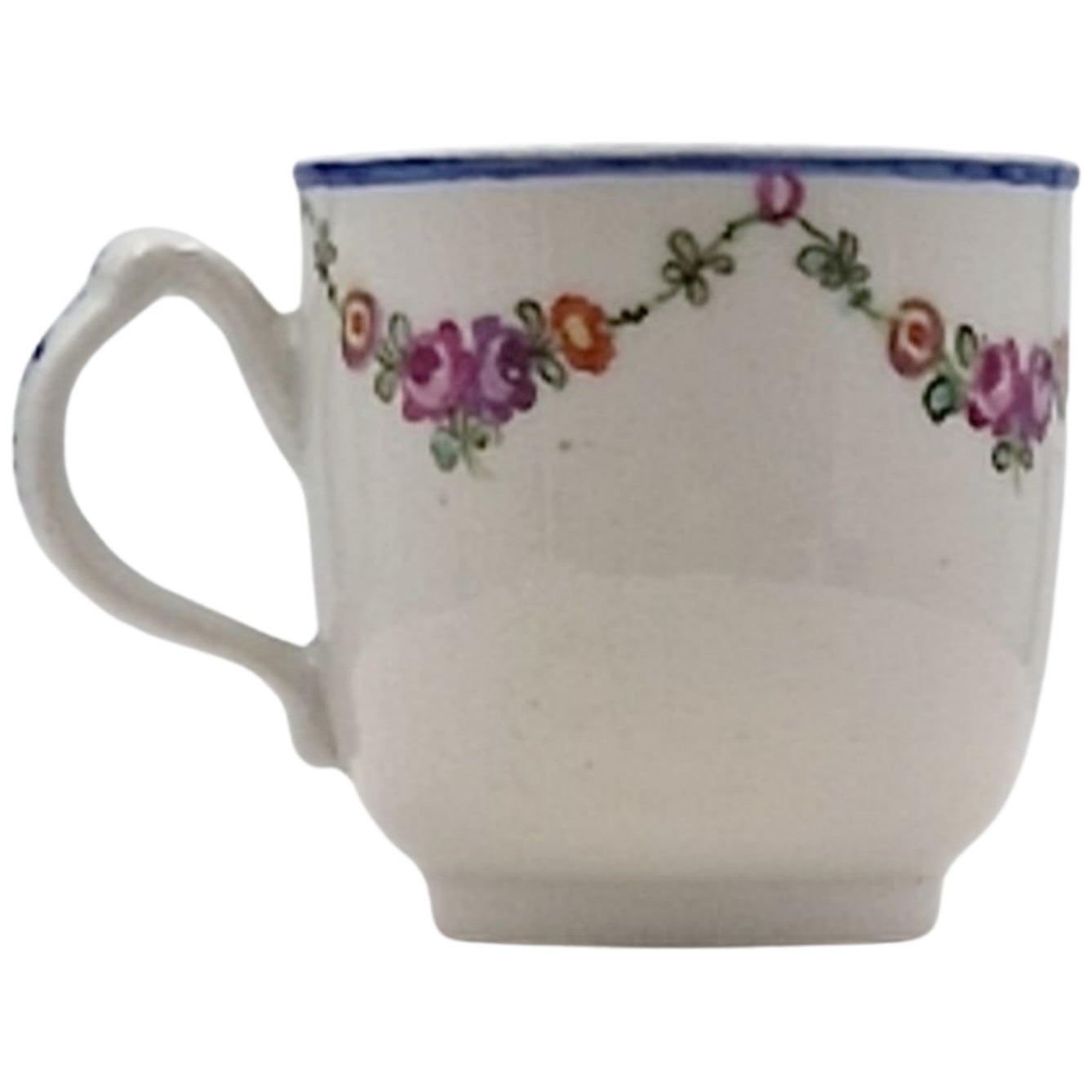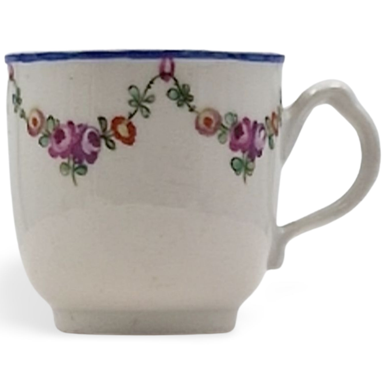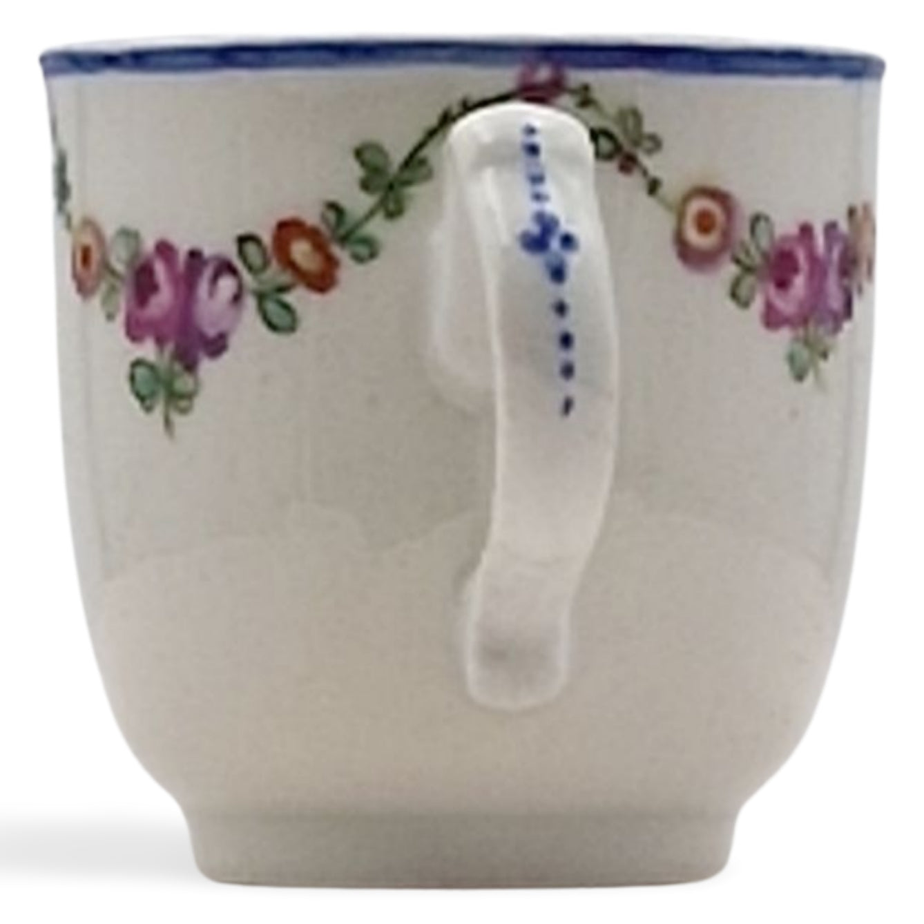 Coffee Cup with garlands of flowers and a distinctive blue rim.